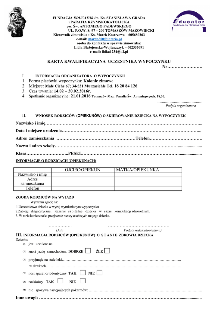 FUNDACJA EDUCATOR im. Ks. STANISŁAWA GRADA i PARAFIA RZYMSKOKATOLICKA pw. Św. ANTONIEGO PADEWSKIEGO UL. P.O.W. 8; 97 – 200 TOMASZÓW MAZOWIECKI Kierownik zimowiska : Ks. Marek Kostrzewa – 605680263 e-mail: [email protected] osoba do kontaktu w sprawie zimowiska: Lidia Błażejewska-Wojtaszczyk – 602335691 e-mail: [email protected] KARTA KWALIFIKACYJNA UCZESTNIKA WYPOCZYNKU Nr…………………… I. 1. 2. 3. 4. INFORMACJA ORGANIZATORA O WYPOCZYNKU Forma placówki wypoczynku: Kolonie zimowe Miejsce: Małe Ciche 67; 34-531 Murzasichle Tel. 18 20 84 126 Czas trwania: 14.02 – 20.02.2016r. Spotkanie organizacyjne: 21.01.2016 Tomaszów Maz. Parafia Św. Antoniego godz. 18,30. ......................................... Podpis organizatora II. WNIOSEK RODZICÓW (OPIEKUNÓW) O SKIEROWANIE DZIECKA NA WYPOCZYNEK Nazwisko i imię……………………………………………………………………………………………... Data i miejsce urodzenia…………………………………………………………………………………... Adres zamieszkania ………………………………………………Telefon……………………………… Nazwa i adres szkoły…………………………………………………………………………...................... Klasa………………………..PESEL…………………………………………………………..................... INFORMACJE O RODZICACH (OPIEKUNACH) OJCIEC/OPIEKUN Nazwisko i imię Adres zamieszkania Telefon MATKA/OPIEKUNKA ZGODA RODZICÓW NA WYJAZD Wyrażam zgodę na: 1.Uczestnictwo dziecka w wyżej wymienionym wypoczynku 2.Zabiegi diagnostyczne, leczenie szpitalne dziecka w razie komplikacji zdrowotnych. 3. W razie konieczności przejrzenie rzeczy osobistych mojego dziecka. ……………. …………………………………… Data Podpis rodzica(opiekuna) III. INFORMACJA RODZICÓW (OPIEKUNÓW) O S T A N I E ZDROWIA DZIECKA Dziecko: • jest uczulone na……………………………………………………………………………………………… • znosi jazdę samochodem. DOBRZE ŹLE • przyjmuje na stale leki…………………………………………………………………………………….. w dawkach………………………………………………………………………………………………… • nosi aparat ortodontyczny TAK • nosi okulary TAK NIE NIE • nie spożywa następujących pokarmów: ………………………………………………………………………………… Inne uwagi: …………………………………………………………………………………….................... Stwierdzam, że podałam (em) wszystkie, znane mi informacje o dziecku, które mogą pomóc w zapewnieniu właściwej opieki w czasie pobytu dziecka w placówce wypoczynku. ……………. …………………………………… Data Podpis rodzica(opiekuna) IV. INFORMACJE O SZCZEPIENIACH 1. 2. 3. Szczepienia ochronne (podać rok); tężec…………. błonica……… dur……………..inne…………………………………………………………………. Wzrost…………………….waga……………………………………………………... Stan czystości skóry………………..włosów…………………………………………. ……………. Data …………………………………… pieczęć Podpis pielęgniarki V. INFORMACJA O DZIECKU WYCHOWAWCY KLASY (w przypadku braku możliwości uzyskania opinii wychowawcy klasy - wypełnia rodzic lub opiekun) ……………………………………………………………………………………………………………… ………………………………..……………………………………………………………………….......... ……………………………………………………………………………………………………………… ……………. …………………………………… Data Podpis wychowawcy klasy VI. DECYZJA O KWALIFIKACJI UCZESTNIKA - OPINIA LEKARZA Postanawia się: 1. Zakwalifikować i skierować dziecko na wypoczynek 2. Odmówić skierowania dziecka na wypoczynek ze względu:……………………………… 3. ……………. …………………………………… Data pieczęć VII. POTWIERDZENIE POBYTU DZIECKA NA WYPOCZYNKU Podpis lekarza Dziecko przebywało na Koloniach letnich w dniach 14.02 – 20.02.2016r.roku. ……………. …………………………………… Data Podpis kierownika wypoczynku VIII. INFORMACJA O STANIE ZDROWIA (dane o zachorowaniach, urazach, leczeniu itp.). DZIECKA W CZASIE TRWANIA WYPOCZYNKU ………………………………………………………………………..…………………………................... ………………………………………………………………………..…………………………................... ………………………………………………………………………..…………………………................... Organizator informuje rodziców o leczeniu ambulatoryjnym lub hospitalizacji dziecka ……………. ……………………………………............................... Data i miejscowość Podpis lekarza lub pielęgniarki sprawującej opiekę medyczną podczas wypoczynku IX. UWAGI I SPOSTRZERZENIA WYCHOWAWCY- INSTRUKTORA O DZIECKU PODCZAS TRWANIA WYPOCZYNKU. ………………………………………………………………………............................................................. ………………………………………………………………………............................................................. ……………………………………………………......................................................................................... ……………. …………