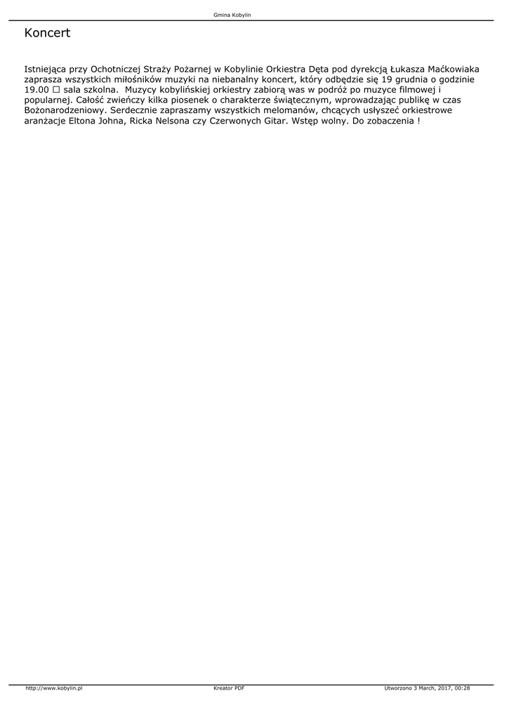 Gmina Kobylin Koncert Istniejąca przy Ochotniczej Straży Pożarnej w Kobylinie Orkiestra Dęta pod dyrekcją Łukasza Maćkowiaka zaprasza wszystkich miłośników muzyki na niebanalny koncert, który odbędzie się 19 grudnia o godzinie 19.00 sala szkolna. Muzycy kobylińskiej orkiestry zabiorą was w podróż po muzyce filmowej i popularnej. Całość zwieńczy kilka piosenek o charakterze świątecznym, wprowadzając publikę w czas Bożonarodzeniowy. Serdecznie zapraszamy wszystkich melomanów, chcących usłyszeć orkiestrowe aranżacje Eltona Johna, Ricka Nelsona czy Czerwonych Gitar. Wstęp wolny. Do zobaczenia ! http://www.kobylin.pl Kreator PDF Utworzono 3 March, 2017, 00:28