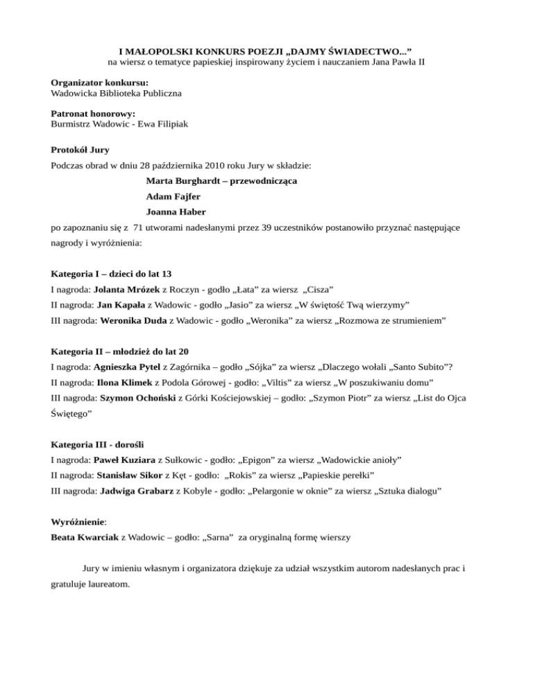 I MAŁOPOLSKI KONKURS POEZJI „DAJMY ŚWIADECTWO...” na wiersz o tematyce papieskiej inspirowany życiem i nauczaniem Jana Pawła II Organizator konkursu: Wadowicka Biblioteka Publiczna Patronat honorowy: Burmistrz Wadowic - Ewa Filipiak Protokół Jury Podczas obrad w dniu 28 października 2010 roku Jury w składzie: Marta Burghardt – przewodnicząca Adam Fajfer Joanna Haber po zapoznaniu się z 71 utworami nadesłanymi przez 39 uczestników postanowiło przyznać następujące nagrody i wyróżnienia: Kategoria I – dzieci do lat 13 I nagroda: Jolanta Mrózek z Roczyn - godło „Łata” za wiersz „Cisza” II nagroda: Jan Kapała z Wadowic - godło „Jasio” za wiersz „W świętość Twą wierzymy” III nagroda: Weronika Duda z Wadowic - godło „Weronika” za wiersz „Rozmowa ze strumieniem” Kategoria II – młodzież do lat 20 I nagroda: Agnieszka Pytel z Zagórnika – godło „Sójka” za wiersz „Dlaczego wołali „Santo Subito”? II nagroda: Ilona Klimek z Podola Górowej - godło: „Viltis” za wiersz „W poszukiwaniu domu” III nagroda: Szymon Ochoński z Górki Kościejowskiej – godło: „Szymon Piotr” za wiersz „List do Ojca Świętego” Kategoria III - dorośli I nagroda: Paweł Kuziara z Sułkowic - godło: „Epigon” za wiersz „Wadowickie anioły” II nagroda: Stanisław Sikor z Kęt - godło: „Rokis” za wiersz „Papieskie perełki” III nagroda: Jadwiga Grabarz z Kobyle - godło: „Pelargonie w oknie” za wiersz „Sztuka dialogu” Wyróżnienie: Beata Kwarciak z Wadowic – godło: „Sarna” za oryginalną formę wierszy Jury w imieniu własnym i organizatora dziękuje za udział wszystkim autorom nadesłanych prac i gratuluje laureatom.