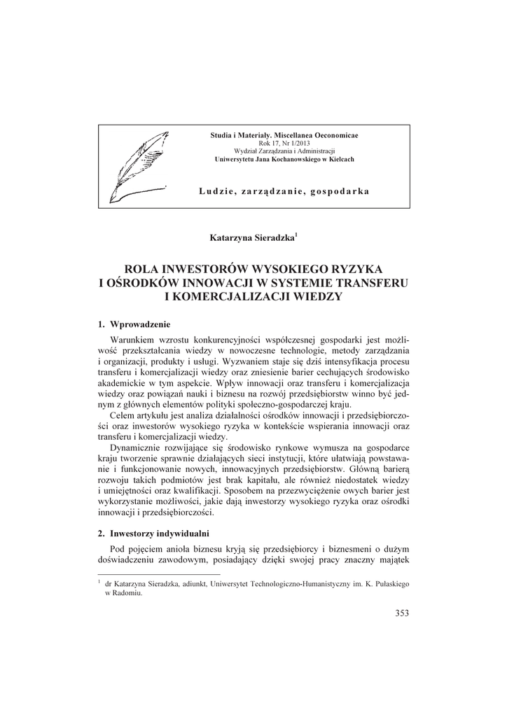 Studia i Materiały. Miscellanea Oeconomicae Rok 17, Nr 1/2013 Wydział Zarządzania i Administracji Uniwersytetu Jana Kochanowskiego w Kielcach Ludzie, zarządzanie, gospodarka Katarzyna Sieradzka1 ROLA INWESTORÓW WYSOKIEGO RYZYKA I OŚRODKÓW INNOWACJI W SYSTEMIE TRANSFERU I KOMERCJALIZACJI WIEDZY 1. Wprowadzenie Warunkiem wzrostu konkurencyjności współczesnej gospodarki jest możliwość przekształcania wiedzy w nowoczesne technologie, metody zarządzania i organizacji, produkty i usługi. Wyzwaniem staje się dziś intensyfikacja procesu transferu i komercjalizacji wiedzy oraz zniesienie barier cechujących środowisko akademickie w tym aspekcie. Wpływ innowacji oraz transferu i komercjalizacja wiedzy oraz powiązań nauki i biznesu na rozwój przedsiębiorstw winno być jednym z głównych elementów polityki społeczno-gospodarczej kraju. Celem artykułu jest analiza działalności ośrodków innowacji i przedsiębiorczości oraz inwestorów wysokiego ryzyka w kontekście wspierania innowacji oraz transferu i komercjalizacji wiedzy. Dynamicznie rozwijające się środowisko rynkowe wymusza na gospodarce kraju tworzenie sprawnie działających sieci instytucji, które ułatwiają powstawanie i funkcjonowanie nowych, innowacyjnych przedsiębiorstw. Główną barierą rozwoju takich podmiotów jest brak kapitału, ale również niedostatek wiedzy i umiejętności oraz kwalifikacji. Sposobem na przezwyciężenie owych barier jest wykorzystanie możliwości, jakie dają inwestorzy wysokiego ryzyka oraz ośrodki innowacji i przedsiębiorczości. 2. Inwestorzy indywidualni Pod pojęciem anioła biznesu kryją się przedsiębiorcy i biznesmeni o dużym doświadczeniu zawodowym, posiadający dzięki swojej pracy znaczny majątek 1 dr Katarzyna Sieradzka, adiunkt, Uniwersytet Technologiczno-Humanistyczny im. K. Pułaskiego w Radomiu. 353 osobisty, samodzielnie inwestujący zgromadzone przez siebie oszczędności na okres kilku lat w akcje lub udziały niepowiązanych z nimi osobiście małych i średnich przedsiębiorstw, nienotowanych na giełdzie, na ogół będących we wczesnym stadium rozwoju i wykazujących się dużym potencjałem wzrostu swojej wartości2. Rynek inwestorów indywidualnych cechuje się dużą różnorodnością - skłonnością do ryzyka, wysokością kapitału inwestycyjnego, motywami podejmowania inwestycji, doświadczeniami zawodowymi itp. Jednak pomimo tych rozbieżności dokonano klasyfikacji aniołów m.in. pod względem motywów działania. Wskazano na trzy podstawowe grupy: aniołów aktywnych (do których zalicza się: anioła przedsiębiorcę, anioła korporacyjnego, anioła poszukującego dochodu i anioła maksymalizującego bogactwo), uśpionych i początkujących3. Business angels to inwestorzy private equity, którzy najczęściej inwestują w przedsięwzięcia zazwyczaj znajdujące się w bardzo wczesnej fazie rozwoju. Nie ograniczają się oni w swoich decyzjach inwestycyjnych do jakiegokolwiek sektora, gdyż czynnikiem decydującym są projekty o dużym potencjale wzrostu. Wielkość inwestycji realizowanej przez indywidualnego inwestora w Europie wynosi przeciętnie 25-400 tysięcy euro, których horyzont inwestycyjny wynosi około 3-6 lat4. Aniołowie biznesu osobiście angażują się w działalność firmy, w którą zainwestowali, pełniąc najczęściej funkcję członka rady nadzorczej (przygotowywanie i monitorowanie strategii rozwoju, pozyskiwanie nowych inwestorów, rzadziej jest to współpraca w zakresie rozwoju produktu). O zaangażowaniu się business angels w dany projekt decyduje szereg czynników w tym zgodność oczekiwań inwestorów oferujących kapitał z celem projektu. Aniołowie biznesu interesują się projektami, które spełniają następujące przesłanki5: − będą realizowane przez wiarygodnego przedsiębiorcę, − podmiot będzie oferował taki produkty/usługi lub model biznesowy, który zapewni uzyskanie przewagi konkurencyjnej, zwiększając tym samym szanse na dynamiczny wzrost wartości projektu a zatem na zyski dla inwestora, − ustalona i pewna przewaga konkurencyjna nad rywalami, jaką powinien charakteryzować się projekt, − osiągnięcie zysków adekwatnych do czasu trwania inwestycji i ryzyka ponoszonego przez inwestora. Kolejną przesłanką jest dobór odpowiedniej formy, w jakiej funkcjonuje anioł biznesu. Może on funkcjonować, jako partner funduszu private equity, w sieci lub w formie syndykatu. Inwestorzy nieformalni (osoby fizyczne) tworzą spółki inwestycyjne, których celem jest sformalizowanie danego rodzaju inwestycji (projektu), przy uwzględnieniu aspektu planowania podatkowego w powiązaniu z celem 2 3 4 5 P. Tamowicz, Pomocna dłoń kapitału, PARP, Gdańsk 2007, s. 8. Szerzej zob., C.M. Mason, Informal sources of venture finance, University of Strathclyde, Glasgow 2005, s. 8. Business Angels w Europie – nieformalne inwestycje private equity, Private Equity Conulting 2004, nr 3, s. 2; www.private-equity.pl. P. Tamowicz, Business angels. Pomocna dłoń kapitału, Wyd. PARP, Gdańsk 2007, s. 8. 354 realizacji zysku w procesie realizacji inwestycji. Spółki te są likwidowane po zakończeniu inwestycji, przekształcane lub funkcjonują nadal i rozwijają się. Pojedynczy anioł pozyskuje status partnera w spółce, co daje możliwość wglądu w prowadzony biznes. Może on mieć wpływ na strategię i rozwój przedsięwzięcia, ale równie dobrze może pozostać jako anonimowy partner6. Syndykaty aniołów biznesu to porozumienia aniołów biznesu o porównywalnej wielkości, działających w tej samej branży i mających zbliżone cele. Są one tworzone w momencie, gdy jeden inwestor nie jest w stanie sfinansować całego projektu lub też nie chce być jedynym inwestorem7. Aniołowie Biznesu preferują branże, na których temat posiadają wiedzę zdobytą w wyniku własnych doświadczeń. Aniołowie biznesu angażują się w prowadzenie firmy, są inwestorem, który pełni fu