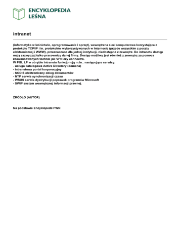 intranet (informatyka w leśnictwie, oprogramowanie i sprzęt), wewnętrzna sieć komputerowa korzystająca z protokołu TCP/IP i in. protokołów wykorzystywanych w Internecie (przede wszystkim z poczty elektronicznej i WWW), przeznaczona dla jednej instytucji, niedostępna z zewnątrz. Do intranetu dostęp mają zazwyczaj tylko pracownicy danej firmy. Dostęp możliwy jest również z zewnątrz za pomoca zaawansowanych technik jak VPN czy connectra. W PGL LP w obrębie intranetu funkcjonują m.in.. następujące serwisy: - usługa katalogowa Active Directory (domena) - intranetowy portal korporacyjny - SODiS elektroniczny obieg dokumentów - NTP serwis synchronizacji czasu - WSUS serwis dystrybucji poprawek programów Microsoft - SWIP system wewnętrznej informacji prawnej. ŹRÓDŁO (AUTOR) Na podstawie Encyklopedii PWN