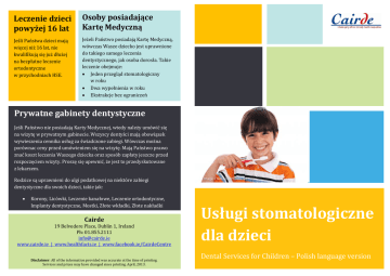 Leczenie dzieci powyżej 16 lat Osoby posiadające Kartę Medyczną Jeśli Państwa dzieci mają więcej niż 16 lat, nie kwalifikują się już dłużej na bezpłatne leczenie ortodontyczne w przychodniach HSE. Jeżeli Państwo posiadają Kartę Medyczną, wówczas Wasze dziecko jest uprawnione do takiego samego leczenia dentystycznego, jak osoba dorosła. Takie leczenie obejmuje: Jeden przegląd stomatologiczny w roku Dwa wypełnienia w roku Ekstrakcje bez ograniczeń Prywatne gabinety dentystyczne Jeśli Państwo nie posiadają Karty Medycznej, wtedy należy umówić się na wizytę w prywatnym gabinecie. Wszyscy dentyści mają obowiązek wywieszenia cennika usług za świadczone zabiegi. Wówczas można porównac ceny przed umówieniem się na wizytę. Mają Państwo prawo znać koszt leczenia Waszego dziecka oraz sposób zapłaty jeszcze przed rozpoczęciem wizyty. Proszę się upewnić, że jest to przedyskutowane z lekarzem. Rodzice są uprawnieni do ulgi podatkowej na niektóre zabiegi dentystyczne dla swoich dzieci, takie jak: Korony, Licówki, Leczenie kanałowe, Leczenie ortodontyczne, Implanty dentystyczne, Mostki, Złote wkładki, Złote nakładki Cairde 19 Belvedere Place, Dublin 1, Ireland Ph: 01.855.2111 [email protected] www.cairde.ie | www.healthfacts.ie | www.facebook.ie/CairdeCentre Disclaimer: All of the information provided was accurate at the time of printing. Services and prices may have changed since printing. April, 2013. Image: FreeDigitalPhotos.net Image: FreeDigitalPhotos.net Usługi stomatologiczne dla dzieci Dental Services for Children – Polish language version Jakie darmowe usługi stomatologiczne są dostępne dla mojego dziecka? Dzieci mieszkające w Irlandii i spełniające poniższe kryteria mają wiele możliwości dostępu do darmowych usług stomatologicznych. Te kryteria to: Dzieci poniżej 6. roku życia Dzieci uczęszczające do szkoły państwowej Dzieci osób posiadających kartę medyczną Dzieci poniżej 16. roku życia nie uczęszczające do szkoły państwowej Dzieci specjalnej troski Dzieci w Irlandii są uprawnione do bezpłatnych przeglądów i opieki stomatologicznej aż do ukończenia 16. roku życia. Dzieci przedszkolne mogą zostać skierowane na leczenie dentystyczne przez dziecięcą oraz szkolną opiekę zdrowotną. Irlandzkie państwowe szkoły podstawowe są objęte stomatologicznym programem badań przesiewowych, w ramach którego jest sprawdzane zdrowie jamy ustnej Państwa dziecka. Prywatne szkoły podstawowe mogą uzyskać dostęp do tej usługi kontaktując się z HSE – the Health Service Executive. Rodzice zostaną powiadomieni o terminie badań przez szkołę. Szkolny program badań przesiewowych Dziecko potrzebuje natychmiastowego leczenia... W ramach tego programu każdego roku dentyści wizytują szkoły podstawowe, by przebadać dzieci w drugiej, czwartej i szóstej klasie. Uczniowie zostają poddani badaniu, w którym określa się, jak szybko potrzebne jest specjalistyczne leczenie. Nastepnie dziecko jest skierowane do lokalnej przychodni stomatologicznej HSE. Leczenie w nagłych wypadkach jest dostępne dla wszystkich dzieci poniżej 16 roku życia w każdej przychodni HSE bez potrzeby wcześniejszego umówienia wizyty. Aby być szybko przyjętym, najlepiej jest odwiedzić przychodnię rano, zanim rozpoczną się umówione wizyty. Wizyta w przychodni HSE Leczenie oferowane w przychodniach HSE Podczas pierwszej wizyty dziecko bedzie miało pełny przegląd stomatologiczny w celu określenia, jakiego rodzaju leczenie jest potrzebne. W przychodni, Państwa dziecko może także mieć spotkanie z higienistką dentystyczną, która nauczy je właściwych nawyków pielęgnacji jamy ustnej, np. jak prawidłowo czyścić zęby szczoteczką oraz jak używać nici dentystycznej. Bardziej powszechne rodzaje leczenia to wypełnienia oraz ekstrakcje. Przychodnie HSE oferują także zapobiegawcze leczenie takie jak uszczelnianie bruzd. Uszczelniacze bruzd są wykonane z plastikowego materiału i przyczepiane są do powierzchni żucia tylnych zębów dziecka. Pomagają zapobiegać próchnicy wypełniając głębokie rowki w zębach dziecka, więc resztki pokarmu nie będą tam zalegać. Uszczelniacze bruzd są zazwyczaj przepisywane dzieciom po badaniu kontrolnym w drugiej klasie. Moje dziecko potrzebuje aparatu ortodontycznego Aparaty ortodontyczne nie są obecnie refundowane w ramach karty medycznej. Jedyną możliwością uzyskania bezpłatnie aparatu ortodontycznego jest Szkolny Program Stomatologicznych Badań Przesiewowych. Dzieci zazwyczaj są badane pod kątem zapotrzebowania na aparat w szóstej klasie. Jeśli dentysta uzna, że dziecko potrzebuje aparatu, wówczas zostanie ono skierowane do lokalnej przychodni ortodontycznej HSE. Dzieci są poddane leczeniu w zależności od tego, jak pilnie potrzebują aparatu. Oczekiwanie na leczenie ortodontyczne może trwać nawet do 2 lat. . Przychodnie stomatologiczne HSE Aktualna lista przychodni HSE wraz z ich lokalizacją na mapie jest dostępna na stronie HSE: www.hse.ie. Dzwoniąc na Infolinię HSE pod nr 01 850 24 1850 uzyskajᶏ Państwo informację o przychodni najbliższej Waszego miejsca zamieszkania.