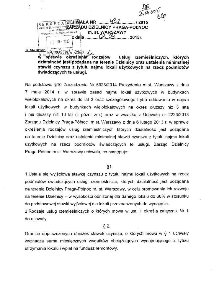 iPBB^AŁA NR / 2015 SgN w Dzielnicy PraMttZADU DZIELNICY PRAGA-POŁNOC f ę f Warszawy * S j u l . Jagiellońska 23 | W w s m . S t. WARSZAWY r |z dnlia 2015r ! fi Pi -0!r 2815 | 1 w zśprawie określepj#^ rodzajów usług rzemieślniczych, których :: d2ilrtitriość::j@8t p^ąklaria na terenie Dzielnicy oraz ustalenia minimalnej stawki czynszu z tytułu najmu lokali użytkowych na rzecz podmiotów świadczących te usługi. Na podstawie §10 Zarządzenia Nr 5923/2014 Prezydenta m.st. Warszawy z dnia 7 maja 2014 r. w sprawie zasad najmu lokali użytkowych w budynkach wielolokalowych na okres do lat 3 oraz szczegółowego trybu oddawania w najem lokali użytkowych w budynkach wielolokalowych na okres dłuższy niż 3 lata i nie dłuższy niż 10 lat (z późn. zm.) oraz w związku z Uchwałą nr 2223/2013 Zarządu Dzielnicy Praga-Północ m.st. Warszawy z dnia 6 lutego 2013 r. w sprawie określenia rodzajów usług rzemieślniczych których działalność jest pożądana na terenie Dzielnicy oraz ustalenia minimalnej stawki czynszu z tytułu najmu lokali użytkowych na rzecz podmiotów świadczących te usługi, Zarząd Dzielnicy Praga-Północ m.st. Warszawy uchwala, co następuje: §11.Ustala się wyjściową stawkę czynszu z tytułu najmu lokali użytkowych na rzecz podmiotów świadczących usługi rzemieślnicze, których działalność jest pożądana na terenie Dzielnicy Praga-Północ m. st. Warszawy, w celu promowania ich rozwoju na terenie Dzielnicy - w wysokości obniżonej dla danego lokalu do 60% w stosunku do podstawowej stawki wyjściowej dla lokali przeznaczonych do wynajęcia. 2.Rodzaje usług rzemieślniczych o których mowa w ust. 1 określa załącznik Nr 1 do uchwały. §2Granice dopuszczonych obniżek stawek czynszu, o których mowa w § 1 uchwały wyznacza suma miesięcznych wydatków obciążających wynajmującego z tytułu utrzymania lokalu i wpłat na fundusz remontowy. Uzasadnienie do Uchwały nr /2015 Zarządu Dzielnicy Praga-Północ m. st. Warszawy z dnia 2015r. w sprawie: w sprawie określenia rodzajów usług rzemieślniczych, których działalność jest pożądana na terenie Dzielnicy oraz ustalenia minimalnej stawki czynszu z tytułu najmu lokali użytkowych na rzecz podmiotów świadczących te usługi. Zgodnie z § 2 ust. 1. Zarządzenia Nr 5923/2014 Prezydenta Miasta Stołecznego Warszawy z dnia 7 maja 2014 r. w sprawie zasad najmu lokali użytkowych w budynkach wielolokalowych na okres do 3 lat oraz szczegółowego trybu oddawania w najem lokali użytkowych w budynkach wielolokalowych na okres dłuższy niż 3 lata i nie dłuższy niż 10 lat (z późniejszymi zmianami) ustalenia, co do przeznaczenia do najmu lokali użytkowych podejmuje Zarząd Dzielnicy, kierując się zasadą racjonalnego gospodarowania zasobem lokali m. st. Warszawy na terenie Dzielnicy. Zgodnie z § 10 Zarządzenia Nr 5923/2014 Prezydenta m.st. Warszawy z dnia 14 maja 2014 r. w sprawie zasad najmu lokali użytkowych w budynkach wielolokalowych na okres do lat 3 oraz szczegółowego trybu oddawania w najem lokali użytkowych w budynkach wielolokalowych na okres dłuższy niż 3 lata został przyjęty wykaz pożądanych usług rzemieślniczych w tym usług unikatowych i zanikających w Dzielnicy Praga-Północ, oraz zostały określone minimalne stawki czynszu najmu lokali użytkowych na rzecz podmiotów świadczących te usługi. Załącznik Nr 1 do Uchwały N r . . . Z a r z ą d u Dzielnicy Praga - Północ z dnia Wykaz pożądanych usług rzemieślniczych i zanikających w Dzielnicy Praga-Północ tj: 1 2 3 4 5 6 7 8 9 10 11 12 13 14 15 16 17 18 19 20 21 22 23 24 25 26 27 28 29 w tym usług unikatowych bieliźniarstwo/gorseciarstwo; brązownictwo; ceramika artystyczna; cholewkarstwo; cukiernictwo własne z tradycją grawerstwo (ręczne rycie i cyzelowanie w metalu); introligatorstwo; kapelusznictwo-czapnictwo; kaletnictwo; kowalstwo artystyczne; krawiectwo; kuśnierstwo; maglowanie bielizny; naprawa maszyn do szycia ramiarstwo (naprawa obrazów, luster); renowacja antyków; repasacja i artystyczne cerowanie rymarstwo; stolarstwo artystyczne; szewstwo; szklarstwo; sztukatorstwo; ślusarstwo; tapicerstwo; usługi antykwaryczne; witrażownictwo; zegarmistrzostwo; złotnictwo (rzemiosło artystyczne zajmujące się wytwarzaniem wyrobów ze złota, platyny, srebra, stopów, metali szlachetnych, kamieni szlachetnych) inne unikatowe usługi rzemieślnicze po akceptacji Zarządu Dzielnicy .