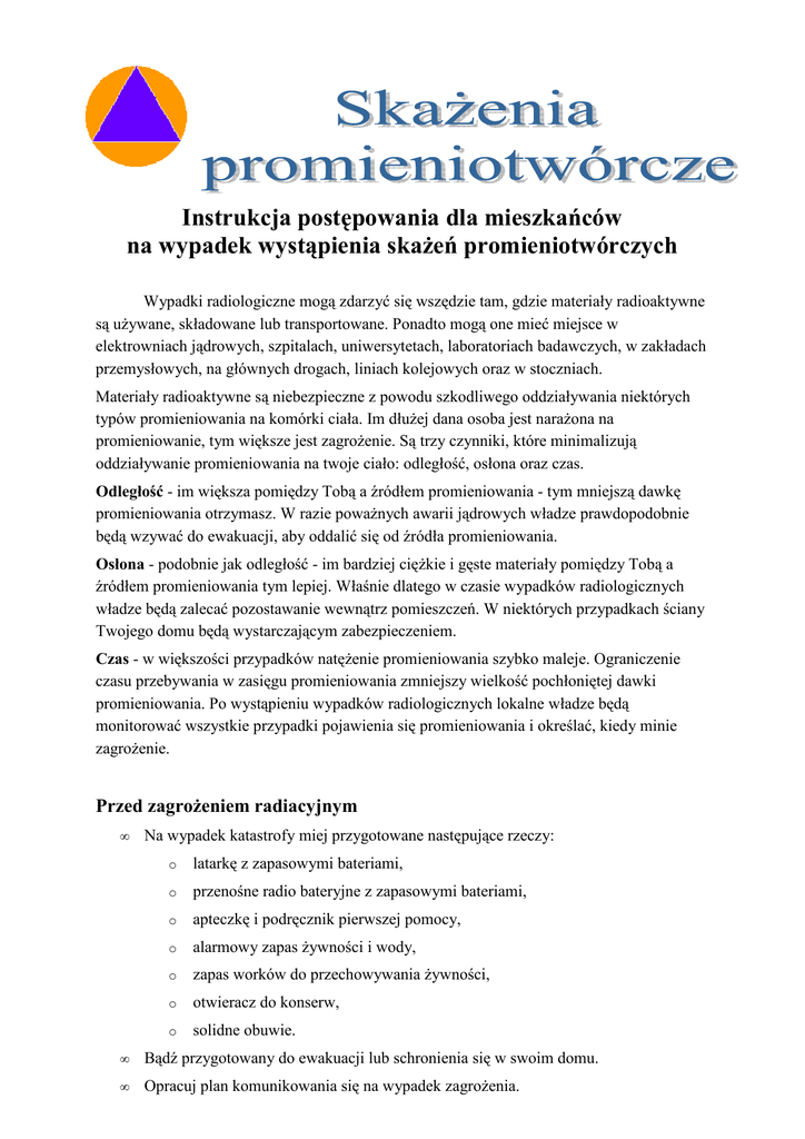 Instrukcja postępowania dla mieszkańców na wypadek wystąpienia skaŜeń promieniotwórczych Wypadki radiologiczne mogą zdarzyć się wszędzie tam, gdzie materiały radioaktywne są uŜywane, składowane lub transportowane. Ponadto mogą one mieć miejsce w elektrowniach jądrowych, szpitalach, uniwersytetach, laboratoriach badawczych, w zakładach przemysłowych, na głównych drogach, liniach kolejowych oraz w stoczniach. Materiały radioaktywne są niebezpieczne z powodu szkodliwego oddziaływania niektórych typów promieniowania na komórki ciała. Im dłuŜej dana osoba jest naraŜona na promieniowanie, tym większe jest zagroŜenie. Są trzy czynniki, które minimalizują oddziaływanie promieniowania na twoje ciało: odległość, osłona oraz czas. Odległość - im większa pomiędzy Tobą a źródłem promieniowania - tym mniejszą dawkę promieniowania otrzymasz. W razie powaŜnych awarii jądrowych władze prawdopodobnie będą wzywać do ewakuacji, aby oddalić się od źródła promieniowania. Osłona - podobnie jak odległość - im bardziej cięŜkie i gęste materiały pomiędzy Tobą a źródłem promieniowania tym lepiej. Właśnie dlatego w czasie wypadków radiologicznych władze będą zalecać pozostawanie wewnątrz pomieszczeń. W niektórych przypadkach ściany Twojego domu będą wystarczającym zabezpieczeniem. Czas - w większości przypadków natęŜenie promieniowania szybko maleje. Ograniczenie czasu przebywania w zasięgu promieniowania zmniejszy wielkość pochłoniętej dawki promieniowania. Po wystąpieniu wypadków radiologicznych lokalne władze będą monitorować wszystkie przypadki pojawienia się promieniowania i określać, kiedy minie zagroŜenie. Przed zagroŜeniem radiacyjnym • Na wypadek katastrofy miej przygotowane następujące rzeczy: o latarkę z zapasowymi bateriami, o przenośne radio bateryjne z zapasowymi bateriami, o apteczkę i podręcznik pierwszej pomocy, o alarmowy zapas Ŝywności i wody, o zapas worków do przechowywania Ŝywności, o otwieracz do konserw, o solidne obuwie. • Bądź przygotowany do ewakuacji lub schronienia się w swoim domu. • Opracuj plan komunikowania się na wypadek zagroŜenia. • Przygotuj plan oraz sposoby powrotu do domu członków rodziny, jeŜeliw czasie wystąpienia zagroŜenia są rozdzieleni (realna moŜliwość w ciągu dnia, gdy dorośli są w pracy, a dzieci w szkole). • Poproś krewnych lub znajomych, zamieszkałych w innych miejscowościach, aby słuŜyli jako miejsce kontaktu dla Twojej rodziny. Upewnij się, czy wszyscy członkowie Twojej rodziny znają nazwisko, adres i nr telefonu osoby kontaktowej. • Jeśli prowadzisz samodzielne gospodarstwo rolne, zastanów się nad zabezpieczeniem paszy dla zwierząt hodowlanych, ujęć wody pitnej oraz pomieszczeń dla nich. W czasie zagroŜenia radiacyjnego • Zachowaj spokój: o nie kaŜdy wypadek związany z wydostaniem się substancji promieniotwórczej jest dla Ciebie niebezpieczny; o wypadek moŜe dotyczyć tylko terenu zakładu (elektrowni atomowej) i moŜe nie powodować Ŝadnych zagroŜeń zewnętrznych. • UwaŜnie i stale słuchaj radia, oglądaj telewizję ogólnokrajową lub lokalną. Komunikaty określą charakter wypadku, stopień zagroŜenia oraz jego zasięg i szybkość rozprzestrzeniania się - wykonaj zalecenia wynikające z komunikatów. • Gdy powracasz do miejsca schronienia z zewnątrz: • o weź prysznic, zmień buty i odzieŜ; o schowaj do plastikowej torby rzeczy noszone na zewnątrz i szczelnie je zamknij. Jeśli otrzymasz polecenie ewakuacji, wykonuj je niezwłocznie, według zaleceń władz (słuŜb ratowniczych): o nasłuchuj w radiu i telewizji komunikatów o drogach ewakuacji, tymczasowych schronach i sposobach postępowania; o zabierz przygotowane na ewakuację rzeczy. • Pamiętaj o swoich sąsiadach, którzy mogą potrzebować specjalnej pomocy przy małych dzieciach, starszych lub niepełnosprawnych osobach. • W wypadku zaniechania ewakuacji, pozostań w domu: o zabezpiecz i pozamykaj okna i drzwi; o wyłącz klimatyzację, wentylację, ogrzewanie nawiewowe itp.; o miej przy sobie cały czas włączone radio bateryjne; o zamknij (uszczelnij) zasuwy piecowe i kominowe; o udaj się do piwnicy lub innych pomieszczeń poniŜej powierzchni gruntu; o pozostań wewnątrz pomieszczeń do czasu, aŜ władze (słuŜby ratownicze) ogłoszą, Ŝe jest bezpiecznie; o jeśli musisz wyjść na zewnątrz, zakryj usta i nos mokrym ręcznikiem. • Bądź przygotowany do ewakuacji lub schronienia się na dłuŜszy czas w domu. • Ukryj inwentarz i nakarm go przechowaną w zamknięciu paszą. • Nie uŜywaj telefonu, jeśli nie jest to konieczne. Linie telefoniczne są niezbędne dla akcji ratowniczej. • • Przechowuj Ŝywność w szczelnych pojemnikach lub lodówce: o niezabezpieczoną Ŝywność przed schowaniem dokładnie opłucz; o zrezygnuj ze spoŜywania owoców, warzyw i wody z niepewnych źródeł. Dalej postępuj zgodnie z zaleceniami określonymi przez władze (słuŜby ratownicze) do czasu odwołania zagroŜenia skaŜeniem promieniotwórczym. Po odwołaniu zagroŜenia radiacyjnego • Opuść ukrycie i w razie • najmniejszych podejrzeń o skaŜeniu poddaj siebie i rodzinę zabiegom sanitarnym. • Unikaj spoŜywania Ŝywności z Twojego ogrodu oraz mleka od Twoich krów i kóz, dopóki nie będą zbadane przez lokalny urząd sanitarny. • W przypadku zarządzenia ewakuacji zabierz ze sobą najcenniejsze rzeczy, odzieŜ, dokumenty i produkty Ŝywnościowe. Zabezpiecz mieszkanie.