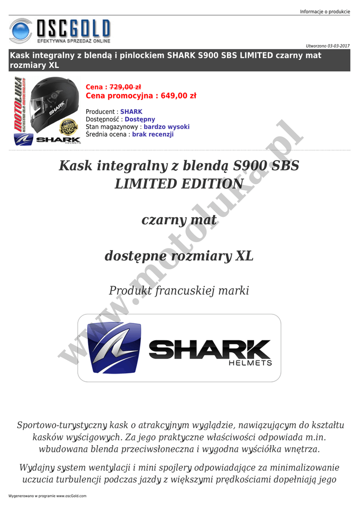 Informacje o produkcie Utworzono 03-03-2017 Kask integralny z blendą i pinlockiem SHARK S900 SBS LIMITED czarny mat rozmiary XL Cena : 729,00 zł Producent : SHARK Dostępność : Dostępny Stan magazynowy : bardzo wysoki Średnia ocena : brak recenzji a. pl Cena promocyjna : 649,00 zł uk Kask integralny z blendą S900 SBS LIMITED EDITION ot ol czarny mat .m dostępne rozmiary XL w w w Produkt francuskiej marki Sportowo-turystyczny kask o atrakcyjnym wyglądzie, nawiązującym do kształtu kasków wyścigowych. Za jego praktyczne właściwości odpowiada m.in. wbudowana blenda przeciwsłoneczna i wygodna wyściółka wnętrza. Wydajny system wentylacji i mini spojlery odpowiadające za minimalizowanie uczucia turbulencji podczas jazdy z większymi prędkościami dopełniają jego Wygenerowano w programie www.oscGold.com wartości użytkowych. w w w .m ot ol uk a. pl Skorupa - wykonana techniką wtryskiwanego materiału termoplastycznego; jedna wielkość skorupy dla wszystkich rozmiarów Wentylacja - dynamiczny dopracowany system z integralnymi kanałami wbudowanymi w skorupę kasku Wnętrze - w pełni wymienna wyściółka przystosowana do prania, wykonana z materiału o wysokich właściwościach oddychających Szyba wizjera - przeźroczysta o grubość 2,2 mm z systemem anti-scratch o podwyższonej odporności na zarysowania, wizjer przystosowany do założenia Pinlocka dołączonego w zestawie Mechanizm wizjera - precyzyjny mechanizm zamykania z zatrzaskiem pozwalającym na prostą wymianę szybki bez użycia narzędzi - system Easy Fit - łatwe zakładanie okularów System zapięcia - z szybkim mechanizmem zwalniającym WAGA 1570g w w w .m ot ol uk a. pl Informacje o produkcie Wygenerowano w programie www.oscGold.com w w w ot .m a. pl uk ol w w w .m ot ol uk a. pl Informacje o produkcie Wygenerowano w programie www.oscGold.com