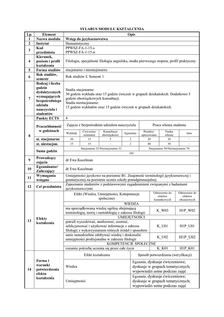 Lp. 1 2 3 4 5 6 7 Element Nazwa modułu Instytut Kod przedmiotu Kierunek, poziom i profil kształcenia Forma studiów Rok studiów, semestr Rodzaj i liczba godzin dydaktycznych wymagających bezpośredniego udziału nauczyciela i studentów Punkty ECTS Pracochłonność w godzinach 8 st. stacjonarne st. niestacjon. SYLABUS MODUŁU KSZTAŁCENIA Opis Wstęp do językoznawstwa Humanistyczny PPWSZ-FA-1-15-s PPWSZ-FA-1-15-n Filologia, specjalność filologia angielska, studia pierwszego stopnia, profil praktyczny stacjonarne i niestacjonarne Rok studiów I; Semestr 1 Studia stacjonarne: 30 godzin wykładu oraz 15 godzin ćwiczeń w grupach dziekańskich. Dodatkowo 5 godzin obowiązkowych konsultacji. Studia niestacjonarne: 15 godzin wykładów oraz 15 godzin ćwiczeń w grupach dziekańskich. 4 Zajęcia z bezpośrednim udziałem nauczyciela 30 Ćwiczenia/ seminaria 15 Konsultacje obowiązkowe 5 15 15 - Wykłady 9 10 11 Prowadzący zajęcia Egzaminator/ Zaliczający Wymagania wstępne 12 Cel przedmiotu 13 Efekty kształcenia 14 Forma i warunki potwierdzenia efektu kształcenia 2 Projekty/ opracowania 20 Nauka własna 30 2 40 30 Egzaminy Stacjonarne 52/Niestacjonarne 32 Suma godzin Praca własna studenta Inne - Stacjonarne 50/Niestacjonarne 70 102 dr Ewa Kucelman dr Ewa Kucelman Umiejętności językowe na poziomie B1. Znajomość terminologii językoznawczej i gramatycznej na poziomie ucznia szkoły ponadgimnazjalnej. Zapoznanie studentów z podstawowymi zagadnieniami związanymi z badaniami językoznawczymi. Odniesienie do Odniesienie do Efekt (Wiedza, Umiejętności, Kompetencje efektów efektów społeczne) kierunkowych obszarowych WIEDZA ma uporządkowaną wiedzę ogólną obejmującą K_W03 H1P_W02 terminologię, teorię i metodologię z zakresu filologii UMIEJĘTNOŚCI potrafi wyszukiwać, analizować, oceniać, selekcjonować i użytkować informacje z zakresu K_U01 H1P_U01 filologii z wykorzystaniem różnych źródeł i sposobów umie samodzielnie zdobywać wiedzę i doskonalić K_U02 H1P_U02 umiejętności profesjonalne w zakresie filologii KOMPETENCJE SPOŁECZNE rozumie potrzebę uczenia się przez całe życie K_K01 H1P_K01 Efekt kształcenia Sposób potwierdzenia (weryfikacji) Egzamin, dyskusje ćwiczeniowe; Wiedza Umiejętności dyskusje w grupach tematycznych; wypowiedzi ustne podczas zajęć Egzamin, dyskusje ćwiczeniowe; dyskusje w grupach tematycznych; wypowiedzi ustne podczas zajęć Ocena pracy na ćwiczeniach, Kompetencje społeczne 15 16 17 18 19 wypowiedzi w trakcie zajęć; prawidłowe korzystanie ze zdobytej wiedzy; systematyczna, celowa i efektywna praca Stosowane metody dydaktyczne Wykłady problemowe, ćwiczenia, dyskusja, prezentacje. Treści merytoryczne przedmiotu Wykład: 1. Pochodzenie języka 2. Język zwierząt 3. Rozwój pisma 4. Wybrane zagadnienia z zakresu neurolingwistyki 5. Pojęcie gramatyki 6. Nabywanie języka rodzimego 7. Nabywanie języka obcego Wybrane zagadnienia z zakresu fonetyki 8. Wybrane zagadnienia z zakresu fonologii 9. Wybrane zagadnienia z zakresu morfologii 10. Procesy słowotwórcze 11. Wybrane zagadnienia z zakresu składni 12. Wybrane zagadnienia z zakresu semantyki 13. Wybrane zagadnienia z zakresu pragmatyki 14. Wybrane zagadnienia z zakresu analizy dyskursu Ćwiczenia: Ćwiczenia praktyczne z zakresu następujących jednostek tematycznych: 1. Wybrane zagadnienia z zakresu fonetyki 2. Wybrane zagadnienia z zakresu fonologii 3. Wybrane zagadnienia z zakresu morfologii 4. Procesy słowotwórcze 5. Wybrane zagadnienia z zakresu składni 6. Wybrane zagadnienia z zakresu semantyki 7. Wybrane zagadnienia z zakresu pragmatyki 8. Wybrane zagadnienia z zakresu analizy dyskursu Forma i warunki zaliczenia modułu, w tym zasady dopuszczenia do egzaminu Wykaz literatury podstawowej Wykaz literatury uzupełniającej Warunkiem uzyskania pozytywnej oceny jest regularne i aktywne uczestnictwo w zajęciach, udział w dyskusji w czasie zajęć oraz pozytywnej oceny z pisemnego egzaminu końcowego. Standardowa skala ocen. Yule, G. The Study of Language. Third Edition. Cambridge University Press. 2006 Fromkin, V. An Introduction to Language. Fort Worth: Harcourt Brace Javanovich. 1993. Radford, A. et al. Linguistics. An Introduction. Second Edition. Cambridge University Press. 2009. Tabakowska, E. Kognitywne podstawy języka i językoznawstwa. Universitas. 2001.