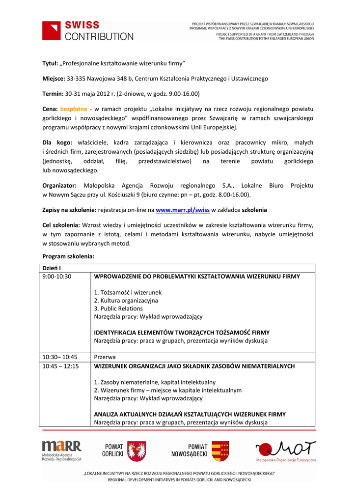 Tytuł: „Profesjonalne kształtowanie wizerunku firmy” Miejsce: 33-335 Nawojowa 348 b, Centrum Kształcenia Praktycznego i Ustawicznego Termin: 30-31 maja 2012 r. (2-dniowe, w godz. 9.00-16.00) Cena: bezpłatne - w ramach projektu „Lokalne inicjatywy na rzecz rozwoju regionalnego powiatu gorlickiego i nowosądeckiego” współfinansowanego przez Szwajcarię w ramach szwajcarskiego programu współpracy z nowymi krajami członkowskimi Unii Europejskiej. Dla kogo: właściciele, kadra zarządzająca i kierownicza oraz pracownicy mikro, małych i średnich firm, zarejestrowanych (posiadających siedzibę) lub posiadających strukturę organizacyjną (jednostkę, oddział, filię, przedstawicielstwo) na terenie powiatu gorlickiego lub nowosądeckiego. Organizator: Małopolska Agencja Rozwoju regionalnego S.A., Lokalne w Nowym Sączu przy ul. Kościuszki 9 (biuro czynne: pn – pt, godz. 8.00-16.00). Biuro Projektu Zapisy na szkolenie: rejestracja on-line na www.marr.pl/swiss w zakładce szkolenia Cel szkolenia: Wzrost wiedzy i umiejętności uczestników w zakresie kształtowania wizerunku firmy, w tym zapoznanie z istotą, celami i metodami kształtowania wizerunku, nabycie umiejętności w stosowaniu wybranych metod. Program szkolenia: Dzień I 9:00-10:30 WPROWADZENIE DO PROBLEMATYKI KSZTAŁTOWANIA WIZERUNKU FIRMY 1. Tożsamość i wizerunek 2. Kultura organizacyjna 3. Public Relations Narzędzia pracy: Wykład wprowadzający IDENTYFIKACJA ELEMENTÓW TWORZĄCYCH TOŻSAMOŚĆ FIRMY Narzędzia pracy: praca w grupach, prezentacja wyników dyskusja 10:30– 10:45 10:45 – 12:15 Przerwa WIZERUNEK ORGANIZACJI JAKO SKŁADNIK ZASOBÓW NIEMATERIALNYCH 1. Zasoby niematerialne, kapitał intelektualny 2. Wizerunek firmy – miejsce w kapitale intelektualnym Narzędzia pracy: Wykład wprowadzający ANALIZA AKTUALNYCH DZIAŁAŃ KSZTAŁTUJĄCYCH WIZERUNEK FIRMY Narzędzia pracy: praca w grupach, prezentacja wyników dyskusja 12:15 – 12:45 12:45 – 14:15 przerwa ANALIZA CZYNNIKÓW WPŁYWAJĄCYCH NA WIZERUNEK ORGANIZACJI 1. System identyfikacji wizualnej 2. Wewnętrzni i zewnętrzni odbiorcy wizerunku Narzędzia pracy: wykład wprowadzający 14:15 – 14:30 14:30 – 16:00 SYSTEMOWEGO PODEJŚCIA DO DZIAŁAŃ KREUJĄCYCH WIZERUNEK FIRMY I WZAJEMNE RELACJE POMIĘDZY POSTRZEGANIEM FIRMY PRZEZ PRACOWNIKÓW I INTERESARIUSZY Narzędzia pracy: praca w grupach, prezentacja wyników dyskusja przerwa PUBLIC RELATIONS JAKO NARZĘDZIE KREOWANIA WIZERUNKU ORGANIZACJI 1. Istota PR 2. Miejsce PR w marketingu mix 3. Instrumenty PR Narzędzia pracy: wykład wprowadzający IDENTYFIKACJA NARZĘDZI MOŻLIWYCH DO WYKORZYSTANIA W KREOWANIU WIZERUNKU FIRMY Narzędzia pracy: praca w grupach, prezentacja wyników dyskusja Dzień II 9.00:10.30 PUBLIC RELATIONS JAKO NARZĘDZIE KREOWANIA WIZERUNKU ORGANIZACJI (c.d.) 1. Istota PR 2. Miejsce PR w marketingu mix 3. Instrumenty PR Narzędzia pracy: wykład wprowadzający 10.30:10.45 10:45 – 12:15 IDENTYFIKACJA NARZĘDZI MOŻLIWYCH DO WYKORZYSTANIA W KREOWANIU WIZERUNKU FIRMY (c.d.) Narzędzia pracy: praca w grupach, prezentacja wyników dyskusja przerwa ZARZĄDZANIE ZMIANĄ W KREOWANIU WIZERUNKU FIRMY 1. Aspekty zarządzania zmianą 2. Źródła oporu wobec zmian 3. Teorie zarządzania zmianą Narzędzia pracy: wykład wprowadzający WYKORZYSTANIE TEORII LUKI I ANALIZY POLA SIŁ WE WDRAŻANIU ZMIAN ZWIĄZANYCH Z KREOWANIEM WIZERUNKU FIRMY Narzędzia pracy: praca w grupach, prezentacja wyników dyskusja 12:15 – 12:45 12:45 – 14:15 przerwa ISTOTA I TREŚĆ KULTURY ORGANIZACYJNEJ, MODELE I TYPOLOGIE KULTUR ORGANIZACYJNYCH 1. Kultura organizacyjna jako zmienna zależna i niezależna 2. Kształtowanie kultury organizacyjnej a wizerunek firmy 3. Typologie kultur organizacyjnych Narzędzia pracy: wykład wprowadzający 14:15 – 14:30 14:30 – 16:00 WYKORZYSTANIE MODELU KULTURY ORGANIZACYJNEJ E. SCHEINA DO IDENTYFIKACJI KULTURY ORGANIZACYJNEJ Narzędzia pracy: praca w grupach, prezentacja wyników dyskusja przerwa ZASTOSOWANIE ARKUSZA DIAGNOSTYCZNEGO DO IDENTYFIKACJI TYPU KULTURY ORGANIZACYJNEJ W FIRMACH, KTÓRE REPREZENTUJĄ UCZESTNICY PODSUMOWANIE SZKOLENIA I WNIOSKI Narzędzia pracy: praca w grupach, prezentacja wyników dyskusja W ramach szkolenia MARR S.A. zapewnia materiały szkoleniowe, zaświadczenia i catering. Metody i narzędzia stosowane w trakcie realizacji szkolenia: Analizy przykładów, wykład, dyskusje, ćwiczenia grupowe oraz indywidualne. TRENER: Piotr Markiewicz Doktor nauk ekonomicznych w zakresie nauk o zarządzaniu. Adiunkt w Katedrze Analiz Strategicznych Uniwersytetu Ekonomicznego w Krakowie. Posiada 17-letnie doświadczenie prowadzenia szkoleń m.in. dla kadry kierowniczej oraz pracowników restrukturyzowanych przedsiębiorstw, dla kandydatów na członków rad nadzorczych spółek Skarbu Państwa. Ekspert, m.in. w projekcie Krakowskiego Parku Technologicznego: Kraków – Małopolska Perspektywa Technologiczna 2020 oraz ekspert merytoryczny Małopolskiej Szkoły Administracji Publicznej w zakresie wdrażania planów rozwoju w przedsiębiorstwach sektora MSP. Wybrane publikacje 1. Markiewicz P., Zasoby niematerialne jako źródło przewagi konkurencyjnej, Zeszyty Naukowe AE, Kraków 2001. 2. Markiewicz P., Reputacja jako niematerialny zasób w tworzeniu przewagi konkurencyjnej, „Przedsiębiorczość i twórcze myślenie w biznesie” – Wydawnictwo Katedry Ekonomii Uniwersytetu Łódzkiego, Łódz 2002. 3. The potential of polish enterprises’ competitiveness in the aspect of globalization of management, Międzynarodowa konferencja naukowa w Lizbonie, COPE, Portugalia 2002. 4. Markiewicz P., Corporate social responsibility – strategic aspects, VSB – Technical University of Ostrava, Ostrava 2009 w: Strategic Management and its Support Information Systems, pod red. Jindrich Kaluża. 5. Kafel T., Markiewicz P., Procesowe podejście do strategicznej analizy zasobów przedsiębiorstwa, Materiały konferencyjne management forum 2020, AE Katowice 20