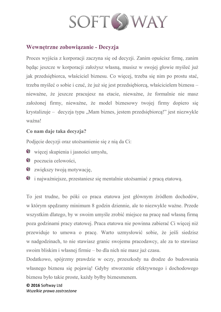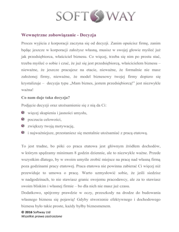 Wewnętrzne zobowiązanie - Decyzja Proces wyjścia z korporacji zaczyna się od decyzji. Zanim opuścisz firmę, zanim będąc jeszcze w korporacji założysz własną, musisz w swojej głowie myśleć już jak przedsiębiorca, właściciel biznesu. Co więcej, trzeba się nim po prostu stać, trzeba myśleć o sobie i czuć, że już się jest przedsiębiorcą, właścicielem biznesu – nieważne, że jeszcze pracujesz na etacie, nieważne, że formalnie nie masz założonej firmy, nieważne, że model biznesowy twojej firmy dopiero się krystalizuje – decyzja typu „Mam biznes, jestem przedsiębiorcą!” jest niezwykle ważna! Co nam daje taka decyzja? Podjęcie decyzji oraz utożsamienie się z nią da Ci: więcej skupienia i jasności umysłu, poczucia celowości, zwiększy twoją motywację, i najważniejsze, przestaniesz się mentalnie utożsamiać z pracą etatową. To jest trudne, bo póki co praca etatowa jest głównym źródłem dochodów, w którym spędzamy minimum 8 godzin dziennie, ale to niezwykle ważne. Przede wszystkim dlatego, by w swoim umyśle zrobić miejsce na pracę nad własną firmą poza godzinami pracy etatowej. Praca etatowa nie powinna zabierać Ci więcej niż przewiduje to umowa o pracę. Warto uzmysłowić sobie, że jeśli siedzisz w nadgodzinach, to nie stawiasz granic swojemu pracodawcy, ale za to stawiasz swoim bliskim i własnej firmie – bo dla nich nie masz już czasu. Dodatkowo, spójrzmy prawdzie w oczy, przeszkody na drodze do budowania własnego biznesu się pojawią! Gdyby stworzenie efektywnego i dochodowego biznesu było takie proste, każdy byłby biznesmenem. © 2016 Softway Ltd Wszelkie prawa zastrzeżone Pamiętaj, bycie przedsiębiorcą/właścicielem biznesu to styl bycia. Rzucenie papierami i rejestracja firmy nie uczynią z ciebie przedsiębiorcy, tylko pracownika etatowego bez pracy, a z zarejestrowana firmą. Ponieważ wciąż będziesz działał według schematu pracownika i kierował się nawykami myślowymi podwładnego. Lecz kiedy podejmiesz już własną decyzję o budowaniu własnego biznesu/firmy oraz mocno uwewnętrznisz tę decyzję (we własnym umyśle postawisz wszystko na jedną kartę) i swoje powody, dla których decydujesz się opuścić korporację, poczujesz się zainspirowana/y, aby podjąć działania niezbędne do osiągnięcia sukcesu. To zainspirowane decyzją działanie naprawdę ma znaczenie. Właśnie dlatego zadeklaruj się! Niestety, zbyt dużo osób pracujących nad rozwijaniem i budową własnej firmy, nie podjęło prostej decyzji o osiągnięciu sukcesu. Stąd też nie ma w nich prawdziwego postanowienia czy determinacji. Nie pozwól, by to przytrafiło się Tobie. Pierwszym krokiem, aby wyjść poza obszar „starań” i przejść do obszaru „odnoszenia sukcesów”, jest podjęcie decyzji. Ważne! Decyzja nie jest celem. Siła niezbędna do tego, by cel osiągnąć, tkwi w DECYZJI. Pierwsza jest decyzja, cele potem. Czym zatem jest decyzja? To ogólna deklaracja i postanowienie. Czym zaś jest cel? Cel jest tym, co chcesz osiągnąć. Jest to konkretne oraz mierzalne. Pamiętaj, decyzja nie jest też deklaracją misji. Nie chodzi tu o to, byś uczynił/a ze swojej decyzji opisu swojej misji życiowej – na to przyjdzie czas później. © 2016 Softway Ltd Wszelkie prawa zastrzeżone Teraz chcę, byś podjął/ęła postanowienie, które pobudzi twoje emocje. Powinna umacniać twoje zaangażowanie i inspirować Cię do podjęcia działań, nawet wtedy, gdy nie jest to łatwe. Zatem stwórz decyzję: jasną, zwięzłą, łatwą do zapamiętania i inspirującą dla Ciebie. Podsumowując, jaka powinna być decyzja: zrozumiała dla dziesięciolatka, do wyrecytowania z łatwością z pamięci, wywołująca u Ciebie emocje. Zdanie samo w sobie nie jest tak istotne, jak stojące za nim emocje, uczucia, wrażenia. To one inspirują do działania, zatem najlepsza decyzja, jaką możesz podjąć, to taka, która inspiruje Cię do podjęcia działania, nawet wtedy, kiedy nie masz na nie ochoty. Ćwiczenie 1. Podejmij własną decyzję, która będzie towarzyszyć Ci w procesie wychodzenia z korporacji i rozwijania własnej firmy. Niech jasno z niej wynika, że jesteś przedsiębiorcą, właścicielem firmy/biznesu. Niech zawiera w sobie sprawy, rzeczy i powody dla Ciebie naprawdę ważne. ……………………………………………………………………………………… ……………………………………………………………………………………… ……………………………………………………………………………………… …………………………………………………………………………………….. © 2016 Softway Ltd Wszelkie prawa zastrzeżone