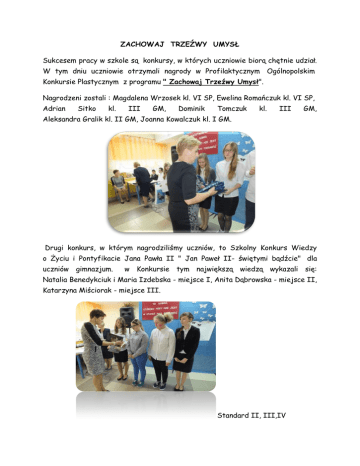 ZACHOWAJ TRZEŹWY UMYSŁ Sukcesem pracy w szkole są konkursy, w których uczniowie biorą chętnie udział. W tym dniu uczniowie otrzymali nagrody w Profilaktycznym Ogólnopolskim Konkursie Plastycznym z programu " Zachowaj Trzeźwy Umysł". Nagrodzeni zostali : Magdalena Wrzosek kl. VI SP, Ewelina Romańczuk kl. VI SP, Adrian Sitko kl. III GM, Dominik Tomczuk kl. III GM, Aleksandra Gralik kl. II GM, Joanna Kowalczuk kl. I GM. Drugi konkurs, w którym nagrodziliśmy uczniów, to Szkolny Konkurs Wiedzy o Życiu i Pontyfikacie Jana Pawła II " Jan Paweł II- świętymi bądźcie" dla uczniów gimnazjum. w Konkursie tym największą wiedzą wykazali się: Natalia Benedykciuk i Maria Izdebska - miejsce I, Anita Dąbrowska - miejsce II, Katarzyna Miściorak - miejsce III. Standard II, III,IV