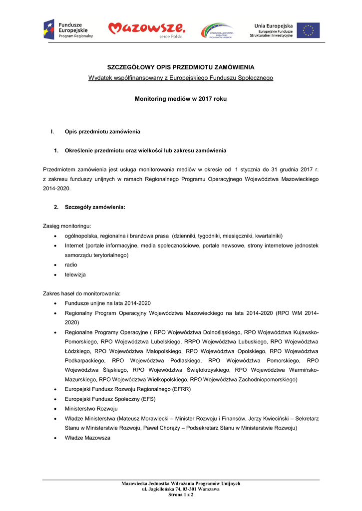 SZCZEGÓŁOWY OPIS PRZEDMIOTU ZAMÓWIENIA Wydatek współfinansowany z Europejskiego Funduszu Społecznego Monitoring mediów w 2017 roku Opis przedmiotu zamówienia I. 1. Określenie przedmiotu oraz wielkości lub zakresu zamówienia Przedmiotem zamówienia jest usługa monitorowania mediów w okresie od 1 stycznia do 31 grudnia 2017 r. z zakresu funduszy unijnych w ramach Regionalnego Programu Operacyjnego Województwa Mazowieckiego 2014-2020. 2. Szczegóły zamówienia: Zasięg monitoringu: ogólnopolska, regionalna i branżowa prasa (dzienniki, tygodniki, miesięczniki, kwartalniki) Internet (portale informacyjne, media społecznościowe, portale newsowe, strony internetowe jednostek samorządu terytorialnego) radio telewizja Zakres haseł do monitorowania: Fundusze unijne na lata 2014-2020 Regionalny Program Operacyjny Województwa Mazowieckiego na lata 2014-2020 (RPO WM 20142020) Regionalne Programy Operacyjne ( RPO Województwa Dolnośląskiego, RPO Województwa KujawskoPomorskiego, RPO Województwa Lubelskiego, RRPO Województwa Lubuskiego, RPO Województwa Łódzkiego, RPO Województwa Małopolskiego, RPO Województwa Opolskiego, RPO Województwa Podkarpackiego, RPO Województwa Podlaskiego, RPO Województwa Pomorskiego, RPO Województwa Śląskiego, RPO Województwa Świętokrzyskiego, RPO Województwa WarmińskoMazurskiego, RPO Województwa Wielkopolskiego, RPO Województwa Zachodniopomorskiego) Europejski Fundusz Rozwoju Regionalnego (EFRR) Europejski Fundusz Społeczny (EFS) Ministerstwo Rozwoju Władze Ministerstwa (Mateusz Morawiecki – Minister Rozwoju i Finansów, Jerzy Kwieciński – Sekretarz Stanu w Ministerstwie Rozwoju, Paweł Chorąży – Podsekretarz Stanu w Ministerstwie Rozwoju) Władze Mazowsza Mazowiecka Jednostka Wdrażania Programów Unijnych ul. Jagiellońska 74, 03-301 Warszawa Strona 1 z 2 Zarząd Województwa Mazowieckiego (Adam Struzik-Marszałek Województwa Mazowieckiego, Janina Ewa Orzełowska - Wicemarszałek Województwa Mazowieckiego, Wiesław Raboszuk – Wicemarszałek Województwa Mazowieckiego, Elżbieta Lanc – Członek Zarządu Województwa Mazowieckiego, Rafał Rajkowski – Członek Zarządu Województwa Mazowieckiego) Mazowiecka Jednostka Wdrażania Programów Unijnych (MJWPU) Punkt Informacyjny Funduszy Europejskich (PIFE) Dyrekcja Mazowieckiej Jednostki Wdrażania Programów Unijnych (Mariusz Frankowski – Dyrektor Mazowieckiej Jednostki Wdrażania Programów Unijnych, Grzegorz Świętorecki – Zastępca Dyrektora Mazowieckiej Jednostki Wdrażania Programów Unijnych ds. EFRR, Elżbieta Szymanik – Zastępca Dyrektora Mazowieckiej Jednostki Wdrażania Programów Unijnych ds. EFS, Wiesława Nowaczyńska – Zastępca Dyrektora Mazowieckiej Jednostki Wdrażania Programów Unijnych ds. finansowych – Główny Księgowy). Wykonawca zobowiązany będzie do przekazywania codziennie (najpóźniej do godziny 7.30) raportu dotyczącego obecności w mediach wskazanych powyżej haseł. Mazowiecka Jednostka Wdrażania Programów Unijnych ul. Jagiellońska 74, 03-301 Warszawa Strona 2 z 2