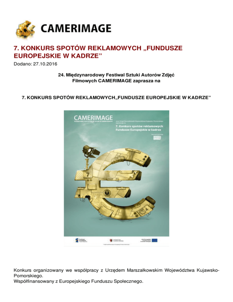 7. KONKURS SPOTÓW REKLAMOWYCH „FUNDUSZE EUROPEJSKIE W KADRZE” Dodano: 27.10.2016 24. Międzynarodowy Festiwal Sztuki Autorów Zdjęć Filmowych CAMERIMAGE zaprasza na 7. KONKURS SPOTÓW REKLAMOWYCH„FUNDUSZE EUROPEJSKIE W KADRZE” Konkurs organizowany we współpracy z Urzędem Marszałkowskim Województwa KujawskoPomorskiego. Współfinansowany z Europejskiego Funduszu Społecznego. Pod patronatem honorowym BUSINESS in BRIEF. Jury: MAGDALENA DANIŁOŚ Dziennikarka, blogerka, ewangelista wideo marketingu Osiągnięcia: realizowała kampanie dla marek takich jak Samsung, Bosch czy Viessmann oraz wielu podmiotów administracyjnych. Opiekun merytoryczny studiów podyplomowych na kierunku „Marketing internetowy” Akademii Górniczo-Hutniczej w Krakowie oraz wykładowca na takich uczelniach jak Akademia Leona Koźmińskiego czy Szkoła Główna Handlowa w Warszawie. Jest autorką publikacji na temat produkcji filmowej oraz budowania strategii wideomarketingowych w najważniejszych polskich magazynach branżowych. Prowadzi swój kanał YouTube, na którym przeprowadza wywiady z najbardziej znanymi osobowościami polskiej branży marketingowej oraz twórcami YouTube. Autorka pierwszej w Polsce książki dotyczącej wideo marketingu, która ukazała się nakładem wydawnictwa OnePress i niemal natychmiast stała się bestsellerem. JAN MAJLE Dyrektor kreatywny, copywriter. Osiągnięcia: autor wielu kampanii reklamowych, takich jak „Język polski jest Ą-Ę”, interaktywna reklama telewizyjna Skody „Bagażnik”, akcji „Yeti w Tatrach” czy „Polska zamienia się w słuch”, odpowiedzialny za kreację w komunikacji wielu czołowych marek obecnych na polskim rynku. Zdobywca ponad 40 nagród na polskich i międzynarodowych konkursach reklamowych, w tym dwóch Lwów na festiwalu Cannes Lions. Juror KTR, Eurobest, New York Festivals, Grand Video Awards, wykładowca Warszawskiej Szkoły Filmowej. Nagrody reklamowe: Cannes Lions 2010 Brąz, Cannes Lions 2014 Srebro, Grand Prix i 4x Golden Drum. FILIP NOCNY Specjalista od marketingu, trener Osiągnięcia: ceniony trener copywritingu, content marketingu i reklamy natywnej. Jego szkolenia to dynamiczna mieszanka wyników badań, case studies, symulacji oraz rozwiązań gotowych do natychmiastowego wykorzystania. Na co dzień zarządza własną agencją jako dyrektor kreatywny, tworzy strategie komunikacji, realizuje wielokanałowe kampanie oraz łączy pracę copywritera i scenarzysty. Pracuje dla wielkich korporacji i małych firm, a ostatnio dzieli się swoją wiedzą z sektorem publicznym. W tegorocznym Konkursie Jury oceni dziewięć zgłoszonych spotów: Urząd Marszałkowski Województwa Śląskiego “Śląskie – ruszamy!” Urząd Marszałkowski Województwa Łódzkiego Spot telewizyjny – Zmieniamy Łódzkie – Współpraca nauki z biznesem Urząd Marszałkowski Województwa Opolskiego Opolskie rozkwita z Funduszami Urząd Marszałkowski Województwa Zachodniopomorskiego Regionalny Program Operacyjny 2014-2020 – dobry kurs dla Pomorza Zachodniego Urząd Marszałkowski Województwa Warmińsko-Mazurskiego w Olsztynie FUNDUSZE. PRZYSTAŃ – SKORZYSTAJ! Urząd Marszałkowski Województwa Lubuskiego Nauka i Biznes – związek idealny Urząd Marszałkowski Województwa Dolnośląskiego Poszerzamy perspektywę – Gospodarka niskoemisyjna Dolnośląski Wojewódzki Urząd Pracy Power dla młodych Urząd Marszałkowski Województwa Małopolskiego Dla wszystkich Pokazy konkursowych spotów odbędą się w czwartek 17 listopada o godz. 11:00 w Sali nr 7 w bydgoskim Multikinie. ----------WARSZTATY TOWARZYSZĄCE 6. KONKURSOWI „FUNDUSZE EUROPEJSKIE W KADRZE” Multikino, sala nr 7 czwartek, 17.11. 11:30 Magdalena Daniłoś SPOTÓW REKLAMOWYCH VIDEO MARKETING - SKUTECZNA KOMUNIKACJA FUNDUSZY EUROPEJSKICH Video jest jedną z najskuteczniejszych form komunikacji w dzisiejszych czasach. Nic dziwnego, że coraz częściej to właśnie ruchomy obraz staje się nośnikiem do przekazywania informacji w komunikacji Funduszy Europejskich. Prezentacja dotycząca video marketingu podczas tegorocznego Camerimage dotykać będzie trzech obszarów. W części pierwszej zaprezentowane zostaną najciekawsze formaty video w komunikacji Funduszy Europejskich w oparciu o case studies np.: webinaria, tutoriale, filmy instruktażowe i inne. Omówione zostaną także elementy techniczne oraz organizacyjne w kontekście produkcji video Część druga to omówienie najskuteczniejszych form dystrybucji materiałów video tak by dotrzeć możliwie najbardziej precyzyjnie do odbiorcy. Multikino, sala nr 7 czwartek, 17.11. 14:00 Filip Nocny CONTENT MARKETING W PROMOCJI FUNDUSZY UE PRZEŁĄCZ URZĄD NA NAJNOWSZE TRENDY 2017 Content Marketing & automatyzacja, Grywalizacja & Storytelling, Reklama Natywna & Miejski Ambient… Co to jest? Czego oczekiwać? Jak połączyć trendy w oryginalną i mierzalną kampanię? Przykłady, narzędzia i pomysły. Włącz ciekawość. Będzie się działo. Holiday Inn, sala konferencyjna piątek, 18.11. 09:00 Klaudia Tolman-Ryslicielka® WARSZTAT Z MYŚLENIA MARSZAŁKOWSKICH (warsztat zamknięty) WIZUALNEGO DLA PRACOWNIKÓW URZĘDÓW I część W czasie warsztatu uczestnicy: - otrzymają 5 sztuczek rysunkowych do natychmiastowego wdrożenia (dzięki nim rysunki będą bardziej czytelne, pewne i zrozumiałe przez innych) - poznają przykłady wykorzystania Myślenia Wizualnego - poszukają wspólnie realnych zastosowań Myślenia Wizualnego z perspektywy Urzędów Marszałkowskich II część W drugiej część warsztatu, uczestnicy podejmą próbę stworzenia krótkiego filmu rysunkowego (od koncepcji, poprzez scenariusz oraz stworzenie storyboardu).