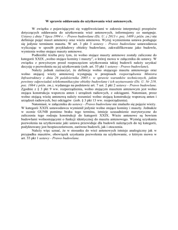 W sprawie oddawania do użytkowania wież antenowych. W związku z pojawiającymi się wątpliwościami w zakresie interpretacji przepisów dotyczących oddawania do użytkowania wież antenowych, informujemy co następuje. Ustawy z dnia 7 lipca 1994 r. – Prawo budowlane (Dz. U. z 2013 r. poz. 1409 z późn. zm.) nie definiuje pojęć maszt antenowy oraz wieża antenowa. Wyżej wymieniona ustawa posługuje się jedynie terminem masztu. W art. 3 pkt 3 ustawy - Prawo budowlane ustawodawca wyliczając w sposób przykładowy obiekty budowlane, zakwalifikowane jako budowle, wymienia wolno stojące maszty antenowe. Podkreślić trzeba przy tym, że wolno stojące maszty antenowe zostały zaliczone do kategorii XXIX „wolno stojące kominy i maszty”, o której mowa w załączniku do ustawy. W związku z powyższym przed rozpoczęciem użytkowania takiej budowli należy uzyskać decyzję o pozwoleniu na jej użytkowanie (zob. art. 55 pkt 1 ustawy - Prawo budowlane). Należy jednak zaznaczyć, że definicje wolno stojącego masztu antenowego oraz wolno stojącej wieży antenowej występują w przepisach rozporządzenia Ministra Infrastruktury z dnia 26 października 2005 r. w sprawie warunków technicznych, jakim powinny odpowiadać telekomunikacyjne obiekty budowlane i ich usytuowanie (Dz. U. Nr 219, poz. 1864 z późn. zm.), wydanego na podstawie art. 7 ust. 2 pkt 2 ustawy - Prawo budowlane. Zgodnie z § 3 pkt 9 ww. rozporządzenia, wolno stojącym masztem antenowym jest wolno stojąca konstrukcja wsporcza anten i urządzeń radiowych, z odciągami. Natomiast, przez wolno stojącą wieżę antenową należy rozumieć wolno stojącą konstrukcję wsporczą anten i urządzeń radiowych, bez odciągów (zob. § 3 pkt 13 ww. rozporządzenia). Natomiast, w załączniku do ustawy - Prawo budowlane nie znalazło się pojęcie wieży. W kategorii XXIX ustawodawca wymienił jedynie wolno stojące kominy i maszty. Jednakże w ocenie GUNB pomimo braku tego terminu, istnieje uzasadnienie merytoryczne do zaliczenia tego rodzaju konstrukcji do kategorii XXIX. Wieże antenowe są bowiem budowlami wolnostojącymi o funkcji identycznej do masztu antenowego. Wymóg uzyskania pozwolenia na użytkowanie jaki ustawa przewiduje dla budowli należących do tej kategorii, podyktowany jest bezpieczeństwem, zarówno budowli, jak i otoczenia. Należy więc uznać, że w stosunku do wież antenowych istnieje analogiczny jak w przypadku masztów, obowiązek uzyskania pozwolenia na użytkowanie, o którym mowa w art. 55 pkt 1 ustawy - Prawo budowlane.
