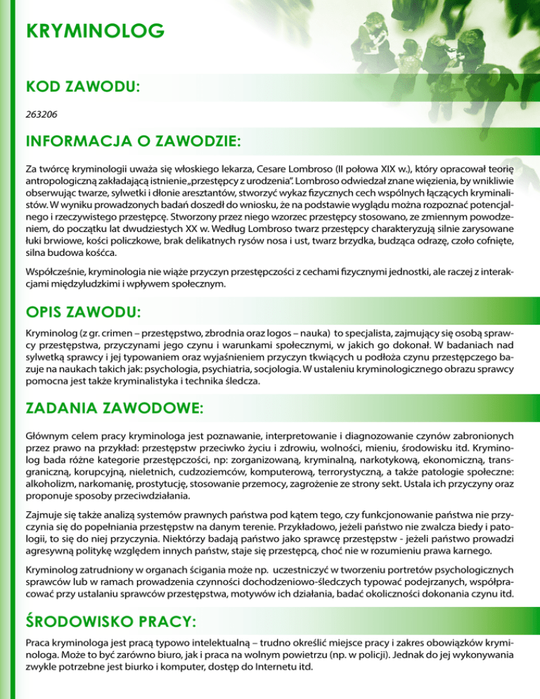 KRYMINOLOG KOD ZAWODU: 263206 INFORMACJA O ZAWODZIE: Za twórcę kryminologii uważa się włoskiego lekarza, Cesare Lombroso (II połowa XIX w.), który opracował teorię antropologiczną zakładającą istnienie„przestępcy z urodzenia”. Lombroso odwiedzał znane więzienia, by wnikliwie obserwując twarze, sylwetki i dłonie aresztantów, stworzyć wykaz fizycznych cech wspólnych łączących kryminalistów. W wyniku prowadzonych badań doszedł do wniosku, że na podstawie wyglądu można rozpoznać potencjalnego i rzeczywistego przestępcę. Stworzony przez niego wzorzec przestępcy stosowano, ze zmiennym powodzeniem, do początku lat dwudziestych XX w. Według Lombroso twarz przestępcy charakteryzują silnie zarysowane łuki brwiowe, kości policzkowe, brak delikatnych rysów nosa i ust, twarz brzydka, budząca odrazę, czoło cofnięte, silna budowa kośćca. Współcześnie, kryminologia nie wiąże przyczyn przestępczości z cechami fizycznymi jednostki, ale raczej z interakcjami międzyludzkimi i wpływem społecznym. OPIS ZAWODU: Kryminolog (z gr. crimen – przestępstwo, zbrodnia oraz logos – nauka) to specjalista, zajmujący się osobą sprawcy przestępstwa, przyczynami jego czynu i warunkami społecznymi, w jakich go dokonał. W badaniach nad sylwetką sprawcy i jej typowaniem oraz wyjaśnieniem przyczyn tkwiących u podłoża czynu przestępczego bazuje na naukach takich jak: psychologia, psychiatria, socjologia. W ustaleniu kryminologicznego obrazu sprawcy pomocna jest także kryminalistyka i technika śledcza. ZADANIA ZAWODOWE: Głównym celem pracy kryminologa jest poznawanie, interpretowanie i diagnozowanie czynów zabronionych przez prawo na przykład: przestępstw przeciwko życiu i zdrowiu, wolności, mieniu, środowisku itd. Kryminolog bada różne kategorie przestępczości, np: zorganizowaną, kryminalną, narkotykową, ekonomiczną, transgraniczną, korupcyjną, nieletnich, cudzoziemców, komputerową, terrorystyczną, a także patologie społeczne: alkoholizm, narkomanię, prostytucję, stosowanie przemocy, zagrożenie ze strony sekt. Ustala ich przyczyny oraz proponuje sposoby przeciwdziałania. Zajmuje się także analizą systemów prawnych państwa pod kątem tego, czy funkcjonowanie państwa nie przyczynia się do popełniania przestępstw na danym terenie. Przykładowo, jeżeli państwo nie zwalcza biedy i patologii, to się do niej przyczynia. Niektórzy badają państwo jako sprawcę przestępstw - jeżeli państwo prowadzi agresywną politykę względem innych państw, staje się przestępcą, choć nie w rozumieniu prawa karnego. Kryminolog zatrudniony w organach ścigania może np. uczestniczyć w tworzeniu portretów psychologicznych sprawców lub w ramach prowadzenia czynności dochodzeniowo-śledczych typować podejrzanych, współpracować przy ustalaniu sprawców przestępstwa, motywów ich działania, badać okoliczności dokonania czynu itd. ŚRODOWISKO PRACY: Praca kryminologa jest pracą typowo intelektualną – trudno określić miejsce pracy i zakres obowiązków kryminologa. Może to być zarówno biuro, jak i praca na wolnym powietrzu (np. w policji). Jednak do jej wykonywania zwykle potrzebne jest biurko i komputer, dostęp do Internetu itd. Kryminolog musi korzystać z licznych opracowań i doniesień naukowych, sięgać do badań, wchodzić w obszary, gdzie króluje socjologia i psychologia. Aby zagłębiać się w metody statystyczne niezbędne są podstawy metodologiczne i umiejętności analityczne. Relacje kryminologa z innymi ludźmi zależne są od rodzaju pracy, jaką ma powierzoną na danym stanowisku. Może to być zarówno stały, intensywny kontakt, np. wykładowcy na uczelni czy policjanta, jak i sporadyczne i ograniczone kontakty badacza i analityka. Podobnie jeśli chodzi o czas pracy – jest on w dużym stopniu uzależniony jest od miejsca zatrudnienia. Zwykle pracuje w stałych godzinach, w dni powszednie według grafiku ustalonego przez organizację czy instytucję. WYMAGANIA PSYCHOFIZYCZNE: Kryminolog wykorzystuje zdobytą wiedzę do analizowania i rozstrzygania konkretnych problemów praktycznych. Musi znać regulacje prawne, głównie z zakresu prawa karnego, materialnego, prawa wykroczeń, procesowego i wykonawczego. Potrafi opracowywać założenia programów w zakresie zapobiegania przestępczości oraz patologiom społecznym w aspekcie kryminologicznym, kryminalistycznym i wiktymologicznym (wiktymologia – nauka zajmująca się ofiarami przestępstw). Ma wiedzę o wieloaspektowych, biologiczno - psychologiczno - społecznych podstawach zachowania człowieka i jego konsekwencjach. Cechy charakteru niezbędne do wykonywania zawodu kryminologa to zdolności analityczne, spostrzegawczość, umiejętność słuchania i wyciągania wniosków, otwartość oraz pewność siebie. Do pracy z przestępcami niezbędne są specyficzne predyspozycje intelektualne i psychiczne. Na przykład, kryminolog powinien mieć twardy charakter i być silny psychicznie, cechować się odpornością na stres, a jednocześnie wykazywać empatię wobec osób pokrzywdzonych. Przyda się także łatwość nawiązywania kontaktów i umiejętność przekonywania innych do własnej osoby. Od kandydata do pracy na stanowisku kryminologa nie wymaga się szczególnych predyspozycji zdrowotnych czy fizycznych. Wystarczy dobry, ogólny stan zdrowia oraz sprawny narząd słuchu i wzroku. Przeciwwskazaniami do wykonywania tego zawodu są choroby skórne twarzy i rąk, znaczne deformacje ciała, upośledzenie umysłowe oraz zaburzenia psychiczne. WARUNKI PODJĘCIA PRACY: Kryminologia jest nowoczesnym i prekursorskim w skali kraju kierunkiem studiów. W ramach zajęć studenci poznają zagadnienia praktyczne i teoretyczne z zakresu przestępczości i zjawisk dewiacyjnych, z którymi spotkają się w swoim przyszłym życiu zawodowym. Studia na kierunku kryminologia skierowane są szczególnie do osób, które posiadają odpowiednie predys