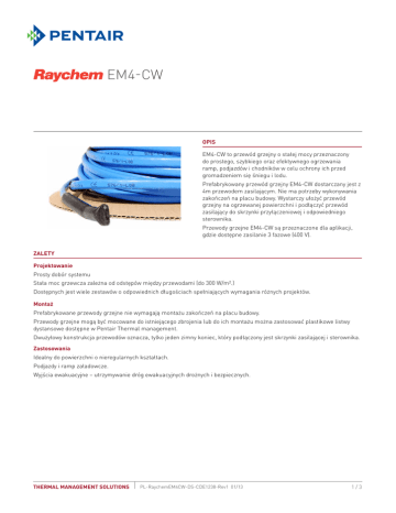 EM4-CW Opis EM4-CW to przewód grzejny o stałej mocy przeznaczony do prostego, szybkiego oraz efektywnego ogrzewania ramp, podjazdów i chodników w celu ochrony ich przed gromadzeniem się śniegu i lodu. Prefabrykowany przewód grzejny EM4-CW dostarczany jest z 4m przewodem zasilającym. Nie ma potrzeby wykonywania zakończeń na placu budowy. Wystarczy ułożyć przewód grzejny na ogrzewanej powierzchni i podłączyć przewód zasilający do skrzynki przyłączeniowej i odpowiedniego sterownika. Przewody grzejne EM4-CW są przeznaczone dla aplikacji, gdzie dostępne zasilanie 3 fazowe (400 V). Zalety Projektowanie Prosty dobór systemu Stała moc grzewcza zależna od odstępów między przewodami (do 300 W/m².) Dostępnych jest wiele zestawów o odpowiednich długościach spełniających wymagania różnych projektów. Montaż Prefabrykowane przewody grzejne nie wymagają montażu zakończeń na placu budowy. Przewody grzejne mogą być mocowane do istniejącego zbrojenia lub do ich montażu można zastosować plastikowe listwy dystansowe dostępne w Pentair Thermal management. Dwużyłowy konstrukcja przewodów oznacza, tylko jeden zimny koniec, który podłączony jest skrzynki zasilającej i sterownika. Zastosowania Idealny do powierzchni o nieregularnych kształtach. Podjazdy i ramp załadowcze. Wyjścia ewakuacyjne – utrzymywanie dróg ewakuacyjnych drożnych i bezpiecznych. THERMAL MANAGEMENT SOLUTIONS PL-RaychemEM4CW-DS-CDE1238-Rev1 01/13 1/3 EM4-CW Dane techniczne Moc nominalna: 25 W/m Napięcie zasilania: 400 Vac Maks. temperatura ekspozycji: 65°C Minimalna temperatura montażu: +5°C Wymiary: 8,9 mm x 5,5 mm Wymagany wyłącznik nadmiarowy: Type C Wył. różnicowo-prądowy: 30 mA Konstrukcja przewodu: Dwużyłowy, przewód grzejny o stałej mocy zakończony fabrycznie z 4 m 3 żyłowym przewodem zasilającym. Certyfikaty: CE, VDE Produkty powiązane VIA-DU-20 Programowalny sterownik przeznaczony do ogrzewania ramp, podjazdów i chodników z czujnikami temperatury i wilgotności gruntu oraz czujnikiem temperatury powietrza. VIA-PL-SPACER Polimerowa taśma dystansowa do montażu przewodów grzejnych. VIA-SPACER-25M Galwanizowana, stalowa taśma dystansowa o długości 25 m. Opakowania i nr katalogowe Przewody grzejne EM4-CW do ogrzewania podjazdów dostępne są w następujących rozmiarach: Symbol produktu Nr katalogowy Opis EM4-CW-26M 1244-005182 Przewód grzejny, 26 M, 25 W/m / 400 V EM4-CW-35M 1244-005184 Przewód grzejny, 35 M, 25 W/m / 400 V EM4-CW-62M 1244-005188 Przewód grzejny, 62 Metre 25 W/m / 400 V EM4-CW-121M 1244-005191 Przewód grzejny, 121 M, 25 W/m / 400 V EM4-CW-172M 1244-005194 Przewód grzejny, 172 M, 25 W/m / 400 V EM4-CW-210M 1244-005196 Przewód grzejny, 210 M, 25 W/m / 400 V EM4-CW-250M 1244-005198 Przewód grzejny, 250 M, 25 W/m / 400 V Przygotowanie podłoża przed montażem Przewody grzejne powinny być układana na stabilnym podłożu. Dla konstrukcji wiszących podłoże może składać się z gotowych płyt, sprężonego lub wylewanego betonu. Przewody grzejne mogą być układana na wszystkich podłożach. W przypadku wylewanego betonu należy upewnić się, że powierzchnia jest gładka a wszystkie ostre obiekty zostały usunięte. Rampy na stałych podłożach nie wymagają dodatkowej izolacji termicznej. Dodatkowego przygotowania wymaga montaż czujnika wilgotności i temperatury gruntu. Instrukcja montażu Kompletne instrukcje montażu dostarczane są wraz z produktem, są również dostępne w formie elektronicznej za pośrednictwem Pentair Thermal Management. Proszę pytać o instrukcję montażu, o numerze: INST-274. Dobór produktu Specyfikacja doboru produktu dostępna jest na życzenie za pośrednictwem Pentair Thermal Management. Jest również dostępna na stronie internetowej: www.thermal.pentair.com 2/3 PL-RaychemEM4CW-DS-CDE1238-Rev1 01/13 THERMAL MANAGEMENT SOLUTIONS WWW.THERMAL.PENTAIR.COM Polska Tel. +48 22 331 29 50 Fax +48 22 331 29 51 [email protected] All Pentair trademarks and logos are owned by Pentair. All other brand or product names are trademarks or registered marks of their respective owners. Because we are continuously improving our products and services, Pentair reserves the right to change specifications without prior notice. Pentair is an equal opportunity employer. © 2013 Pentair. All Rights Reserved. THERMAL MANAGEMENT SOLUTIONS PL-RaychemEM4CW-DS-CDE1238-Rev1 01/13 3/3