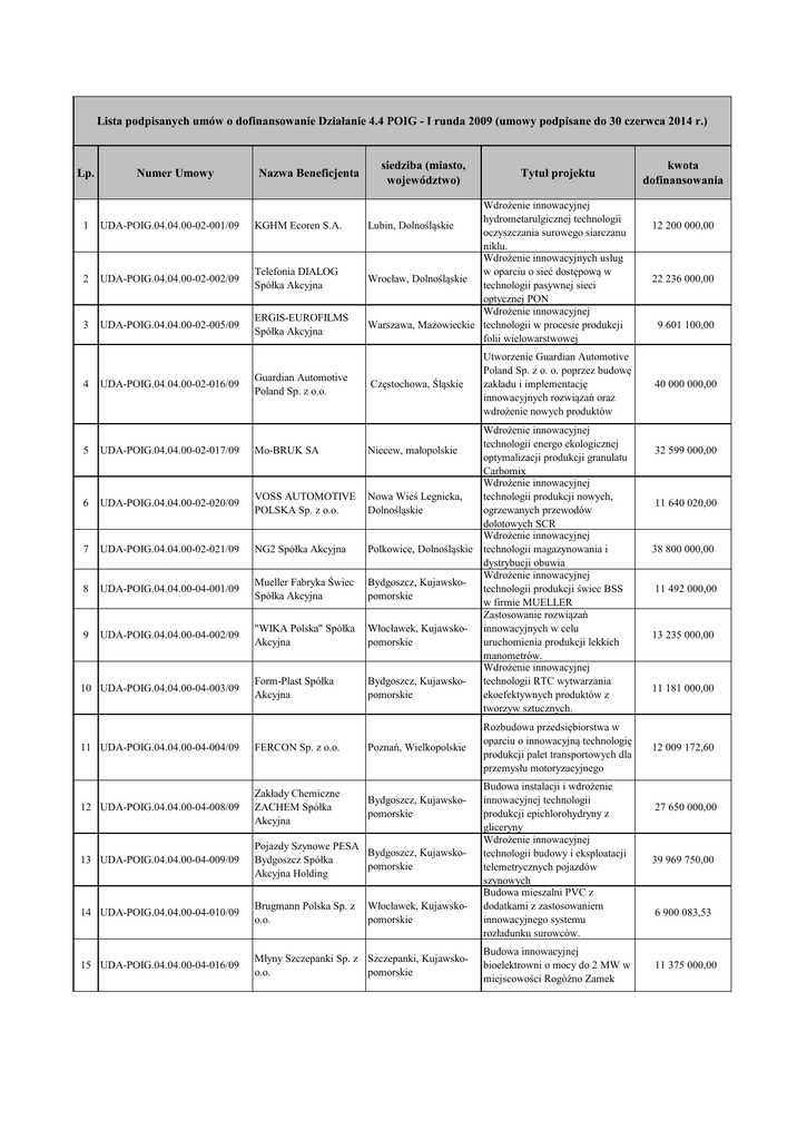 Lista podpisanych umów o dofinansowanie Działanie 4.4 POIG - I runda 2009 (umowy podpisane do 30 czerwca 2014 r.) Lp. Numer Umowy Nazwa Beneficjenta 1 UDA-POIG.04.04.00-02-001/09 KGHM Ecoren S.A. 2 UDA-POIG.04.04.00-02-002/09 Telefonia DIALOG Spółka Akcyjna 3 UDA-POIG.04.04.00-02-005/09 ERGIS-EUROFILMS Spółka Akcyjna siedziba (miasto, województwo) Wdrożenie innowacyjnej hydrometarulgicznej technologii Lubin, Dolnośląskie oczyszczania surowego siarczanu niklu. Wdrożenie innowacyjnych usług w oparciu o sieć dostępową w Wrocław, Dolnośląskie technologii pasywnej sieci optycznej PON Wdrożenie innowacyjnej Warszawa, Mazowieckie technologii w procesie produkcji folii wielowarstwowej 4 UDA-POIG.04.04.00-02-016/09 Guardian Automotive Poland Sp. z o.o. Częstochowa, Śląskie 5 UDA-POIG.04.04.00-02-017/09 Mo-BRUK SA Niecew, małopolskie 6 UDA-POIG.04.04.00-02-020/09 VOSS AUTOMOTIVE POLSKA Sp. z o.o. 7 UDA-POIG.04.04.00-02-021/09 NG2 Spółka Akcyjna 8 UDA-POIG.04.04.00-04-001/09 Mueller Fabryka Świec Spółka Akcyjna 9 UDA-POIG.04.04.00-04-002/09 "WIKA Polska" Spółka Akcyjna 10 UDA-POIG.04.04.00-04-003/09 Form-Plast Spółka Akcyjna Tytuł projektu Utworzenie Guardian Automotive Poland Sp. z o. o. poprzez budowę zakładu i implementację innowacyjnych rozwiązań oraz wdrożenie nowych produktów Wdrożenie innowacyjnej technologii energo ekologicznej optymalizacji produkcji granulatu Carbomix Wdrożenie innowacyjnej Nowa Wieś Legnicka, technologii produkcji nowych, Dolnośląskie ogrzewanych przewodów dolotowych SCR Wdrożenie innowacyjnej Polkowice, Dolnośląskie technologii magazynowania i dystrybucji obuwia Wdrożenie innowacyjnej Bydgoszcz, Kujawskotechnologii produkcji świec BSS pomorskie w firmie MUELLER Zastosowanie rozwiązań Włocławek, Kujawsko- innowacyjnych w celu pomorskie uruchomienia produkcji lekkich manometrów. Wdrożenie innowacyjnej Bydgoszcz, Kujawskotechnologii RTC wytwarzania pomorskie ekoefektywnych produktów z tworzyw sztucznych. 11 UDA-POIG.04.04.00-04-004/09 FERCON Sp. z o.o. Poznań, Wielkopolskie 12 UDA-POIG.04.04.00-04-008/09 Zakłady Chemiczne ZACHEM Spółka Akcyjna Bydgoszcz, Kujawskopomorskie 13 UDA-POIG.04.04.00-04-009/09 Pojazdy Szynowe PESA Bydgoszcz, KujawskoBydgoszcz Spółka pomorskie Akcyjna Holding 14 UDA-POIG.04.04.00-04-010/09 Brugmann Polska Sp. z o.o. 15 UDA-POIG.04.04.00-04-016/09 Młyny Szczepanki Sp. z Szczepanki, Kujawskoo.o. pomorskie Włocławek, Kujawskopomorskie Rozbudowa przedsiębiorstwa w oparciu o innowacyjną technologię produkcji palet transportowych dla przemysłu motoryzacyjnego kwota dofinansowania 12 200 000,00 22 236 000,00 9 601 100,00 40 000 000,00 32 599 000,00 11 640 020,00 38 800 000,00 11 492 000,00 13 235 000,00 11 181 000,00 12 009 172,60 Budowa instalacji i wdrożenie innowacyjnej technologii produkcji epichlorohydryny z gliceryny Wdrożenie innowacyjnej technologii budowy i eksploatacji telemetrycznych pojazdów szynowych Budowa mieszalni PVC z dodatkami z zastosowaniem innowacyjnego systemu rozładunku surowców. 39 969 750,00 Budowa innowacyjnej bioelektrowni o mocy do 2 MW w miejscowości Rogóźno Zamek 11 375 000,00 27 650 000,00 6 900 083,53 16 UDA-POIG.04.04.00-04-019/09 17 UDA-POIG.04.04.00-04-020/09 18 UDA-POIG.04.04.00-04-024/09 Dywersyfikacja produkcji Zakładów Chemicznych "NITROCHEM" S.A. - inwestycja w nowe technologie. Nowoczesny zakład produkcji Bio Future Sp. z o.o. Warszawa, Mazowieckie innowacyjnego biopaliwa peletów BOPOL Piotr Tokarski, Supernova. Innowacyjny ośrodek Elżbieta Tokarska Spółka Warszawa, Mazowieckie okulistyczny z działem Jawna badawczym - NZOZ BOPOL Zakłady Chemiczne "NITRO-CHEM" S.A. Bydgoszcz, Kujawskopomorskie 8 900 000,00 7 199 108,00 27 164 300,00 19 UDA-POIG.04.04.00-04-025/09 Przedsiębiorstwo Produkcyjno Handlowo Inowrocław, KujawskoUsługowe TOTEM S.C. pomorskie Michał Rejnowski Jarosław Zamiara Wdrożenie nowej usługi rynkowej dzięki innowacyjnym technologiom 6 210 000,00 20 UDA-POIG.04.04.00-06-004/09 Milmex Systemy Sosnowiec, Śląskie Komputerowe Sp. z o.o. Bezprzewodowy, szerokopasmowy dostęp do Internetu i sieci telefonicznej WiMAX 802.16e 41 742 137,40 21 UDA-POIG.04.04.00-06-008/09 CBM POLSKA SPÓŁKA Z Jacków, Lubelskie OGRANICZONĄ ODPOWIEDZIALNOŚC IĄ Dywersyfikacja produkcji CBM Polska poprzez wdrożenie innowacyjnej technologii i nowych produktów 4 746 455,00 22 UDA-POIG.04.04.00-06-010/09 Gramen Spółka z ograniczoną odpowiedzialnością 23 UDA-POIG.04.04.00-06-011/09 24 UDA-POIG.04.04.00-06-012/09 25 UDA-POIG.04.04.00-08-001/09 26 UDA-POIG.04.04.00-08-002/09 Wybudowanie innowacyjnej instalacji ekologicznej Hrubieszów, Lubelskie mineralizacji odpadów organicznych-pozyskanie energii z OZE. Drukarnia DAKO Kozioł Innowacyjna technologia i Wspólnicy Spółka Lubartów, Lubelskie produkcji luksusowych opakowań Jawna z tektur litych. Drukarnia DAKO Kozioł Technologia wytwarzania i i Wspólnicy Spółka Lubartów, Lubelskie zadrukowywania opakowań z Jawna tektury mikro/mini falowej. CWS-boco Efficient Line CWS-boco Polska Sp. z Łódź, Łódzkie wprowadzenie innowacyjnej o.o. technologii w branży pralniczej Budowa innowacyjnego zakładu Calvia Sp. z o.o. Warszawa, Mazowieckie produkcji wysokiej jakości topnika spawalniczego 27 UDA-POIG.04.04.00-08-003/09 ITM POLAND spółka z ograniczoną Zielona Góra, Lubuskie odpowiedzialnością 28 UDA-POIG.04.04.00-10-004/09 Kongskilde Polska Sp. z Kutno, Łódzkie o.o. 29 UDA-POIG.04.04.00-10-005/09 Baumit Spółka z ograniczoną odpowiedzialnością 30 UDA-POIG.04.04.00-10-009/09 Przedsiębiorstwo Produkcyjno Usługowo Handlowe "WIS" Spółka Opoczno, Łódzkie Jawna Jerzy Siwek i Krzysztof Wołynkiewicz 31 UDA-POIG.04.04.00-10-011/09 Nobilus ENT Tomasz Koźluk 32 UDA-POIG.04.04.00-10-012/09 KORONA SPÓŁKA AKCYJNA Wrocław, Dolnośląskie Budowa Inteligentnego Centrum Monitorowania opartego o innowacyjne technologie telekomunikacyjno-informatyczne Wdrożenie innowacyjny
