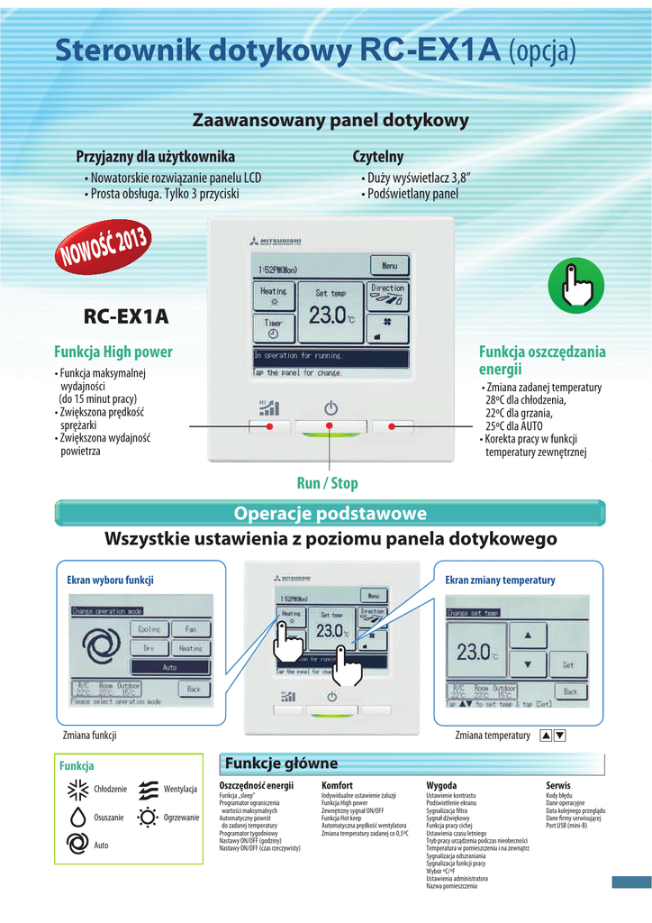 Sterownik dotykowy RC-EX1A (opcja) Zaawansowany panel dotykowy Przyjazny dla użytkownika Czytelny • Nowatorskie rozwiązanie panelu LCD • Prosta obsługa. Tylko 3 przyciski • Duży wyświetlacz 3,8” • Podświetlany panel 3 01 2 Ć Ś O W NO RC-EX1A Funkcja High power Funkcja oszczędzania energii • Funkcja maksymalnej wydajności (do 15 minut pracy) • Zwiększona prędkość sprężarki • Zwiększona wydajność powietrza • Zmiana zadanej temperatury 28ºC dla chłodzenia, 22ºC dla grzania, 25ºC dla AUTO • Korekta pracy w funkcji temperatury zewnętrznej Run / Stop Operacje podstawowe Wszystkie ustawienia z poziomu panela dotykowego Ekran wyboru funkcji Ekran zmiany temperatury Zmiana temperatury Zmiana funkcji Funkcje główne Funkcja Chłodzenie Wentylacja Osuszanie Ogrzewanie Auto Oszczędność energii Komfort Wygoda Serwis Funkcja „sleep” Programator ograniczenia wartości maksymalnych Automatyczny powrót do zadanej temperatury Programator tygodniowy Nastawy ON/OFF (godziny) Nastawy ON/OFF (czas rzeczywisty) Indywidualne ustawienie żaluzji Funkcja High power Zewnętrzny sygnał ON/OFF Funkcja Hot keep Automatyczna prędkość wentylatora Zmiana temperatury zadanej co 0,5ºC Ustawienie kontrastu Podświetlenie ekranu Sygnalizacja filtra Sygnał dźwiękowy Funkcja pracy cichej Ustawienia czasu letniego Tryb pracy urządzenia podczas nieobecności Temperatura w pomieszczeniu i na zewnątrz Sygnalizacja odszraniania Sygnalizacja funkcji pracy Wybór ºC/ºF Ustawienia administratora Nazwa pomieszczenia Kody błędu Dane operacyjne Data kolejnego przeglądu Dane firmy serwisującej Port USB (mini-B)
