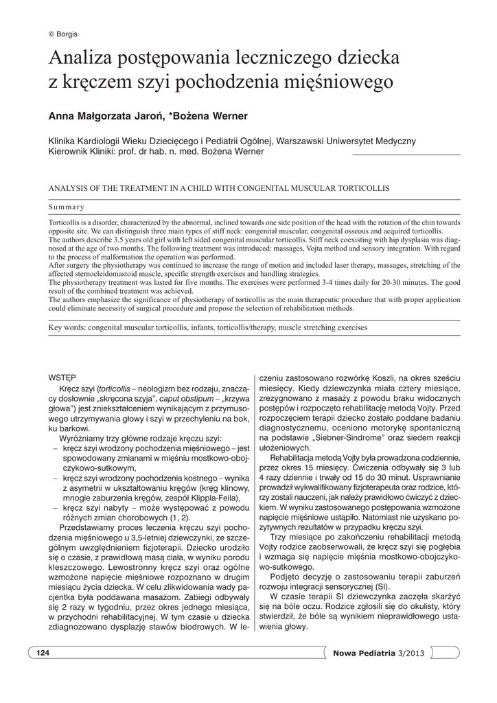 © Borgis Analiza postępowania leczniczego dziecka z kręczem szyi pochodzenia mięśniowego Anna Małgorzata Jaroń, *Bożena Werner Klinika Kardiologii Wieku Dziecięcego i Pediatrii Ogólnej, Warszawski Uniwersytet Medyczny Kierownik Kliniki: prof. dr hab. n. med. Bożena Werner Analysis of the treatment in a child with congenital muscular torticollis Summary Torticollis is a disorder, characterized by the abnormal, inclined towards one side position of the head with the rotation of the chin towards opposite site. We can distinguish three main types of stiff neck: congenital muscular, congenital osseous and acquired torticollis. The authors describe 3.5 years old girl with left sided congenital muscular torticollis. Stiff neck coexisting with hip dysplasia was diagnosed at the age of two months. The following treatment was introduced: massages, Vojta method and sensory integration. With regard to the process of malformation the operation was performed. After surgery the physiotherapy was continued to increase the range of motion and included laser therapy, massages, stretching of the affected sternocleidomastoid muscle, specific strength exercises and handling strategies. The physiotherapy treatment was lasted for five months. The exercises were performed 3-4 times daily for 20-30 minutes. The good result of the combined treatment was achieved. The authors emphasize the significance of physiotherapy of torticollis as the main therapeutic procedure that with proper application could eliminate necessity of surgical procedure and propose the selection of rehabilitation methods. Key words: congenital muscular torticollis, infants, torticollis/therapy, muscle stretching exercises Wstęp Kręcz szyi (torticollis – neologizm bez rodzaju, znaczący dosłownie „skręcona szyja”, caput obstipum – „krzywa głowa”) jest zniekształceniem wynikającym z przymusowego utrzymywania głowy i szyi w przechyleniu na bok, ku barkowi. Wyróżniamy trzy główne rodzaje kręczu szyi: – kręcz szyi wrodzony pochodzenia mięśniowego – jest spowodowany zmianami w mięśniu mostkowo-obojczykowo-sutkowym, – kręcz szyi wrodzony pochodzenia kostnego – wynika z asymetrii w ukształtowaniu kręgów (kręg klinowy, mnogie zaburzenia kręgów, zespół Klippla-Feila), – kręcz szyi nabyty – może występować z powodu różnych zmian chorobowych (1, 2). Przedstawiamy proces leczenia kręczu szyi pochodzenia mięśniowego u 3,5-letniej dziewczynki, ze szczególnym uwzględnieniem fizjoterapii. Dziecko urodziło się o czasie, z prawidłową masą ciała, w wyniku porodu kleszczowego. Lewostronny kręcz szyi oraz ogólne wzmożone napięcie mięśniowe rozpoznano w drugim miesiącu życia dziecka. W celu zlikwidowania wady pacjentka była poddawana masażom. Zabiegi odbywały się 2 razy w tygodniu, przez okres jednego miesiąca, w przychodni rehabilitacyjnej. W tym czasie u dziecka zdiagnozowano dysplazję stawów biodrowych. W le124 czeniu zastosowano rozwórkę Koszli, na okres sześciu miesięcy. Kiedy dziewczynka miała cztery miesiące, zrezygnowano z masaży z powodu braku widocznych postępów i rozpoczęto rehabilitację metodą Vojty. Przed rozpoczęciem terapii dziecko zostało poddane badaniu diagnostycznemu, oceniono motorykę spontaniczną na podstawie „Siebner‑Sindrome” oraz siedem reakcji ułożeniowych. Rehabilitacja metodą Vojty była prowadzona codziennie, przez okres 15 miesięcy. Ćwiczenia odbywały się 3 lub 4 razy dziennie i trwały od 15 do 30 minut. Usprawnianie prowadził wykwalifikowany fizjoterapeuta oraz rodzice, którzy zostali nauczeni, jak należy prawidłowo ćwiczyć z dzieckiem. W wyniku zastosowanego postępowania wzmożone napięcie mięśniowe ustąpiło. Natomiast nie uzyskano pozytywnych rezultatów w przypadku kręczu szyi. Trzy miesiące po zakończeniu rehabilitacji metodą Vojty rodzice zaobserwowali, że kręcz szyi się pogłębia i wzmaga się napięcie mięśnia mostkowo‑obojczykowo‑sutkowego. Podjęto decyzję o zastosowaniu terapii zaburzeń rozwoju integracji sensorycznej (SI). W czasie terapii SI dziewczynka zaczęła skarżyć się na bóle oczu. Rodzice zgłosili się do okulisty, który stwierdził, że bóle są wynikiem nieprawidłowego ustawienia głowy. Nowa Pediatria 3/2013 Analiza postępowania leczniczego dziecka z kręczem szyi pochodzenia mięśniowego Dziewczynka w wieku 2 lata i 10 miesięcy została zakwalifikowana do zabiegu operacyjnego przecięcia przyczepów mięśnia mostkowo‑obojczykowo-sutkowego. Po operacji założono pacjentce kołnierz Campa i zalecono jego stosowanie 24 godziny na dobę. Kołnierz zdejmowano tylko na czas kąpieli. Po 10 dniach usunięto szwy i dziewczynkę skierowano do fizjoterapeuty. Celem rehabilitacji było wzmocnienie mięśni szyi, rozluźnienie napiętej strony szyi oraz uelastycznienie blizn pooperacyjnych. Fizjoterapeuta przedstawił rodzicom plan usprawniania: – biostymulację laserową mięśnia mostkowo-obojczykowo-sutkowego (widmo światła czerwonego), – masaż mięśnia mostkowo-obojczykowo-sutkowego, – masaż rozluźniający mięśni szyi, – masaż poprzeczny blizn pooperacyjnych, – ćwiczenia redresyjne szyi, – ćwiczenia rozciągające mięśnie szyi, – ćwiczenia wzmacniające mięśnie szyi. Rehabilitacja była prowadzona codziennie. Przez pierwsze 2 tygodnie ćwiczenia odbywały się 3 razy dziennie po 15 minut i były wykonywane przez fizjoterapeutę oraz rodziców. Po wypisaniu dziewczynki ze szpitala ćwiczenia były kontynuowane, przez kolejne 14 dni, w ten sam sposób, jedynie zwiększono ich liczbę powtórzeń (4 razy dziennie po 20 minut). Po 4 tygodniach od operacji fizjoterapeuta przeprowadził ocenę: – napięcia lewego mięśnia mostkowo-obojczykowo-sutkowego – stwierdzając nieznaczne wzmożenie w porównaniu do prawego (zdrowego) mięśnia mostkowo-obojczykowo-sutkowego, – symetrycznego ustawienia głowy – dziewczynka czynnie k
