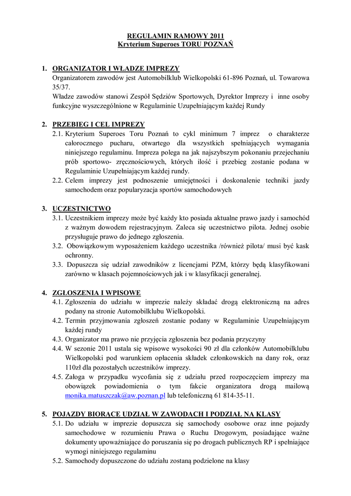 REGULAMIN RAMOWY 2011 Kryterium Superoes TORU POZNAŃ 1. ORGANIZATOR I WŁADZE IMPREZY Organizatorem zawodów jest Automobilklub Wielkopolski 61-896 Poznań, ul. Towarowa 35/37. Władze zawodów stanowi Zespół Sędziów Sportowych, Dyrektor Imprezy i inne osoby funkcyjne wyszczególnione w Regulaminie Uzupełniającym każdej Rundy 2. PRZEBIEG I CEL IMPREZY 2.1. Kryterium Superoes Toru Poznań to cykl minimum 7 imprez o charakterze całorocznego pucharu, otwartego dla wszystkich spełniających wymagania niniejszego regulaminu. Impreza polega na jak najszybszym pokonaniu przejechaniu prób sportowo- zręcznościowych, których ilość i przebieg zostanie podana w Regulaminie Uzupełniającym każdej rundy. 2.2. Celem imprezy jest podnoszenie umiejętności i doskonalenie techniki jazdy samochodem oraz popularyzacja sportów samochodowych 3. UCZESTNICTWO 3.1. Uczestnikiem imprezy może być każdy kto posiada aktualne prawo jazdy i samochód z ważnym dowodem rejestracyjnym. Zaleca się uczestnictwo pilota. Jednej osobie przysługuje prawo do jednego zgłoszenia. 3.2. Obowiązkowym wyposażeniem każdego uczestnika /również pilota/ musi być kask ochronny. 3.3. Dopuszcza się udział zawodników z licencjami PZM, którzy będą klasyfikowani zarówno w klasach pojemnościowych jak i w klasyfikacji generalnej. 4. ZGŁOSZENIA I WPISOWE 4.1. Zgłoszenia do udziału w imprezie należy składać drogą elektroniczną na adres podany na stronie Automobilklubu Wielkopolski. 4.2. Termin przyjmowania zgłoszeń zostanie podany w Regulaminie Uzupełniającym każdej rundy 4.3. Organizator ma prawo nie przyjęcia zgłoszenia bez podania przyczyny 4.4. W sezonie 2011 ustala się wpisowe wysokości 90 zł dla członków Automobilklubu Wielkopolski pod warunkiem opłacenia składek członkowskich na dany rok, oraz 110zł dla pozostałych uczestników imprezy. 4.5. Załoga w przypadku wycofania się z udziału przed rozpoczęciem imprezy ma obowiązek powiadomienia o tym fakcie organizatora drogą mailową [email protected] lub telefoniczną 61 814-35-11. 5. POJAZDY BIORĄCE UDZIAŁ W ZAWODACH I PODZIAŁ NA KLASY 5.1. Do udziału w imprezie dopuszcza się samochody osobowe oraz inne pojazdy samochodowe w rozumieniu Prawa o Ruchu Drogowym, posiadające ważne dokumenty upoważniające do poruszania się po drogach publicznych RP i spełniające wymogi niniejszego regulaminu 5.2. Samochody dopuszczone do udziału zostaną podzielone na klasy 1 klasa – do 1000 ccm 2 klasa – powyżej 1000 ccm do 1300 ccm 3 klasa – powyżej 1300 ccm do 1600 ccm 4 klasa – powyżej 1600 ccm do 2000 ccm 5 klasa – powyżej 2000 ccm FWD i RWD (z napędem na jedną oś) 6 klasa – powyżej 2000 ccm AWD (z napędem na obie osie) 5.3. Dopuszcza się wprowadzenie dodatkowych klasyfikacji. 5.4. Samochody posiadające turbodoładowanie zostaną dopuszczone do startu w klasie pojemnościowej wynikającej z pomnożenia nominalnej pojemności silnika przez współczynnik 1,7 dla silników benzynowych i 1,5 dla silników diesla. Samochody wyposażone w silnik z tłokiem obrotowym (Wankla) zostaną przydzielone do 5 lub 6 klasy 6. BADANIE KONTROLNE (BK) 6.1. Samochody zgłoszone do zawodów muszą być przedstawione do kontroli w miejscu i czasie podanym przez organizatora w Regulaminie Uzupełniającym każdej rundy. Po tym terminie BK w uzasadnionych przypadkach będzie możliwe do przeprowadzenia tylko za zgodą Dyrektora Imprezy 6.2. Uczestnicy są zobowiązani do pobrania ze strony www.aw.poznan.pl karty BK Wymaga się aby uczestnicy na BK podjeżdżali z wypełnioną kartą danymi osobowymi oraz pojazdu wymaganymi w/w druku. W czasie BK musi być obecny kierowca 6.3. Samochód nie spełniający wymogów regulaminu nie będzie dopuszczony do startu 6.4. Samochód musi być sprawny technicznie, a kierowca zobowiązany jest przedstawić wszystkie dokumenty uprawniające do prowadzenia pojazdu i dopuszczające do ruchu po drogach publicznych prawo jazdy ubezpieczenie OC i NNW (NW zalecane) dowód rejestracyjny samochodu z ważnymi badaniami technicznymi pisemna zgoda właściciela na użyczenie auta w przypadku korzystania z samochodu nie będącego własnością kierowcy. 6.5. W czasie BK kierowca musi okazać kask ochronny typu używanego w sportach motorowych dla siebie i pilota 6.6. Samochód musi być czysty zarówno na zewnątrz jak i wewnątrz oraz posiadać czystą komorę silnika 6.7. W ramach BK będzie się odbywał pomiar głośności aut. Hałas nie może przekraczać 96dB przy 3500 obrotów silnika OPONY – dowolny rodzaj opon za wyjątkiem opon kolcowanych 7. OBOWIĄZKI STARTUJĄCYCH 7.1. Przez podpisanie zgłoszenia startujący zobowiązuje się do całkowitego podporządkowania przepisom regulaminu oraz poleceniom i instrukcjom wydanym przez kierownictwo imprezy zarówno poprzez komunikaty jak i inne formy przekazu 7.2. Pod rygorem niedopuszczenia do startu lub wykluczenia startujący zobowiązany jest do: wypełnienia i podpisania zgłoszenia udziału w imprezie wniesienia opłaty wpisowego obecności na odprawie zawodników i zgłoszenia się do BK samochód podczas imprezy musi być oznakowany numerem startowym oraz wymaganą reklamą obowiązkową jazdy w zapiętych pasach bezpieczeństwa jazdy w zapiętych kaskach ochronnych przejazdy prób na włączonych światłach sportowego zachowania się podczas trwania imprezy poruszania się wyłącznie wyznaczonymi przez organizatora trasach prób drogach dojazdowych do prób oraz odcinku testowym. 7.3. Pilot nie może prowadzić pojazdu podczas próby. Dopuszcza się przejazd maksymalnie dwóch uczestników jednym pojazdem na podstawie osobnego zgłoszenia 8. DYSCYPLINA PODCZAS TRWANIA IMPREZY 8.1. Organizator może ukarać uczestnika za brak dyscypliny sportowej. Za niesportowe zachowanie, nie stosowanie się do poleceń kierownictwa imprezy lub innych osób funkcyjnych – upomnieniem, karą finansową, a w przypadkach drastycznych wykluczeniem z imprezy 