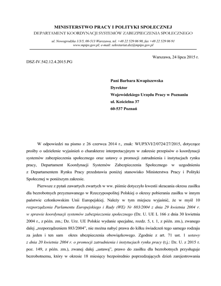 MINISTERSTWO PRACY I POLITYKI SPOŁECZNEJ DEPARTAMENT KOORDYNACJI SYSTEMÓW ZABEZPIECZENIA SPOŁECZNEGO ul. Nowogrodzka 1/3/5, 00-513 Warszawa, tel. +48 22 529 06 90, fax +48 22 529 06 91 www.mpips.gov.pl; e-mail: [email protected] Warszawa, 24 lipca 2015 r. DSZ-IV.542.12.4.2015.PG Pani Barbara Kwapiszewska Dyrektor Wojewódzkiego Urzędu Pracy w Poznaniu ul. Kościelna 37 60-537 Poznań W odpowiedzi na pismo z 26 czerwca 2014 r., znak: WUPXVI/2/0724/27/2015, dotyczące prośby o udzielenie wyjaśnień o charakterze interpretacyjnym w zakresie przepisów o koordynacji systemów zabezpieczenia społecznego oraz ustawy o promocji zatrudnienia i instytucjach rynku pracy, Departament Koordynacji Systemów Zabezpieczenia Społecznego w uzgodnieniu z Departamentem Rynku Pracy przedstawia poniżej stanowisko Ministerstwa Pracy i Polityki Społecznej w poniższym zakresie. Pierwsze z pytań zawartych zwartych w ww. piśmie dotyczyło kwestii skracania okresu zasiłku dla bezrobotnych przyznawanego w Rzeczypospolitej Polskiej o okresy pobierania zasiłku w innym państwie członkowskim Unii Europejskiej. Należy w tym miejscu wyjaśnić, że w myśl 10 rozporządzenia Parlamentu Europejskiego i Rady (WE) Nr 883/2004 z dnia 29 kwietnia 2004 r. w sprawie koordynacji systemów zabezpieczenia społecznego (Dz. U. UE L 166 z dnia 30 kwietnia 2004 r., z późn. zm.; Dz. Urz. UE Polskie wydanie specjalne, rozdz. 5, t. 1, z późn. zm.), zwanego dalej „rozporządzeniem 883/2004”, nie można nabyć prawa do kilku świadczeń tego samego rodzaju za jeden i ten sam okres ubezpieczenia obowiązkowego. Zgodnie z art. 71 ust. 1 ustawy z dnia 20 kwietnia 2004 r. o promocji zatrudnienia i instytucjach rynku pracy (t.j.: Dz. U. z 2015 r. poz. 149, z późn. zm.), zwanej dalej „ustawą”, prawo do zasiłku dla bezrobotnych przysługuje bezrobotnemu, który w okresie 18 miesięcy bezpośrednio poprzedzających dzień zarejestrowania w powiatowym urzędzie pracy był zatrudniony lub ubezpieczony łącznie przez co najmniej 365 dni. W opisanej w ww. piśmie przykładowej sytuacji bezrobotny, po okresie pobierania zasiłku dla bezrobotnych w innym państwie członkowskim Unii Europejskiej, był zatrudniony w tym państwie przez okres równy lub dłuższy niż 365 dni. Oznacza to, że okres zatrudnienia spełniony za granicą po zakończeniu pobierania zasiłku dla bezrobotnych w innym państwie jest wystarczający, zgodnie z art. 71 ust. 1 ustawy, do nabycia nowego prawa do zasiłku dla bezrobotnych w Rzeczypospolitej Polskiej. W takim przypadku nie ma zastosowania art. 10 rozporządzenia 883/2004, a tym samym zasiłek dla bezrobotnych w Rzeczypospolitej Polskiej nie powinien zostać skrócony o okres pobierania przez bezrobotnego zasiłku w innym państwie członkowskim Unii Europejskiej. Drugie z pytań zawartych w ww. piśmie dotyczyło interpretacji art. 73 ust. 5 ustawy, który stanowi, że bezrobotny, który utracił status bezrobotnego na okres krótszy niż 365 dni z powodu podjęcia zatrudnienia (…) i zarejestrował się w powiatowym urzędzie pracy jako bezrobotny w okresie 14 dni od dnia ustania zatrudnienia, (…) pobierania po ustaniu zatrudnienia zasiłku chorobowego, macierzyńskiego lub zasiłku w wysokości zasiłku macierzyńskiego, (…), posiada prawo do zasiłku na czas skrócony o okres pobierania zasiłku przed utratą statusu bezrobotnego oraz o okresy zatrudnienia w ramach prac interwencyjnych, robót publicznych oraz o okres odbywania stażu, szkolenia lub przygotowania zawodowego dorosłych przypadających na okres, w którym przysługiwałby zasiłek, oraz o okresy nieprzysługiwania zasiłku. Dla kwestii powrotu na zasiłek na okres skrócony w trybie ww. przepisu pozbawienie statusu bezrobotnego musi pozostawać w związku przyczynowym z podjęciem zatrudnienia natomiast fakt, że podjęcie zatrudnienia nastąpiło po upływie 14 dni od utraty statusu bezrobotnego nie ma samo w sobie znaczenia. Mogło się bowiem zdarzyć, że do podjęcia pracy doszło nieco później niż przewidywał bezrobotny. Odnosząc się do pytania trzeciego, należy zauważyć, że zgodnie z przyjętą przez Departament Rynku Pracy interpretacją przepisu art. 73 ust. 1 pkt 2 lit. b ustawy ukończenie 50. roku życia w trakcie karencji przy jednoczesnym legitymowaniu się co najmniej 20 letnim okresem uprawniającym do zasiłku na dzień rejestracji jako bezrobotny - umożliwia (po zakończeniu karencji) przyznanie zasiłku na 365 dni. W odniesieniu do pytania czwartego należy zauważyć, że zgodnie z art. 22 ust. 1 ustawy z dnia 14 marca 2014 r. o zmianie ustawy o promocji zatrudnienia i instytucjach rynku pracy oraz niektórych innych ustaw (Dz. U. z 2014 r. poz. 598) zasiłki dla bezrobotnych przyznane przed dniem wejścia w życie tej ustawy są wypłacane przez okres wynikający z przepisów dotychczasowych. W związku z ww. przepisem niewykorzystany przez bezrobotnego zasiłek będzie po nowelizacji 2 ustawy wypłacany na starych zasadach tj. przez okres 6 lub 12 miesięcy. Przerwanie jego pobierania i następnie przyznanie zasiłku ponownie na uzupełnienie na mocy art. 73 ust. 5 lub art. 73 ust. 7 ustawy również odbędzie się na starych zasadach, czyli do wyczerpania pierwotnego 6 lub 12 miesięcy. Zastępca Dyrektora Departamentu Koordynacji Systemów Zabezpieczenia Społecznego Michał Drozdowicz (-) 3
