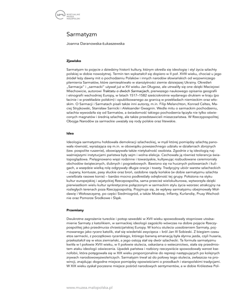 Sarmatyzm Joanna Daranowska-Łukaszewska Zjawisko Sarmatyzm to pojęcie z dziedziny historii kultury, którym określa się ideologię i styl życia szlachty polskiej w dobie nowożytnej. Termin ten wykształcił się dopiero w II poł. XVIII wieku, chociaż u jego źródeł leży dawny mit o pochodzeniu Polaków i innych narodów słowiańskich od wojowniczego plemienia Sarmatów, które zamieszkiwało w starożytności ziemie dzisiejszej Ukrainy. Określeń „Sarmacja” i „sarmacki” używał już w XV wieku Jan Długosz, ale utrwaliły się one dzięki Maciejowi Miechowicie, autorowi Traktatu o dwóch Sarmacjach, pierwszego naukowego opisania geografii i etnografii wschodniej Europy, w latach 1517–1582 sześciokrotnie wydanego drukiem w kraju (po łacinie i w przekładzie polskim) i opublikowanego za granicą w przekładach niemieckim oraz włoskim. O Sarmacji i Sarmatach pisali także inni autorzy, m.in. Filip Melanchton, Konrad Celtes, Maciej Stryjkowski, Stanisław Sarnicki i Aleksander Gwagnin. Wedle mitu o sarmackim pochodzeniu, szlachta wywodziła się od Sarmatów, a świadomość takiego pochodzenia łączyła nie tylko oświeconych magnatów i średnią szlachtę, ale także przedstawicieli mieszczaństwa. W Rzeczypospolitej Obojga Narodów za sarmackie uważały się rody polskie oraz litewskie. Idea Ideologia sarmatyzmu hołdowała demokracji szlacheckiej, w myśl której pomiędzy szlachtą panowała równość, wyrażająca się m.in. w obowiązku powszechnego udziału w działaniach zbrojnych (tzw. pospolite ruszenie), obowiązywała także nietykalność osobista. Zgodnie z tą ideologią najważniejszymi instytucjami państwa były sejm i wolna elekcja. Cechowała ją również tolerancja światopoglądowa. Pielęgnowano więzi rodzinne i towarzyskie, kultywując rozbudowane ceremioniały obchodów świątecznych, ślubnych i pogrzebowych. Bawiono się na hucznych polowaniach i kuligach, a wszędzie wielką rolę odgrywały długie oracje i toasty. Tradycyjny ubiór warstw szlacheckich – żupany, kontusze, pasy słuckie oraz broń, ozdobne rzędy końskie (w dobie sarmatyzmu szlachta uwielbiała rasowe konie) – bardzo mocno podkreślały odrębność tej grupy. Położona na styku kultur europejskiej i azjatyckiej Rzeczpospolita, sama przecież wielokulturowa, wytworzyła dzięki pierwiastkom wielu kultur synkretycznie połączonym w sarmackim stylu życia wzorzec atrakcyjny na rozległych terenach poza Rzeczypospolitą. Przyjmuje się, że wpływy sarmatyzmu obejmowały Mołdawię i Wołoszczyznę, po części Siedmiogród, a także Moskwę, Inflanty, Kurlandię, Prusy Wschodnie oraz Pomorze Środkowe i Śląsk. Przemiany Dwukrotne zagrożenie tureckie i potop szwedzki w XVII wieku spowodowały stopniowe utożsamienie Sarmaty z katolikiem, w sarmackiej ideologii zagościło wówczas na dobre pojęcie Rzeczypospolitej jako przedmurza chrześcijańskiej Europy. W końcu stulecia uosobieniem Sarmaty, pojmowanego jako rycerz katolik, stał się wiedeński zwycięzca – król Jan III Sobieski. Z biegiem czasu etos sarmacki, z początkowo rycerskiego, którego barwną emanacją była słynna jazda, czyli husaria, przekształcił się w etos ziemiański, a jego ostoją stał się dwór szlachecki. Ta formuła sarmatyzmu kwitła w I połowie XVIII wieku, w II połowie stulecia, oskarżana o wstecznictwo, stała się przedmiotem ataku ideologii oświecenia. Upadek państwa i rozbiory rzeczywiście spowodowały wzrost ksenofobii, która potęgowała się w XIX wieku proporcjonalnie do represji następujących po kolejnych zrywach narodowowyzwoleńczych. Sarmatyzm trwał aż do połowy tego stulecia, zwłaszcza na prowincji, znajdując dogodne miejsce pomiędzy opowieściami o przodkach i staropolskimi tradycjami. W XIX wieku zyskał poczesne miejsce pośród narodowych sentymentów, a w dobie Królestwa Pol- www.muzea.malopolska.pl skiego zrodził się nawet w kulturze polskiej nurt neosarmacki. I to dzięki niemu, w dużym stopniu, przetrwała więź narodowa pozwalająca na restytucję państwowości. Dziedzictwo W XX wieku, zwłaszcza po II wojnie światowej, chętnie przyjmowano oświeceniową wizję sarmatyzmu, podkreślając jego konserwatyzm, awanturnictwo i nadmierną dewocję, a szlachcica Sarmatę przedstawiając jako nadużywającego prawa do liberum veto pijanego warchoła. W ostatnich latach ta stereotypowa ocena ulega przewartościowaniu. Dostrzega się, że sarmatyzm zmieniał się z biegiem lat. Od początku rozwijający cechy społeczeństwa obywatelskiego, kształtujący patriotyzm i odznaczający się tolerancją, pielęgnował wolność osobistą, co z czasem stało się przyczyną anarchizacji życia społecznego. Dobrze oddaje tę przemianę esej Tadeusza Chrzanowskiego Od klejnotu swobodnego sumienia do złotej wolności. W dzisiejszym społeczeństwie epoka sarmatyzmu to ten okres w dziejach państwa i narodu, do którego odwołujemy się najchętniej. I zapewne nie tylko z powodu ówczesnej potęgi Rzeczypospolitej i wystawnej barwności życia Sarmatów. Dzieje się tak przede wszystkim dlatego, że w epoce sarmackiej znajduje się źródło i matecznik naszej dumy narodowej. Linki dodatkowe: http://staropolska.pl/barok/opracowania/sarmatyzm.html (główne idee polskiego sarmatyzmu, oprac. R. Mazurkiewicz) http://wielkisobieski.pl/index.php?option=com_content&task=view&id=169&Itemid=1 http://archiwum.wiz.pl/1996/96053700.asp (Sarmatyzm – Łukasz Kądziela, artykuł z WiŻ) Bibliografia: T. Chrzanowski, Wędrówki po Sarmacji Europejskiej, Kraków 1988. J. Tazbir, Polska XVII wieku, Warszawa 1974. J. Tazbir, Kultura szlachecka w Polsce, Warszawa 1983. J.S. Bystroń, Dzieje obyczajów w dawnej Polsce, Warszawa 1960. Z. Gloger, Encyklopedia staropolska, Warszawa 1972. Cz. Hernas, Barok, Warszawa 1980. Słownik sarmatyzmu, red. A. Borowski, Kraków 2001. Rzeźba „Husarz siedzący na koniu” Leona Wyczółkowskiego, projektu Jana Matejki Mu