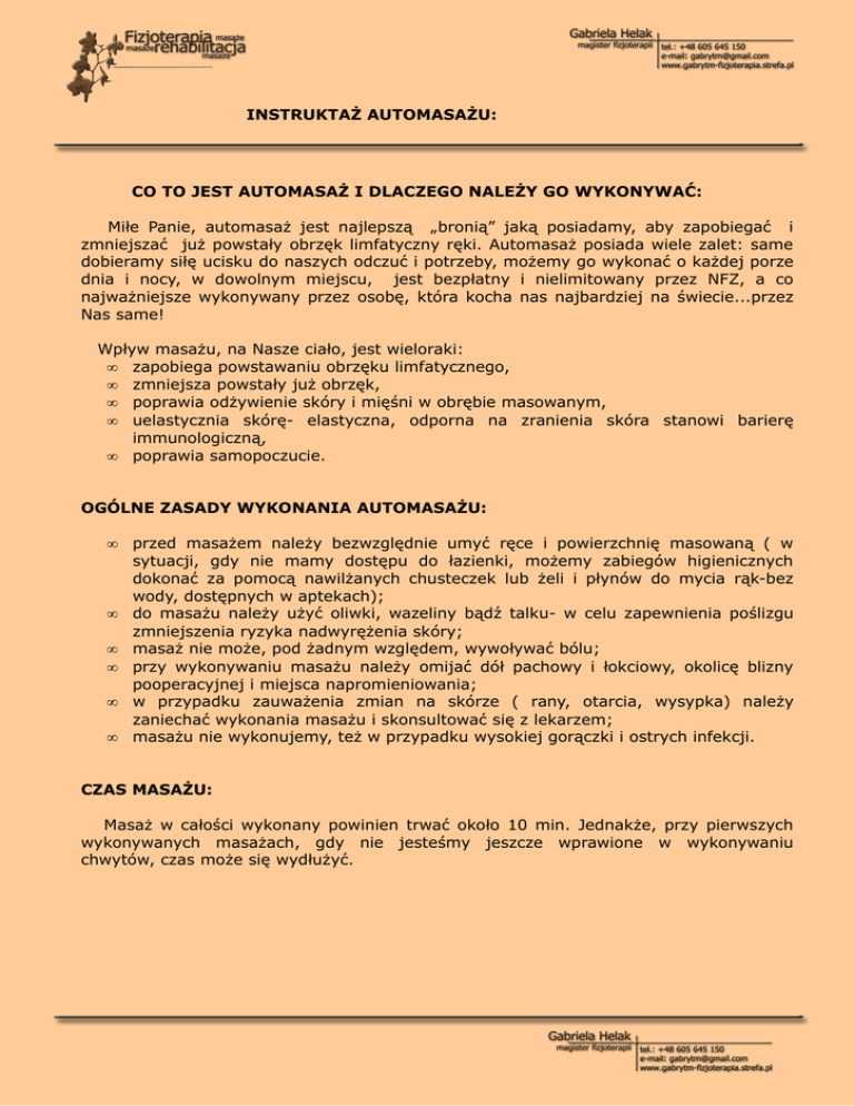 INSTRUKTAŻ AUTOMASAŻU: CO TO JEST AUTOMASAŻ I DLACZEGO NALEŻY GO WYKONYWAĆ: Miłe Panie, automasaż jest najlepszą „bronią” jaką posiadamy, aby zapobiegać i zmniejszać już powstały obrzęk limfatyczny ręki. Automasaż posiada wiele zalet: same dobieramy siłę ucisku do naszych odczuć i potrzeby, możemy go wykonać o każdej porze dnia i nocy, w dowolnym miejscu, jest bezpłatny i nielimitowany przez NFZ, a co najważniejsze wykonywany przez osobę, która kocha nas najbardziej na świecie...przez Nas same! Wpływ masażu, na Nasze ciało, jest wieloraki: • zapobiega powstawaniu obrzęku limfatycznego, • zmniejsza powstały już obrzęk, • poprawia odżywienie skóry i mięśni w obrębie masowanym, • uelastycznia skórę- elastyczna, odporna na zranienia skóra stanowi barierę immunologiczną, • poprawia samopoczucie. OGÓLNE ZASADY WYKONANIA AUTOMASAŻU: • • • • • • przed masażem należy bezwzględnie umyć ręce i powierzchnię masowaną ( w sytuacji, gdy nie mamy dostępu do łazienki, możemy zabiegów higienicznych dokonać za pomocą nawilżanych chusteczek lub żeli i płynów do mycia rąk-bez wody, dostępnych w aptekach); do masażu należy użyć oliwki, wazeliny bądź talku- w celu zapewnienia poślizgu zmniejszenia ryzyka nadwyrężenia skóry; masaż nie może, pod żadnym względem, wywoływać bólu; przy wykonywaniu masażu należy omijać dół pachowy i łokciowy, okolicę blizny pooperacyjnej i miejsca napromieniowania; w przypadku zauważenia zmian na skórze ( rany, otarcia, wysypka) należy zaniechać wykonania masażu i skonsultować się z lekarzem; masażu nie wykonujemy, też w przypadku wysokiej gorączki i ostrych infekcji. CZAS MASAŻU: Masaż w całości wykonany powinien trwać około 10 min. Jednakże, przy pierwszych wykonywanych masażach, gdy nie jesteśmy jeszcze wprawione w wykonywaniu chwytów, czas może się wydłużyć. JAK CZĘSTO WYKONYWAĆ MASAŻ: Częstotliwość wykonania masażu zależy przede wszystkim od potrzeb jakie stwarza Nasze ciało. Zasadą jest, aby automasaż stosować, nie tylko w przypadku powstałego już obrzęku limfatycznego, ale również w jego profilaktyce. Ideałem byłoby wykonywać masaż codziennie. Wszystkie jednak wiemy, że rzeczywistość często mija się z założeniami, więc starajmy się wykonywać automasaż jak najczęściej. Gdyby jednak, zdarzyło się tak, że pomimo potrzeby wykonania automasażu, w natłoku obowiązków, zabraknie Wam czasu lub miejsca na pełen automasaż, to pamiętajcie ,że zawsze możecie wykonać wybrane jego elementy, które również przyniosą korzyść dla Waszego zdrowia i samopoczucia. JAKĄ POZYCJĘ PRZYJĄĆ DO MASAŻU: Podstawową zasadą jest dobranie takiej pozycji, która nie będzie nas ograniczać, w której będziemy się czuć swobodnie i bezpiecznie, umożliwi rozluźnienie mięśni masowanej ręki. Najdogodniejszą jest pozycja siedząca z oparciem lub leżąc na plecach. W tej pozycji zapewniamy wysokie ułożenie ręki masowanej, swobodnie opartej na: klinie, poduszkach, oparciu kanapy, oparciu krzesła. W związku z użyciem do masażu substancji poślizgowych, które mogą brudzić zalecam przed masażem zabezpieczyć powierzchnię, na której spoczywa ręka masowana. KIERUNKI WYKONYWANIA MASAŻU: Wszystkie ruchy w automasażu wykonujemy wzdłuż naczyń limfatycznych- wzdłuż kończyny, rozpoczynając od dalszych części ciała w kierunku dosercowym. Dla ułatwienia podzielmy sobie masowaną powierzchnię na sektory: sektor I: klatka piersiowa (kierunek wykonywanych ruchów: od barku do mostka), sektor II: ramię ( kierunek wykonywanych ruchów: od łokcia do barku), sektor III: przedramię ( kierunek wykonywanych ruchów: od nadgarstka do łokcia), sektor IV: dłoń i palce (kierunek wykonywanych ruchów: od zakończeń palców przez dłoń do nadgarstka). Wykonujemy każdy z opisanych poniżej chwytów kolejno w sektorach I,II,III,IV w opisanych dla nich kierunkach. Na zakończenie każdego z chwytów powtarzamy go jeszcze raz dla całej długości ręki oczywiście z zachowaniem kierunku ruchu: końce palców- dłoń- przedramie- ramie- bark- klatka piersiowa. Masaż wykonujemy na wszystkich stronach ręki. Przed rozpoczęciem masażu, zalecam wykonać 1-2 ćwiczenia oddechowe, aby uaktywnić mięśnie klatki piersiowej i usprawnić przepływ chłonki w jej obrębie. CHWYTY WYKORZYSTYWANE PODCZAS AUTOMASAŻU (wymienione w kolejności ich wykonywania): 1. Głaskanie wewnętrzną stroną dłoni. Ułożoną płasko dłoń i palce przesuwamybez nacisku kolejno w każdym sektorze,w opisanym dla niego kierunku, po zewnętrznej i wewnętrznej stronie ręki. Na zakończenie głaszczemy cała rękę w kierunku od końców palców do barku i mostka. Powtórzyć 3-4 razy dla każdego sektora, następnie wykonać jedno powtórzenie dla całej ręki. 2. Rozcieranie palcami. Opuszkami palców wykonujemy koliste ruchy ( elipsy , kółeczka). Poprzez nieodrywanie palców, pomiędzy kolejnymi kółkami, uzyskujemy ruch spiralny. W tym chwycie stosujemy nieco mocniejszy nacisk na powierzchnię masowaną, niż w przypadku głaskania. Powtórzyć 3-4 razy dla każdego sektora, następnie wykonać jedno powtórzenie dla całej ręki. 3. Rozcieranie kostkami zgiętych palców. Składamy dłoń w pięść. Masaż wykonujemy kostkami palców. Ruchy wykonujemy, takie same jak w rozcieraniu opuszkami palców. Powtórzyć 3-4 razy dla każdego sektora, następnie wykonać jedno powtórzenie dla całej ręki. 4. Głaskanie. Powtarzamy ruchy z punktu pierwszego. 5. Ugniatanie. Obejmujemy rękę tak, aby chwycić masowane mięśnie pomiędzy kciuk i resztę palców. Tak złapane mięśnie ugniatamy poprzez pulsacyjne ich ściskanie. Staramy się ugniatając przesuwać, nieprzerwanie, rękę masującą we wskazanych wyżej kierunkach. Powtórzyć 3-4 razy dla każdego sektora, następnie wykonać jedno powtórzenie dla całej ręki. 6. W