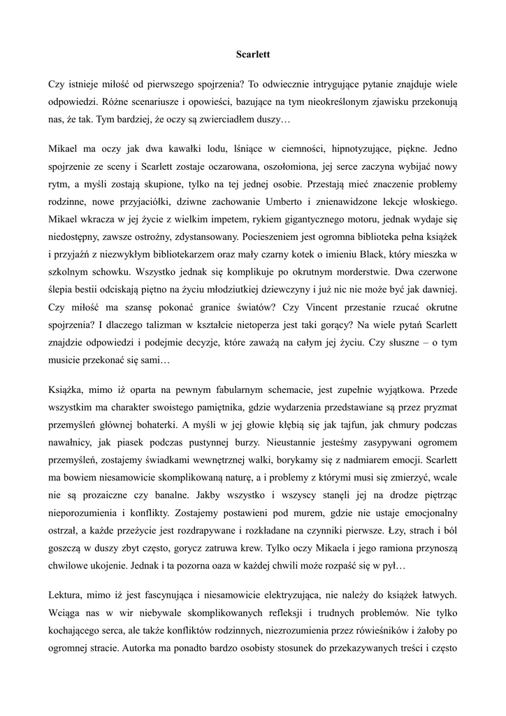 Scarlett Czy istnieje miłość od pierwszego spojrzenia? To odwiecznie intrygujące pytanie znajduje wiele odpowiedzi. Różne scenariusze i opowieści, bazujące na tym nieokreślonym zjawisku przekonują nas, że tak. Tym bardziej, że oczy są zwierciadłem duszy… Mikael ma oczy jak dwa kawałki lodu, lśniące w ciemności, hipnotyzujące, piękne. Jedno spojrzenie ze sceny i Scarlett zostaje oczarowana, oszołomiona, jej serce zaczyna wybijać nowy rytm, a myśli zostają skupione, tylko na tej jednej osobie. Przestają mieć znaczenie problemy rodzinne, nowe przyjaciółki, dziwne zachowanie Umberto i znienawidzone lekcje włoskiego. Mikael wkracza w jej życie z wielkim impetem, rykiem gigantycznego motoru, jednak wydaje się niedostępny, zawsze ostrożny, zdystansowany. Pocieszeniem jest ogromna biblioteka pełna książek i przyjaźń z niezwykłym bibliotekarzem oraz mały czarny kotek o imieniu Black, który mieszka w szkolnym schowku. Wszystko jednak się komplikuje po okrutnym morderstwie. Dwa czerwone ślepia bestii odciskają piętno na życiu młodziutkiej dziewczyny i już nic nie może być jak dawniej. Czy miłość ma szansę pokonać granice światów? Czy Vincent przestanie rzucać okrutne spojrzenia? I dlaczego talizman w kształcie nietoperza jest taki gorący? Na wiele pytań Scarlett znajdzie odpowiedzi i podejmie decyzje, które zaważą na całym jej życiu. Czy słuszne – o tym musicie przekonać się sami… Książka, mimo iż oparta na pewnym fabularnym schemacie, jest zupełnie wyjątkowa. Przede wszystkim ma charakter swoistego pamiętnika, gdzie wydarzenia przedstawiane są przez pryzmat przemyśleń głównej bohaterki. A myśli w jej głowie kłębią się jak tajfun, jak chmury podczas nawałnicy, jak piasek podczas pustynnej burzy. Nieustannie jesteśmy zasypywani ogromem przemyśleń, zostajemy świadkami wewnętrznej walki, borykamy się z nadmiarem emocji. Scarlett ma bowiem niesamowicie skomplikowaną naturę, a i problemy z którymi musi się zmierzyć, wcale nie są prozaiczne czy banalne. Jakby wszystko i wszyscy stanęli jej na drodze piętrząc nieporozumienia i konflikty. Zostajemy postawieni pod murem, gdzie nie ustaje emocjonalny ostrzał, a każde przeżycie jest rozdrapywane i rozkładane na czynniki pierwsze. Łzy, strach i ból goszczą w duszy zbyt często, gorycz zatruwa krew. Tylko oczy Mikaela i jego ramiona przynoszą chwilowe ukojenie. Jednak i ta pozorna oaza w każdej chwili może rozpaść się w pył… Lektura, mimo iż jest fascynująca i niesamowicie elektryzująca, nie należy do książek łatwych. Wciąga nas w wir niebywale skomplikowanych refleksji i trudnych problemów. Nie tylko kochającego serca, ale także konfliktów rodzinnych, niezrozumienia przez rówieśników i żałoby po ogromnej stracie. Autorka ma ponadto bardzo osobisty stosunek do przekazywanych treści i często wplata w myśli bohaterki ogrom prawd moralnych, cytatów i wiedzy. Klimat opowieści nasączony ezoteryką, motywami gotyckimi i swoistym mrokiem, przytłacza, a jednocześnie nie pozwala na rozproszenie uwagi. Zmusza do ciągłego myślenia. Jest to zabieg fantastycznie przyciągający, który nie pozwala rozstać się z opowieścią, przed jej zakończeniem. Mimo iż mamy do czynienia z elementami fantastyki ich wprowadzenie jest delikatne i zupełnie nie rozprasza ogromnego realizmu, który każe nam twardo stąpać po ziemi i dorosnąć. Przekonuje, że demony to nie tylko istoty piekielne, ale również stworzenia zamieszkujące dno naszej duszy. Polecam, jako dojrzałą, a zarazem piękną opowieść o życiu… Źródło: http://urodaizdrowie.pl/scarlett-recenzja