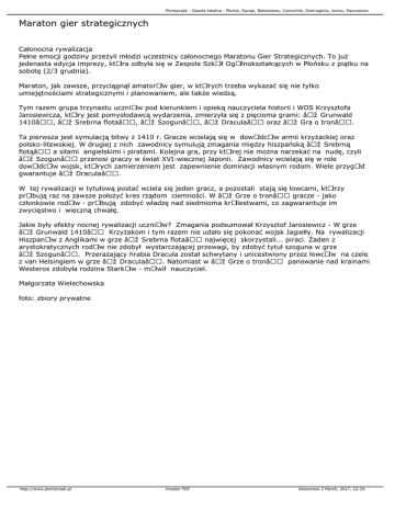Płońszczak - Gazeta lokalna - Płońsk, Raciąż, Baboszewo, Czerwińsk, Dzierzążnia, Joniec, Naruszewo Maraton gier strategicznych Całonocna rywalizacja Pełne emocji godziny przeżyli młodzi uczestnicy całonocnego Maratonu Gier Strategicznych. To już jedenasta edycja imprezy, ktÃłra odbyła się w Zespole SzkÃłł OgÃłlnokształcących w Płońsku z piątku na sobotę (2/3 grudnia). Maraton, jak zawsze, przyciągnął amatorÃłw gier, w ktÃłrych trzeba wykazać się nie tylko umiejętnościami strategicznymi i planowaniem, ale także wiedzą. Tym razem grupa trzynastu uczniÃłw pod kierunkiem i opieką nauczyciela historii i WOS Krzysztofa Jarosiewicza, ktÃłry jest pomysłodawcą wydarzenia, zmierzyła się z pięcioma grami: „Grunwald 1410―, „Srebrna flota―, „Szogun―, „Dracula― oraz „Gra o tron―. Ta pierwsza jest symulacją bitwy z 1410 r. Gracze wcielają się w dowÃłdcÃłw armii krzyżackiej oraz polsko-litewskiej. W drugiej z nich zawodnicy symulują zmagania między hiszpańską „Srebrną flotąâ€• a siłami angielskimi i piratami. Kolejna gra, przy ktÃłrej nie można narzekać na nudę, czyli „Szogun― przenosi graczy w świat XVI-wiecznej Japonii. Zawodnicy wcielają się w role dowÃłdcÃłw wojsk, ktÃłrych zamierzeniem jest zapewnienie dominacji własnym rodom. Wiele przygÃłd gwarantuje „Dracula―. W tej rywalizacji w tytułową postać wciela się jeden gracz, a pozostali stają się łowcami, ktÃłrzy prÃłbują raz na zawsze położyć kres rządom ciemności. W „Grze o tron― gracze - jako członkowie rodÃłw - prÃłbują zdobyć władzę nad siedmioma krÃłlestwami, co zagwarantuje im zwycięstwo i wieczną chwałę. Jakie były efekty nocnej rywalizacji uczniÃłw? Zmagania podsumował Krzysztof Jarosiewicz - W grze „Grunwald 1410― Krzyżakom i tym razem nie udało się pokonać wojsk Jagiełły. Na rywalizacji HiszpanÃłw z Anglikami w grze „Srebrna flota― najwięcej skorzystali... piraci. Żaden z arystokratycznych rodÃłw nie zdobył wystarczającej przewagi, by zdobyć tytuł szoguna w grze „Szogun―. Przerażający hrabia Dracula został schwytany i unicestwiony przez łowcÃłw na czele z van Helsingiem w grze „Dracula―. Natomiast w „Grze o tron― panowanie nad krainami Westeros zdobyła rodzina StarkÃłw - mÃłwił nauczyciel. Małgorzata Wielechowska foto: zbiory prywatne http://www.plonszczak.pl Kreator PDF Utworzono 2 March, 2017, 22:29