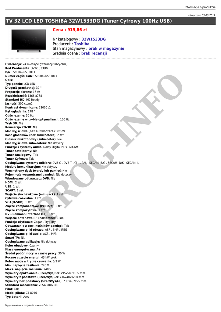 Informacje o produkcie Utworzono 03-03-2017 TV 32 LCD LED TOSHIBA 32W1533DG (Tuner Cyfrowy 100Hz USB) Cena : 915,86 zł Nr katalogowy : 32W1533DG Producent : Toshiba Stan magazynowy : brak w magazynie Średnia ocena : brak recenzji PR O G -I N FO Gwarancja: 24 miesiące gwarancji fabrycznej Kod Producenta: 32W1533DG P/N:: 5900496533011 Numer części EAN:: 5900496533011 Opis: Typ panelu: LCD LED Długość przekątnej: 32 " Proporcje ekranu: 16 :9 Rozdzielczość: 1366 x768 Standard HD: HD Ready Jasność: 300 cd/m2 Kontrast dynamiczny: 22000 :1 Kąt oglądania: 178 ° Odświeżanie: 50 Hz Odświeżanie w trybie optymalizacji: 100 Hz Tryb 3D: Nie Konwersja 2D-3D: Nie Moc wyjściowa (bez subwoofera): 2x6 W Ilość głosników (bez subwoofera): 2 szt. Głośnik niskotonowy (subwoofer): Nie Moc wyjściowa subwoofera: Nie dotyczy Funkcje i systemy audio: Dolby Digital Plus , NICAM Tuner satelitarny: Nie Tuner Analogowy: Tak Tuner Cyfrowy: Tak Obsługiwane systemy odbioru: DVB-C , DVB-T , Cl+ , PAL , SECAM -B/G , SECAM -D/K , SECAM -L Moduły komunikacyjne: Nie dotyczy Wewnętrzny dysk twardy lub pamięć: Nie Pojemność wewnętrznej pamięci: Nie dotyczy Wbudowany odtwarzacz DVD: Nie HDMI: 2 szt. USB: 1 szt. SCART: 1 szt. Wyjście słuchawkowe (mini-jack): 1 szt. Cyfrowe coaxialne: 1 szt. VGA(D-SUB): 1 szt. Złącze komponentowe (Pr/Pb/Y): 1 szt. Złącze kompozytowe: 1 szt. DVB Common Interface (CI): 1 szt. Wejście antenowe RF (naziemne): 1 szt. Funkcje użytkowe: Zegar , Tryb gry Odtwarzanie z zew. nośników pamięci: Tak Obsługiwane pliki obrazu: ASF , BMP , JPEG Obsługiwane pliki audio: AC3 , MP3 Smart TV: Nie Obsługiwane aplikacje: Nie dotyczy Kolor obudowy: Czarny Klasa energetyczna: A+ Średni pobór mocy w czasie pracy: 30 W Roczne zużycie energii: 43 kWh/rok Pobór mocy w trybie czuwania: 0,3 W Min. napięcie zasilania: 220 V Maks. napięcie zasilania: 240 V Wymiary opakowania (Szer/Wys/Gł): 795x585x165 mm Wymiary z podstawą (Szer/Wys/Gł): 736x487x230 mm Wymiary bez podstawy (Szer/Wys/Gł): 736x452x25 mm Standard mocowania: VESA 200x100 Pilot: Tak Model pilota: CT-8046 Typ baterii: AAA Wygenerowano w programie www.oscGold.com PR O G -I N FO Instrukcja obsługi: Tak Język instrukcji obsługi: polski Karta gwarancyjna: Tak Kraje objęte gwarancją: Polska Okres gwarancji: 24 mies. Zgodność z normami: Odbiornik cyfrowy jest zgodny z wymaganiami określonymi w przepisach dotyczących wymagań technicznych i eksploatacyjnych dla urządzeń konsumenckich służących do odbioru cyfrowych naziemnych transmisji telewizyjnych w tym na terytorium RP . Strona www produktu: Link