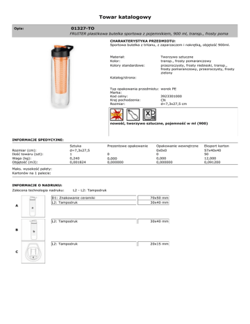 Towar katalogowy 01327-TO Opis: FRUITER plastikowa butelka sportowa z pojemnikiem, 900 ml, transp., frosty poma CHARAKTERYSTYKA PRZEDMIOTU: Sportowa butelka z tritanu, z zaparzaczem i nakrętką, objętość 900ml. Materiał: Kolor: Kolory standardowe: Tworzywo sztuczne transp., frosty pomaranczowy przezroczysty, frosty niebieski, transp., frosty pomaranczowy, przezroczysty, frosty zielony Katalog/strona: Typ opakowania przedmiotu: Marka: Kod celny: Kraj pochodzenia: Rozmiar: worek PE 3923301000 CN d=7,3x27,5 cm nowość, tworzywo sztuczne, pojemność w ml (900) INFORMACJE SPEDYCYJNE: Sztuka d=7,3x27,5 1 0,240 0,001824 Rozmiar (cm): Ilość towaru (szt): Waga (kg): Objętość (m3): Prezentowe opakowanie 0 0,000 0,000000 Opakowanie wewnętrzne 0x0x0 0 0,000 0,000000 Maks. wysokość palety: Kartonów na 1 palecie: INFORMACJE O NADRUKU: Zalecona technologia nadruku: L2 - L2: Tampodruk D1: Znakowanie ceramiki A L2: Tampodruk 70x50 mm 30x40 mm L2: Tampodruk 30x40 mm L2: Tampodruk 20x15 mm B C Eksport karton 57x40x40 50 12,000 0,091200