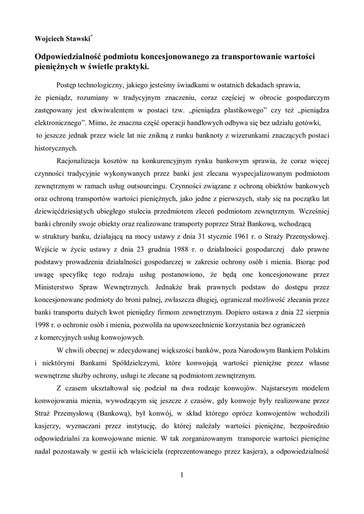 Wojciech Stawski* Odpowiedzialność podmiotu koncesjonowanego za transportowanie wartości pieniężnych w świetle praktyki. Postęp technologiczny, jakiego jesteśmy świadkami w ostatnich dekadach sprawia, że pieniądz, rozumiany w tradycyjnym znaczeniu, coraz częściej w obrocie gospodarczym zastępowany jest ekwiwalentem w postaci tzw. „pieniądza plastikowego” czy też „pieniądza elektronicznego”. Mimo, że znaczna część operacji handlowych odbywa się bez udziału gotówki, to jeszcze jednak przez wiele lat nie znikną z runku banknoty z wizerunkami znaczących postaci historycznych. Racjonalizacja kosztów na konkurencyjnym rynku bankowym sprawia, że coraz więcej czynności tradycyjnie wykonywanych przez banki jest zlecana wyspecjalizowanym podmiotom zewnętrznym w ramach usług outsourcingu. Czynności związane z ochroną obiektów bankowych oraz ochroną transportów wartości pieniężnych, jako jedne z pierwszych, stały się na początku lat dziewięćdziesiątych ubiegłego stulecia przedmiotem zleceń podmiotom zewnętrznym. Wcześniej banki chroniły swoje obiekty oraz realizowane transporty poprzez Straż Bankową, wchodzącą w struktury banku, działającą na mocy ustawy z dnia 31 stycznie 1961 r. o Straży Przemysłowej. Wejście w życie ustawy z dnia 23 grudnia 1988 r. o działalności gospodarczej dało prawne podstawy prowadzenia działalności gospodarczej w zakresie ochrony osób i mienia. Biorąc pod uwagę specyfikę tego rodzaju usług postanowiono, że będą one koncesjonowane przez Ministerstwo Spraw Wewnętrznych. Jednakże brak prawnych podstaw do dostępu przez koncesjonowane podmioty do broni palnej, zwłaszcza długiej, ograniczał możliwość zlecania przez banki transportu dużych kwot pieniędzy firmom zewnętrznym. Dopiero ustawa z dnia 22 sierpnia 1998 r. o ochronie osób i mienia, pozwoliła na upowszechnienie korzystania bez ograniczeń z komercyjnych usług konwojowych. W chwili obecnej w zdecydowanej większości banków, poza Narodowym Bankiem Polskim i niektórymi Bankami Spółdzielczymi, które konwojują wartości pieniężne przez własne wewnętrzne służby ochrony, usługi te zlecane są podmiotom zewnętrznym. Z czasem ukształtował się podział na dwa rodzaje konwojów. Najstarszym modelem konwojowania mienia, wywodzącym się jeszcze z czasów, gdy konwoje były realizowane przez Straż Przemysłową (Bankową), był konwój, w skład którego oprócz konwojentów wchodzili kasjerzy, wyznaczani przez instytucję, do której należały wartości pieniężne, bezpośrednio odpowiedzialni za konwojowane mienie. W tak zorganizowanym transporcie wartości pieniężne nadal pozostawały w gestii ich właściciela (reprezentowanego przez kasjera), a odpowiedzialność 1 podmiotu ochraniającego ograniczała się jedynie do oczywistych błędów w sztuce ochrony. Drugim rodzajem konwoju wartości pieniężnych był model wypracowany dawniej przez Pocztę Polską, która to w ramach tzw. samochodowej obsługi utargów odbierała wartości pieniężne z placówek handlu uspołecznionego. Do dzisiaj ten model występuje pod nazwą tzw. „inkasa”. Polega on na tym, że wartości pieniężne przekazywane są podmiotowi chroniącemu, a transport ich jest realizowany bez udziału zleceniodawcy. Początkowo ten model dotyczył utargów sklepowych, obecnie w ten sposób zasilana jest większość banków. W tym przypadku podmiot chroniący przejmuje całkowicie odpowiedzialność za transportowane mienie, bez względu na to, czy ewentualna utrata wartości pieniężnych była związana z błędem ochrony, czy też nie. To jest dla zleceniodawcy najwygodniejszy model, gdyż odpada konieczność ustalenia stopnia zawinienia za utratę konwojowanego mienia. Czy zatem bank jest zwolniony z troski o przekazane mienie? Otóż nie do końca. Ryzykiem po stronie banku pozostaje: ● terminowość i pewność dostarczenia gotówki do celu, ● możliwość uzyskania odszkodowania od zleceniobiorcy w przypadku utraty przez niego powierzonego mienia. Banki ze względu na koszty, rezygnują z przechowywania w podległych placówkach wartości pieniężnych ponad niezbędne minimum, zatem bardzo ważnym, jeśli chodzi o zaufanie klientów, jest wywiązanie się banku z zawartych umów i zapewnienie klientom możliwości korzystania przez nich z środków powierzonych bankowi. W tym przypadku istotnym jest punktualny i bezpieczny transport gotówki do placówki. Zapewnić to może koncesjonowany podmiot, który dysponuje: ● odpowiednim sprzętem transportowym, ● niezbędnym wyposażeniem i uzbrojeniem, ● kompetentnymi i doskonale wyszkolonymi konwojentami, ● organizacją konwoju, która w aspekcie wiktymologicznym, nie sprowokuje zamachu. Zatem zawieranie umów z firmami, których nie do końca stać na spełnienie tych warunków, niepotrzebnie podnosi ryzyko operacyjne banku. Większość koncesjonowanych podmiotów świadczących usługi w zakresie konwojowania mienia, w swoich ofertach informuje o posiadaniu polisy ubezpieczeniowej, związanej z ryzykiem utraty transportowanych wartości pieniężnych. Warto zatem pamiętać, aby w warunkach umowy zleceniodawca oprócz polisy, której wartość przekracza potencjalne kwoty wynikające ze zlecenia, domagać się przedłożenia szczególnych warunków ubezpieczenia oraz bieżącego obowiązku przedkładania dokumentów potwierdzających wniesienie składek ubezpieczeniowych. 2 Wiele podmiotów koncesjonowanych ma trudności z płynnością finansową. W związku z ewentualną utratą mienia, konsekwencją nieuiszczenia składki w terminie, będzie odmowa wypłacenia przez ubezpieczyciela odszkodowania. Może się zdarzyć, zwłaszcza w przypadku niektórych małych firm, że wartość dochodzonego w postępowaniu cywilnym przez bank odszkodowania przekracza majątek podmiotu. Nową jakością w tzw. „obsłudze pieniądza” są centra gotówkowe. Wiele banków na mocy art. 6a