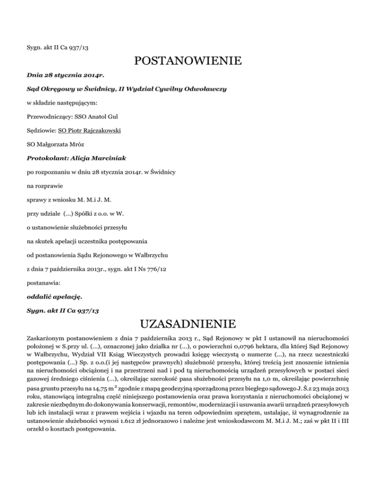 Sygn. akt II Ca 937/13 POSTANOWIENIE Dnia 28 stycznia 2014r. Sąd Okręgowy w Świdnicy, II Wydział Cywilny Odwoławczy w składzie następującym: Przewodniczący: SSO Anatol Gul Sędziowie: SO Piotr Rajczakowski SO Małgorzata Mróz Protokolant: Alicja Marciniak po rozpoznaniu w dniu 28 stycznia 2014r. w Świdnicy na rozprawie sprawy z wniosku M. M.i J. M. przy udziale (...) Spółki z o.o. w W. o ustanowienie służebności przesyłu na skutek apelacji uczestnika postępowania od postanowienia Sądu Rejonowego w Wałbrzychu z dnia 7 października 2013r., sygn. akt I Ns 776/12 postanawia: oddalić apelację. Sygn. akt II Ca 937/13 UZASADNIENIE Zaskarżonym postanowieniem z dnia 7 października 2013 r., Sąd Rejonowy w pkt I ustanowił na nieruchomości położonej w S.przy ul. (...), oznaczonej jako działka nr (...), o powierzchni 0,0796 hektara, dla której Sąd Rejonowy w Wałbrzychu, Wydział VII Ksiąg Wieczystych prowadzi księgę wieczystą o numerze (...), na rzecz uczestniczki postępowania (...) Sp. z o.o.(i jej następców prawnych) służebność przesyłu, której treścią jest znoszenie istnienia na nieruchomości obciążonej i na przestrzeni nad i pod tą nieruchomością urządzeń przesyłowych w postaci sieci gazowej średniego ciśnienia (...), określając szerokość pasa służebności przesyłu na 1,0 m, określając powierzchnię pasa gruntu przesyłu na 14,75 m 2 zgodnie z mapą geodezyjną sporządzoną przez biegłego sądowego J. Ś.z 23 maja 2013 roku, stanowiącą integralną część niniejszego postanowienia oraz prawa korzystania z nieruchomości obciążonej w zakresie niezbędnym do dokonywania konserwacji, remontów, modernizacji i usuwania awarii urządzeń przesyłowych lub ich instalacji wraz z prawem wejścia i wjazdu na teren odpowiednim sprzętem, ustalając, iż wynagrodzenie za ustanowienie służebności wynosi 1.612 zł jednorazowo i należne jest wnioskodawcom M. M.i J. M.; zaś w pkt II i III orzekł o kosztach postępowania. Sąd Rejonowy ustalił następujący stan faktyczny. M.i J. M.są na prawach wspólności ustawowej małżeńskiej współwłaścicielami nieruchomości położonej w S.przy ul. (...), składającej się z działki nr (...), dla której Sąd Rejonowy w Wałbrzychu prowadzi księgę wieczystą o nr (...). Przez przedmiotową działkę przebiega odcinek gazociągu o średnicy (...), długości 15 m, położony wzdłuż granicy działki. Wymiary strefy kontrolnej dla tego gazociągu wynoszą 1 m szerokości, co łącznie daje powierzchnię 15 m 2. Pomiędzy wnioskodawcami, a uczestnikiem postępowania prowadzona była przed wniesieniem sprawy do Sądu korespondencja w sprawie ustanowienia służebności przesyłu na rzecz uczestnika postępowania, na działce wnioskodawców. Na tę okoliczność uczestnik postępowania sporządził nawet prywatną opinię wyceniająca służebność. Wnioskodawcy początkowo mieli być przez uczestnika podłączeni do sieci gazowej wybudowanej na ich działce, ostatecznie przedsiębiorstwo jednak odmówiło powyższego, nie doszło też do zawarcia porozumienia. W miejscu położenia gazociągu wnioskodawcy zamierzali wybudować garaże w celach komercyjnych, co w chwili obecnej uniemożliwia im przebieg gazociągu. W czasie trwania postępowania (...) Spółka z o.o.we W.uległa przekształceniu w (...) Spółkę z ograniczoną odpowiedzialnością. Z informacji podanych przez pełnomocnika uczestnika postępowania, po zamknięciu przewodu sądowego wynikało, iż w chwili obecnej uczestnik postępowania nosi nazwę – (...) sp. z o.o.z siedzibą w W.. Rozważając tak ustalony stan faktyczny, Sąd Rejonowy stanął na stanowisku, że wniosek zasługiwał na uwzględnienie. Sąd wskazał, iż zgodnie z treścią art. 3054 kc do służebności przesyłu stosuje się odpowiednio przepisy o służebnościach gruntowych, zaś treścią służebności przesyłu jest korzystanie przez przedsiębiorcę w oznaczonym zakresie z cudzej nieruchomości (nieruchomości obciążonej), w zakresie niezbędnym dla zapewnienia prawidłowego funkcjonowania urządzeń przesyłowych (art. 3051 kc in fine). Zdaniem Sądu, w praktyce będzie to oznaczać możliwość wejścia przez przedsiębiorcę, któremu przysługuje służebność (jego pracownikom, podwykonawcom), na cudzy grunt obciążony służebnością w celu posadowienia tam urządzeń, o których mowa w art. 49 § 1 kc, usunięcia awarii, przeprowadzenia konserwacji czy modernizacji urządzeń przesyłowych. W konsekwencji służebność przesyłu będzie, co do zasady, służebnością czynną. W ocenie Sądu, w sprawie bezspornym było, iż służebność winna być ustanowiona. Wnioskodawcy i uczestnik nie byli jedynie w stanie porozumieć się co do wysokości wynagrodzenia. Sytuacja taka miała miejsce w dużej mierze w związku z zachowaniem uczestnika postępowania, który od samego początku niniejszego postępowania próbował wykazywać, iż nie ma legitymacji biernej do występowania w sprawie, choć jednocześnie, jak wynika z akt już w lutym 2010 r., sporządził operat szacunkowy w celu oszacowania służebności przesyłu na przedmiotowej nieruchomości. Zdaniem Sądu zachowanie uczestnika postępowania prowadziło jedynie do przewlekłości postępowania. Świadczyło o tym zarówno przedłożenie operatu sporządzonego przez A. F.dopiero po uchyleniu pierwotnego orzeczenia Sądu Rejonowego przez Sąd Okręgowy, jak również przyznanie przez uczestnika postępowania, iż jednak jest on jedynym i prawidłowo wskazanym uczestnikiem, dopiero na posiedzeniu Sądu w dniu 6 marca 2013 r., podczas kiedy już w październiku 2012 r. uczestnik był pozwanym w procesie z powództwa państwa M.o zapłatę i zdawał sobie sprawę, iż to on jest właścicielem przedmiotowej sieci. Mając powyższe na uwadze Sąd Rejonowy oddalił ostatni z wniosków dowodowych uczestnika - o wydanie opinii uzupełniającej przez biegłego J. Ś.na okol