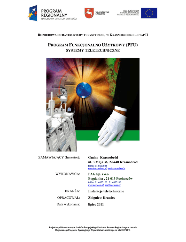ROZBUDOWA INFRASTRUKTURY TURYSTYCZNEJ W KRASNOBRODZIE – ETAP II PROGRAM FUNKCJONALNO UŻYTKOWY (PFU) SYSTEMY TELETECHNICZNE ZAMAWIAJĄCY (Inwestor): Gminą Krasnobród ul. 3 Maja 36, 22-440 Krasnobród tel/fax 84 6607691 www.krasnobrod.pl, [email protected] WYKONAWCA: PAG Sp. z o.o. Bogdanka , 21-013 Puchaczów tel/fax 81 4625126 , 81 4625136 www.pag.com.pl, [email protected] BRANŻA: Instalacje teletechniczne OPRACOWAŁ: Zbigniew Krawiec Data wykonania: lipiec 2011 Projekt współfinansowany ze środków Europejskiego Funduszu Rozwoju Regionalnego w ramach Regionalnego Programu Operacyjnego Województwa Lubelskiego na lata 2007-2013 ROZBUDOWA INFRASTRUKTURY TURYSTYCZNEJ W KRASNOBRODZIE – ETAP II SPIS TREŚCI 1. WSTĘP.............................................................................................................................................................................. 4 1.1. Podstawa opracowania........................................................................................................................................ 4 1.2. Przedmiot opracowania..................................................................................................................................... 4 1.3. Zakres stosowania.............................................................................................................................................. 4 1.4. Zakres robót objętych niniejszą ST................................................................................................................ 4 1.5. Wyszczególnienie i opis prac towarzyszących............................................................................................ 5 1.6. Niezbędne informacje o terenie budowy.................................................................................................... 5 1.7. Określenia podstawowe.................................................................................................................................... 6 2. WYMAGANIA DOTYCZĄCE OCZEKIWANEJ FUNKCJONALNOŚCI................................................................. 8 2.1. Ogólne wymagania ..........................................................................................Błąd! Nie zdefiniowano zakładki. 2.2. Monitoring wizyjny ........................................................................................Błąd! Nie zdefiniowano zakładki. 2.3. Szerokopasmowy dostęp do Internetu ....................................................Błąd! Nie zdefiniowano zakładki. 2.4. Statystyka przepływu ludności....................................................................Błąd! Nie zdefiniowano zakładki. 3. WYMAGANIA DOTYCZACE MATERIAŁÓW I URZĄDZEŃ ............................................................................... 15 3.1. Ogólne wymagania........................................................................................................................................... 15 3.2. Materiały budowlane........................................................................................................................................ 15 3.3. Materiały gotowe................................................................................................................................................. 16 3.3.1. Kable i przewody elektroenergetyczne .......................................................................................... 16 3.3.2. Kanały elektroinstalacyjne, korytka kablowe i listwy kablowe ............................................. 16 3.3.3. Rury instalacyjne.................................................................................................................................... 16 3.3.4. Rury osłonowe......................................................................................................................................... 16 3.3.5. Kable sygnałowe (niskoprądowe) .................................................................................................... 16 3.4. Urządzenia monitoringu wizyjnego i towarzyszące .............................Błąd! Nie zdefiniowano zakładki. 3.4.1. Kamera stacjonarna zewnętrzna...................................................................................................... 17 3.4.2. Rejestrator cyfrowy 16 kanałów wizji..........................................Błąd! Nie zdefiniowano zakładki. 3.4.3. Panel odbiorników...............................................................................Błąd! Nie zdefiniowano zakładki. 3.4.4. Odbiornik sygnału wizyjnego..........................................................Błąd! Nie zdefiniowano zakładki. 3.4.5. Nadajnik sygnału wizyjnego............................................................Błąd! Nie zdefiniowano zakładki. 3.4.6. Infokiosk.................................................................................................Błąd! Nie zdefiniowano zakładki. 3.4.7. Szafa teletechniczna ST....................................................................Błąd! Nie zdefiniowano zakładki. 3.4.8. Szafka teletechniczna SZ1 i SZ3...................................................Błąd! Nie zdefiniowano zakładki. 3.4.9. Szafka teletechniczna SZ2 ..............................................................Błąd! Nie zdefiniowano zakładki. 3.4.10. Szafa teleinformatyczna ST1 ...........................................................Błąd! Nie zdefiniowano zakładki. 3.4.11. System zasilania awaryjnego UPS w szafie ST .........................Błąd! Nie zdefiniowano zakładki. 3.4.12. System zasilania awaryjnego UPS w szafie ST1.......................Błąd! Nie zdefiniowano zakładki. 3.4.13. Komputer kliencki w Centrum Monitoringu ................................Błąd! Nie zdefiniowano zakładki. 3.4.14. Monitor w Centrum Monitoringu .....................................................Błąd! Nie zdefiniowano zakładki. 3.4.15. Drukarka fotograf