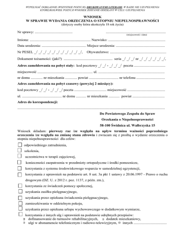 WYPEŁNIAĆ DOKŁADNIE (WSZYSTKIE POZYCJE) DRUKOWANYMI LITERAMI, W RAZIE NIE UZUPEŁNIENIA KTÓREJKOLWIEK POZYCJI WNIOSEK ZOSTANIE ODESŁANY W CELU UZUPEŁNIENIA WNIOSEK W SPRAWIE WYDANIA ORZECZENIA O STOPNIU NIEPELNOSPRAWNOŚCI (dotyczy osoby która ukończyła 18 rok życia) Nr sprawy: ......................................... ................................................................. (miejscowość i data) Imiona: .................................................................. Nazwisko: .............................................................. Data urodzenia: ................................................ Miejsce urodzenia: ..................................................... Nr PESEL _/ _/ _/ _/ _/ _/ _/ _/ _/ _/ _/, Obywatelstwo: ............................................................. Dokument tożsamości: (jaki?) ..................................................... seria _/ _/ _/ nr _/ _/ _/ _/ _/ _/, Adres zameldowania na pobyt stały: kod pocztowy _/ _/ - _/ _/ _/ poczta .................................. miejscowość ............................................................ ul. ........................................................................ nr domu ............. nr mieszkania ............. powiat ................................ nr telefonu ............................... Adres zameldowania na pobyt czasowy (powyżej 2 miesięcy): kod pocztowy _/ _/ - _/ _/ _/ poczta ................................... miejscowość ......................................... ul. ........................................... nr domu ........... nr mieszkania ............ powiat ................................... Adres do korespondencji: ................................................................................................................................................................ Do Powiatowego Zespołu do Spraw Orzekania o Niepełnosprawności 58-100 Świdnica ul. Wałbrzyska 15 Wniosek składam: pierwszy raz /ze względu na upływ terminu ważności poprzedniego orzeczenia /ze względu na zmianę stanu zdrowia i zwracam się z prośbą o wydanie orzeczenia o stopniu niepełnosprawności dla celów: odpowiedniego zatrudnienia, szkolenia, uczestnictwa w terapii zajęciowej, konieczności zaopatrzenia w przedmioty ortopedyczne i środki pomocnicze, korzystania z systemu środowiskowego wsparcia w samodzielnej egzystencji, korzystania z uprawnień na podstawie art. 8 ust. 3a pkt 1 ustawy z 20.06.1997 - Prawo o ruchu drogowym (DZ. U. z 2012 r. poz. 1137, z późn. zm.), korzystania ze świadczeń pomocy społecznej, uzyskania zasiłku pielęgnacyjnego, uzyskania przez opiekuna świadczenia pielęgnacyjnego, zamieszkiwania w oddzielnym pokoju, uzyskania przez opiekuna urlopu wychowawczego w dodatkowym wymiarze, korzystania z innych ulg i uprawnień na podstawie odrębnych przepisów: dofinansowanie do turnusów rehabilitacyjnych, dodatek mieszkaniowy, ulgi w abonamencie telefonicznym i radiowo-telewizyjnym, innych .................................... WYPEŁNIAĆ DOKŁADNIE (WSZYSTKIE POZYCJE) DRUKOWANYMI LITERAMI, W RAZIE NIE UZUPEŁNIENIA KTÓREJKOLWIEK POZYCJI WNIOSEK ZOSTANIE ODESŁANY W CELU UZUPEŁNIENIA Sytuacja społeczna: 1. Stan cywilny*:panna/kawaler/zamężna/żonaty/rozwiedziona/rozwiedziony/wdowa/wdowiec/ separowana/separowany, 2. Zdolność do samodzielnego funkcjonowania**: a/ wykonywanie czynności samoobsługowych samodzielnie z pomocą opieka b/ poruszanie się samodzielnie z pomocą opieka c/ prowadzenie gospodarstwa domowego samodzielnie z pomocą opieka Sytuacja zawodowa: 1. Wykształcenie*: podstawowe nieukończone i bez wykształcenia szkolnego / podstawowe / zasadnicze / średnie / wyższe /, 2. Zawód wyuczony: ..........................................., Aktualnie pracuję**: TAK / NIE, Zajmowane stanowisko ................................................................................................................ Oświadczenie: 1. Składałem /am/ (nie składałem /am/)** wniosek w sprawie wydania orzeczenia o stopniu niepełnosprawności w Powiatowym Zespole do Spraw Orzekania o Niepełnosprawności w ....................................... (kserokopie wszystkich posiadanych orzeczeń - aktualnych) data ostatniej komisji ............................. data ważności ostatniego orzeczenia ....................................... 2. Oświadczam, że aktualnie toczy się** / nie toczy się / w mojej sprawie postępowanie przed innym organem orzeczniczym, podać, jakim**: WZON we Wrocławiu, Sąd Pracy i Ubezp. 3. Oświadczam, że aktualnie pobieram świadczenie rentowe z tytułu: ............................................. ................................................................. (do wniosku należy załączyć kserokopię w/w decyzji). 4. Oświadczam, że na posiedzenie składu orzekającego*: - mogę przybyć samodzielnie lub z opiekunem, - nie mogę przybyć (w tym przypadku należy załączyć zaświadczenie lekarskie potwierdzające niemożność wzięcia udziału w posiedzeniu z powodu obłożnej i długotrwałej choroby). 5. W razie stwierdzenia przez skład orzekający konieczności wykonania badań dodatkowych, konsultacji specjalistycznych lub obserwacji szpitalnych, uzupełniających złożone zaświadczenie o stanie zdrowia wydane przez lekarza – jestem świadomy/a wymogu ponoszenia ich kosztów we własnym zakresie. 6. Do wniosku należy dołączyć: oryginał zaświadczenia lekarskiego o stanie zdrowia wydanego nie wcześniej niż 30 dni przed złożeniem wniosku oraz kserokopię posiadanej dokumentacji medycznej mogącej mieć wpływ na ustalenie niepełnosprawności i stopnia niepełnosprawności (oryginały do wglądu) i posiadanych orzeczeń (ZUS, KRUS, KIZ itp.). Oświadczam, że dane zawarte we wniosku są zgodne ze stanem faktycznym i jestem świadomy/a odpowiedzialności karnej (wynikającej z art. 233 § 1 kodeksu karnego) za zeznanie nieprawdy lub zatajenie prawdy. W załączeniu przedk