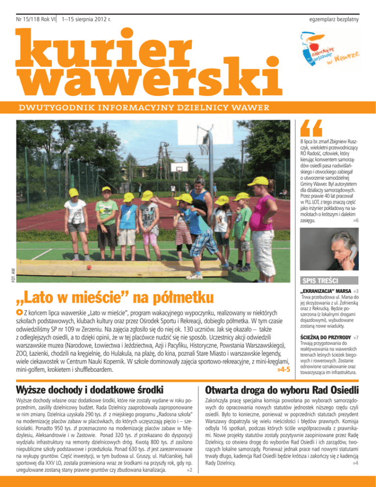 nr 15/118 Rok Vi 1–15 sierpnia 2012 r. egzemplarz bezpłatny Fot. aM 8 lipca br. zmarł zbigniew Ruszczyk, wieloletni przewodniczący Ro Radość, człowiek, który kierując konwentem samorządów osiedli pasa nadwiślańskiego i otwockiego zabiegał o utworzenie samodzielnej gminy wawer. był autorytetem dla działaczy samorządowych. przez prawie 40 lat pracował w pll loT, z tego znaczą część jako inżynier pokładowy na samolotach o krótszym i dalekim zasięgu. »6 „Lato w mieście” na półmetku z końcem lipca wawerskie „lato w mieście”, program wakacyjnego wypoczynku, realizowany w niektórych szkołach podstawowych, klubach kultury oraz przez ośrodek sportu i Rekreacji, dobiegło półmetka. w tym czasie odwiedziliśmy sp nr 109 w zerzeniu. na zajęcia zgłosiło się do niej ok. 130 uczniów. jak się okazało – także z odleglejszych osiedli, a to dzięki opinii, że w tej placówce nudzić się nie sposób. Uczestnicy akcji odwiedzili warszawskie muzea (narodowe, łowiectwa i jeździectwa, azji i pacyfiku, Historyczne, powstania warszawskiego), zoo, łazienki, chodzili na kręgielnię, do Hulakula, na plażę, do kina, poznali stare miasto i warszawskie legendy, wiele ciekawostek w centrum nauki kopernik. w szkole dominowały zajęcia sportowo-rekreacyjne, z mini-kręglami, »4-5 mini-golfem, krokietem i shuffleboardem. Wyższe dochody i dodatkowe środki wyższe dochody własne oraz dodatkowe środki, które nie zostały wydane w roku poprzednim, zasiliły dzielnicowy budżet. Rada dzielnicy zaaprobowała zaproponowane w nim zmiany. dzielnica uzyskała 290 tys. zł z miejskiego programu „Radosna szkoła” na modernizację placów zabaw w placówkach, do których uczęszczają pięcio i – sześciolatki. ponadto 950 tys. zł przeznaczono na modernizację placów zabaw w międzylesiu, aleksandrowie i w zastowie. ponad 320 tys. zł przekazano do dyspozycji wydziału infrastruktury na remonty dzielnicowych dróg. kwotą 800 tys. zł zasilono niepubliczne szkoły podstawowe i przedszkola. ponad 630 tys. zł jest zarezerwowane na wykupy gruntów. część inwestycji, w tym budowa ul. gruszy, ul. Hafciarskiej, hali sportowej dla XXV lo, została przeniesiona wraz ze środkami na przyszły rok, gdy np. uregulowane zostaną stany prawne gruntów czy zbudowana kanalizacja. »2 SPIS trEŚCI „EKrANIzACJA” MArSA »3 Trwa przebudowa ul. marsa do jej skrzyżowania z ul. żołnierską oraz z Rekrucką. będzie poszerzona (z lokalnymi drogami dojazdowymi), wybudowane zostaną nowe wiadukty. ŚCIEŻKĄ DO PrzyrODy »7 Trwają przygotowania do reaktywowania na wawerskich terenach leśnych ścieżek biegowych i rowerowych. zostanie odnowione oznakowanie oraz towarzysząca im infrastruktura. Otwarta droga do wyboru rad Osiedli zakończyła pracę specjalna komisja powołana po wyborach samorządowych do opracowania nowych statutów jednostek niższego rzędu czyli osiedli. było to konieczne, ponieważ w poprzednich statutach prezydent warszawy dopatrzyła się wielu nieścisłości i błędów prawnych. komisja odbyła 16 spotkań, podczas których ściśle współpracowała z prawnikami. nowe projekty statutów zostały pozytywnie zaopiniowane przez Radę dzielnicy, co otwiera drogę do wyborów Rad osiedli i ich zarządów, tworzących lokalne samorządy. ponieważ jednak prace nad nowymi statutami trwały długo, kadencja Rad osiedli będzie krótsza i zakończy się z kadencją Rady dzielnicy. »4 2 OD MARYSINA PO FALENICĘ Kurier URZĘDOWY Nieruchomość na sprzedaż Prezydent Miasta Stołecznego Warszawy informuje, że w dniu 1 sierpnia 2012 r. na tablicy ogłoszeń w siedzibie Urzędu Dzielnicy Wawer m.st. Warszawy przy ul. Żegańskiej 1 wywieszony został na okres 21 dni wykaz nr XIII/WGN/1/2012 o przeznaczeniu do sprzedaży w drodze przetargu ustnego nieograniczonego nieruchomości gruntowej zabudowanej, położonej w Warszawie w dzielnicy Wawer przy ul. Kłodzkiej 37, oznaczonej jako działka ewidencyjna nr 318 o pow. 275 m2 w obrębie 3-12-81, uregulowanej w KW nr WA6M/00277382/2, stanowiącej własność m.st. Warszawy. am Kurier INWESTYCYJNY Gdzie kanalizacja 2012 r. Informacje dotyczące tegorocznych inwestycji kanalizacyjnych realizowanych przez MPWiK w Wawrze spotkały się, co zrozumiałe, z dużym zainteresowaniem mieszkańców. Nic dziwnego, większość z nas ma dość odprowadzania nieczystości do szamb, a podłączenie do miejskiej sieci oznacza długo oczekiwany skok cywilizacyjny. Okazało się, że z braku miejsca, podając skrótowe dane, nadmiernie rozbudziliśmy oczekiwania Czytelników. Jak się przekonaliśmy, informację o budowie kanalizacji np. w ul. X niektórzy mieszkańcy odczytywali jako budowę na całym jej odcinku. W wielu przypadkach te inwestycje mają charakter cząstkowy – są np. kontynuowane od już istniejącej studzienki lub do pewnego tylko miejsca. Zatem mieszkańców zainteresowanych przebiegiem prowadzonych w tym roku robót kanalizacyjnych po szczegółowe informacje odsyłamy do wydziału infrastruktury, tel. 22 443 68 82. am Kurier SAMORZĄDOWY | place zabaw będą ciekawsze Wyższe dochody i dodatkowe środki w budżecie Rada Dzielnicy Wawer zaakceptowała większością głosów (radni klubu PiS wstrzymali się od głosu) propozycje zmian w tegorocznym budżecie. Stały się one możliwe głównie dzięki wyższym dochodom i dodatkowym środkom przyznanym przez Urząd m.st. Warszawy. Dochody dzielnicy wzrosły o blisko 1,4 mln zł. Ponadto do dzielnicowej kasy wróciło ponad 870 tys. zł, które nie zostały wykorzystane w ub. r. Ale jednocześnie zmniejszyły się o 3 mln zł dochody w związku ze zmniejszeniem planu wydatków majątkowych i przeniesieniem ich na lata następne. Rada zaaprobowała przeniesienia środków z jednych zadań inwestycyjnych na inne w kwocie prawie 1,9 mln zł. Ostatecznie tegoroczny budżet zamyka się kwotą 172 181 778 zł. A oto szczegóły dotyczące wydatków bieżących W