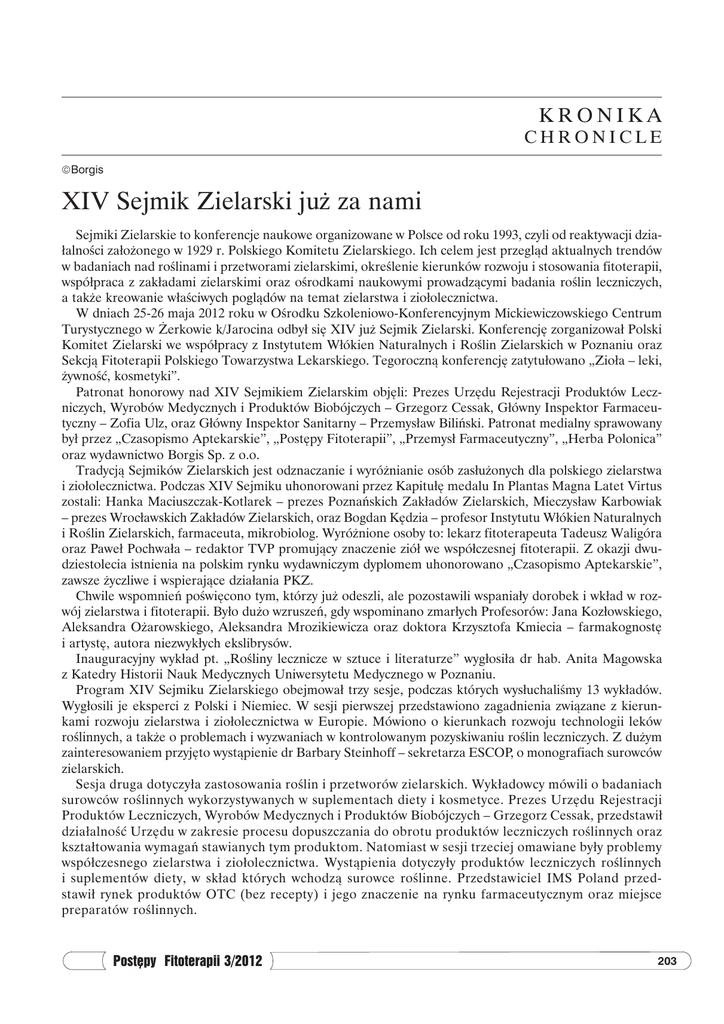 kronika chronicle Borgis XIV Sejmik Zielarski już za nami Sejmiki Zielarskie to konferencje naukowe organizowane w Polsce od roku 1993, czyli od reaktywacji działalności założonego w 1929 r. Polskiego Komitetu Zielarskiego. Ich celem jest przegląd aktualnych trendów w badaniach nad roślinami i przetworami zielarskimi, określenie kierunków rozwoju i stosowania fitoterapii, współpraca z zakładami zielarskimi oraz ośrodkami naukowymi prowadzącymi badania roślin leczniczych, a także kreowanie właściwych poglądów na temat zielarstwa i ziołolecznictwa. W dniach 25-26 maja 2012 roku w Ośrodku Szkoleniowo-Konferencyjnym Mickiewiczowskiego Centrum Turystycznego w Żerkowie k/Jarocina odbył się XIV już Sejmik Zielarski. Konferencję zorganizował Polski Komitet Zielarski we współpracy z Instytutem Włókien Naturalnych i Roślin Zielarskich w Poznaniu oraz Sekcją Fitoterapii Polskiego Towarzystwa Lekarskiego. Tegoroczną konferencję zatytułowano „Zioła – leki, żywność, kosmetyki”. Patronat honorowy nad XIV Sejmikiem Zielarskim objęli: Prezes Urzędu Rejestracji Produktów Leczniczych, Wyrobów Medycznych i Produktów Biobójczych – Grzegorz Cessak, Główny Inspektor Farmaceutyczny – Zofia Ulz, oraz Główny Inspektor Sanitarny – Przemysław Biliński. Patronat medialny sprawowany był przez „Czasopismo Aptekarskie”, „Postępy Fitoterapii”, „Przemysł Farmaceutyczny”, „Herba Polonica” oraz wydawnictwo Borgis Sp. z o.o. Tradycją Sejmików Zielarskich jest odznaczanie i wyróżnianie osób zasłużonych dla polskiego zielarstwa i ziołolecznictwa. Podczas XIV Sejmiku uhonorowani przez Kapitułę medalu In Plantas Magna Latet Virtus zostali: Hanka Maciuszczak-Kotlarek – prezes Poznańskich Zakładów Zielarskich, Mieczysław Karbowiak – prezes Wrocławskich Zakładów Zielarskich, oraz Bogdan Kędzia – profesor Instytutu Włókien Naturalnych i Roślin Zielarskich, farmaceuta, mikrobiolog. Wyróżnione osoby to: lekarz fitoterapeuta Tadeusz Waligóra oraz Paweł Pochwała – redaktor TVP promujący znaczenie ziół we współczesnej fitoterapii. Z okazji dwudziestolecia istnienia na polskim rynku wydawniczym dyplomem uhonorowano „Czasopismo Aptekarskie”, zawsze życzliwe i wspierające działania PKZ. Chwile wspomnień poświęcono tym, którzy już odeszli, ale pozostawili wspaniały dorobek i wkład w rozwój zielarstwa i fitoterapii. Było dużo wzruszeń, gdy wspominano zmarłych Profesorów: Jana Kozłowskiego, Aleksandra Ożarowskiego, Aleksandra Mrozikiewicza oraz doktora Krzysztofa Kmiecia – farmakognostę i artystę, autora niezwykłych ekslibrysów. Inauguracyjny wykład pt. „Rośliny lecznicze w sztuce i literaturze” wygłosiła dr hab. Anita Magowska z Katedry Historii Nauk Medycznych Uniwersytetu Medycznego w Poznaniu. Program XIV Sejmiku Zielarskiego obejmował trzy sesje, podczas których wysłuchaliśmy 13 wykładów. Wygłosili je eksperci z Polski i Niemiec. W sesji pierwszej przedstawiono zagadnienia związane z kierunkami rozwoju zielarstwa i ziołolecznictwa w Europie. Mówiono o kierunkach rozwoju technologii leków roślinnych, a także o problemach i wyzwaniach w kontrolowanym pozyskiwaniu roślin leczniczych. Z dużym zainteresowaniem przyjęto wystąpienie dr Barbary Steinhoff – sekretarza ESCOP, o monografiach surowców zielarskich. Sesja druga dotyczyła zastosowania roślin i przetworów zielarskich. Wykładowcy mówili o badaniach surowców roślinnych wykorzystywanych w suplementach diety i kosmetyce. Prezes Urzędu Rejestracji Produktów Leczniczych, Wyrobów Medycznych i Produktów Biobójczych – Grzegorz Cessak, przedstawił działalność Urzędu w zakresie procesu dopuszczania do obrotu produktów leczniczych roślinnych oraz kształtowania wymagań stawianych tym produktom. Natomiast w sesji trzeciej omawiane były problemy współczesnego zielarstwa i ziołolecznictwa. Wystąpienia dotyczyły produktów leczniczych roślinnych i suplementów diety, w skład których wchodzą surowce roślinne. Przedstawiciel IMS Poland przedstawił rynek produktów OTC (bez recepty) i jego znaczenie na rynku farmaceutycznym oraz miejsce preparatów roślinnych. Postępy Fitoterapii 3/2012 203 Kronika Istotnym elementem wszystkich Sejmików Zielarskich jest dyskusja nad najważniejszymi problemami polskich producentów surowców i przetworów zielarskich. Głównym celem tegorocznego Sejmiku Zielarskiego było podjęcie działań w celu racjonalnego współistnienia na polskim rynku farmaceutycznym produktów leczniczych roślinnych oraz suplementów diety zawierających składniki pochodzenia roślinnego. Można sądzić, że konferencja przyczyniła się do dyskusji nad koniecznością i sposobem uporządkowania w tym aspekcie polskiego rynku farmaceutycznego. Uczestnikami Sejmików Zielarskich są przedstawiciele różnych środowisk profesjonalnie związanych z zielarstwem i ziołolecznictwem. W XIV Sejmiku Zielarskim udział wzięło ok. 160 osób. Znaczną część stanowili przedstawiciele ośrodków akademickich, instytutów i jednostek badawczych. Podczas sesji posterowej zaprezentowali oni 36 prac, przedstawiając zakres i aktualny stan prowadzonych badań dotyczących różnych aspektów zielarstwa i ziołolecznictwa. Konferencji przez cały czas trwania towarzyszyła wystawa prac plastycznych Anny Głowniak-Lipy pt. „Uroda ziół”. Pierwszy dzień zakończył się biesiadą i zabawą, w której towarzyszył zespół „Żuki”. W drugim dniu konferencji uczestnicy mogli zwiedzić pobliskie zakłady zielarskie oraz poznać piękno Żerkowsko-Czeszewskiego Parku Krajobrazowego, a na zakończenie konferencyjnego spotkania odbył się koncert organowy w wykonaniu Kaspra Ekerta w malowniczo położonym neoklasycystycznym kościele w Brzóstkowie. Uczestnikom XIV Sejmiku Zielarskiego organizatorzy serdecznie dziękują za przybycie i spędzony czas z nadzieją, że pozostawił miłe ws