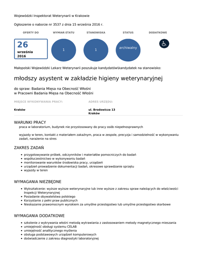 Wojewódzki Inspektorat Weterynarii w Krakowie Ogłoszenie o naborze nr 3537 z dnia 15 września 2016 r. OFERTY DO WYMIAR ETATU STANOWISKA 1 1 26 września 2016 STATUS DODATKOWE archiwalny Małopolski Wojewódzki Lekarz Weterynarii poszukuje kandydatów\kandydatek na stanowisko: młodszy asystent w zakładzie higieny weterynaryjnej do spraw: Badania Mięsa na Obecność Włośni w Pracowni Badania Mięsa na Obecność Włośni MIEJSCE WYKONYWANIA PRACY: ADRES URZĘDU: Kraków ul. Brodowicza 13 Kraków WARUNKI PRACY praca w laboratorium, budynek nie przystosowany do pracy osób niepełnosprawnych wyjazdy w teren, kontakt z materiałem zakaźnym, praca w zespole, precyzja i samodzielność w wykonywaniu zadań, narażenie na stres ZAKRES ZADAŃ przygotowywanie próbek, odczynników i materiałów pomocniczych do badań współuczestnictwo w wykonywaniu badań monitorowanie warunków środowiska pracy, urządzeń urządzeń prowadzenie dokumentacji badań, okresowe sprawdzanie sprzętu wyjazdy w teren WYMAGANIA NIEZBĘDNE Wykształcenie: wyższe wyższe weterynaryjne lub inne wyższe z zakresu spraw należących do właściwości Inspekcji Weterynaryjnej Posiadanie obywatelstwa polskiego Korzystanie z pełni praw publicznych Nieskazanie prawomocnym wyrokiem za umyślne przestępstwo lub umyślne przestępstwo skarbowe WYMAGANIA DODATKOWE szkolenie z wykrywania włośni metodą wytrawiania z zastosowaniem metody magnetycznego mieszania umiejętność obsługi systemu CELAB umiejętność analitycznego myślenia obsługa podstawowych urządzeń komputerowych doświadczenie z zakresu diagnostyki laboratoryjnej znajomość j. angielskiego w stopniu co najmniej dobrym DOKUMENTY I OŚWIADCZENIA NIEZBĘDNE Życiorys/CV i list motywacyjny Kopie dokumentów potwierdzających spełnienie wymagania niezbędnego w zakresie wykształcenia Oświadczenie o posiadaniu obywatelstwa polskiego albo kopia dokumentu potwierdzającego posiadanie polskiego obywatelstwa Oświadczenie o wyrażeniu zgody na przetwarzanie danych osobowych do celów naboru Oświadczenie o korzystaniu z pełni praw publicznych Oświadczenie o nieskazaniu prawomocnym wyrokiem za umyślne przestępstwo lub umyślne przestępstwo skarbowe DOKUMENTY I OŚWIADCZENIA DODATKOWE kopia dokumentu potwierdzającego niepełnosprawność - w przypadku kandydatek/kandydatów, zamierzających skorzystać z pierwszeństwa w zatrudnieniu w przypadku, gdy znajdą się w gronie najlepszych kandydatek/kandydatów zaświadczenie zaświadczenie zaświadczenie TERMINY I MIEJSCE SKŁADANIA DOKUMENTÓW Dokumenty należy złożyć do: 26 września 2016 r. Decyduje data: wpływu oferty do urzędu Miejsce składania dokumentów: Wojewódzki Inspektorat Weterynarii w Krakowie ul. Brodowicza 13, 30-965 Kraków INNE INFORMACJE: W miesiącu poprzedzającym datę upublicznienia ogłoszenia wskaźnik zatrudnienia osób niepełnosprawnych w urzędzie, w rozumieniu przepisów o rehabilitacji zawodowej i społecznej oraz zatrudnianiu osób niepełnosprawnych, nie wynosi co najmniej 6%. W związku z inicjatywą Pełnomocnika Rządu ds. Równego Traktowania dotyczącą zamieszczania w ogłoszeniach o naborach klauzuli równych szans, zachęcamy do zamieszczania w poniższej rubryce następującej informacji: Nasz urząd jest pracodawcą równych szans i wszystkie aplikacje są rozważane z równą uwagą bez względu na płeć, wiek, niepełnosprawność, rasę, narodowość, przekonania polityczne, przynależność związkową, pochodzenie etniczne, wyznanie, orientacje seksualną czy też jakąkolwiek inną cechę prawnie chronioną. Pełnomocnik Rządu ds. Równego Traktowania zaleca również stosowanie w ogłoszeniach o naborach form kandydatka/kandydat, zamiast wyłącznie form męskich. Legenda Pierwszeństwo dla osób z niepełnosprawnościami Ogłoszenie z tym symbolem oznacza, że pierwszeństwo w zatrudnieniu mają osoby z niepełnosprawnościami, które spełniają wszystkie następujące warunki: • złożyły w terminie ofertę wraz z dokumentem potwierdzającym niepełnosprawność, • spełniają warunki wymienione w ogłoszeniu, • po rekrutacji znalazły się w gronie najlepszych kandydatów. Zastępstwo Ogłoszenie z tym symbolem oznacza, że urząd poszukuje kandydatów do pracy na czas przewidywanej nieobecności swojego pracownika. Jeśli w ogłoszeniu nie wskazano okresu zastępstwa, możesz o to spytać w urzędzie. Osoba zatrudniona na zastępstwo jest członkiem korpusu służby cywilnej. Nabór otwarty dla cudzoziemców Ogłoszenie z tym symbolem oznacza, że o stanowisko mogą starać się, poza polskimi obywatelami, również cudzoziemcy. Kandydaci muszą spełniać następujące warunki: • są obywatelami państwa Unii Europejskiej lub innego państwa, którego obywatelom na podstawie umów międzynarodowych lub przepisów prawa wspólnotowego przysługuje prawo podjęcia zatrudnienia na terytorium Polski, • ich znajomość języka polskiego jest potwierdzona jednym z dokumentów wskazanych w rozporządzeniu w sprawie rodzajów dokumentów potwierdzających znajomość języka polskiego przez osoby nieposiadające obywatelstwa polskiego, ubiegające się o zatrudnienie w służbie cywilnej.