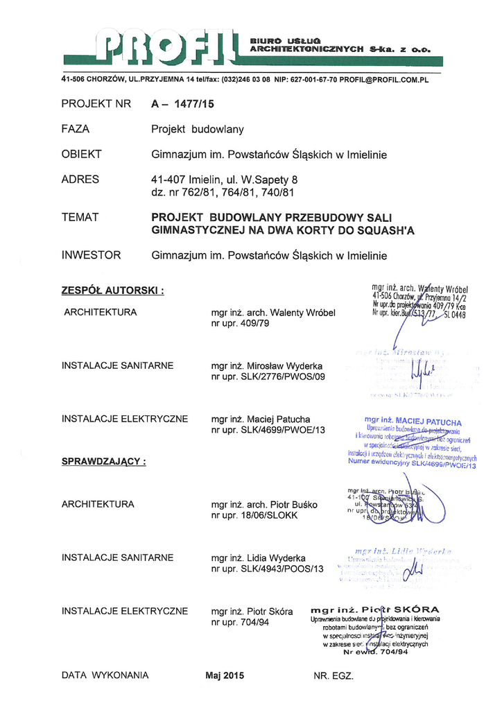 Projekt budowlany przebudowy sali gimnastycznej na dwa korty do squasha 41-407 Imielin ul. W. Sapety 8; działki numer 762/81; 764/81; 740/81 OPIS TECHNICZNY Do projektu budowlanego: przebudowy sali gimnastycznej na dwa korty do squasha 41-407 Imielin ul. W. Sapety 8; działki numer 762/81; 764/81; 740/81 1. Podstawa opracowania 1.1 Zlecenie Inwestora 1.2 Inwentaryzacja architektoniczno-budowlana części obiektu objętej opracowaniem wykonana przez zespół projektowy Biuro Usług Architektonicznych PROFIL Sp. z o.o. w maju 2015 1.3 Wstępne uzgodnienie programu użytkowego przez Inwestora 1.4 Obowiązujące normy i przepisy techniczno - budowlane 1.5 Uzgodnienia międzybranżowe A. PRZEDMIOT INWESTYCJI Przedmiotem opracowania jest projekt budowlany przebudowy istniejącej sali gimnastycznej na korty do squasha w pomieszczeniach Gimnazjum im. Powstańców Śląskich w Imielinie w tym. Dokonanie podziału istniejącej sali na dwa obszary: - sala fitness - sala squasha wyposażona w dwa korty do squasha Wykonanie łazienki dla niepełnosprawnych Remont szatni dla chłopców oraz dziewcząt Wykonanie szatni do squasha Wykonanie i wydzielenia pomieszczenia recepcji i toalet squasha Remont i odnowienia sali fitness w tym wyłożenie ścian płytami HPL oraz instalacja zestawu luster. Remont instalacji wewnętrznych i ich dostosowanie do nowej konfiguracji pomieszczeń Przebudowa ma na celu znalezienie nowych spełniających potrzeby użytkowników funkcji w związku z powstaniem przy Gimnazjum nowej hali widowiskowo- sportowej. 1 Projekt budowlany przebudowy sali gimnastycznej na dwa korty do squasha 41-407 Imielin ul. W. Sapety 8; działki numer 762/81; 764/81; 740/81 B. STAN ISTNIEJĄCY 1. Położenie terenu, warunki terenowo- prawne Poddawany przebudowie budynek przyszkolnej sali sportowej częścią zespołu Gimnazjum im. Powstańców Śląskich w Imielinie, 41-407 Imielin, ul. W. Sapety 8 na który składają się Budynek gimnazjum Sala sportowa Hala widowiskowo sportowa ( nowo wybudowana ) 2. Dane techniczno-użytkowe części objętej opracowaniem Powierzchnia użytkowa obszaru opracowania Powierzchnia zabudowy obszaru opracowania Kubatura - 435,59 m2 567 m2 1710,6m3 3. Opis budowlany stanu istniejącego wraz z oceną stanu technicznego budynku zawarto w części konstrukcyjnej projektu 4. Instalacje w budynku Budynek posiada instalację: - Elektryczną - Wodno-kanalizacyjną. - Teletechniczną - Instalację centralnego ogrzewania. C. CZĘŚĆ PROJEKTOWA 1. Zagospodarowanie i uzbrojenie terenu Przewiduje się przebudowę bez zmiany sposobu użytkowania części wewnętrznej istniejącej sali sportowej. Przewiduje się obsługę parkingową z wykorzystaniem istniejących miejsc w obrębie sąsiedztwa inwestycji, w/w projekt nie spowoduje wzrostu wymagań parkingowych. 2. Projekt architektoniczno – budowlany 2.1. Przeznaczenie i funkcja pomieszczeń Część budynku objęta opracowaniem przeznaczona będzie na: - salę fitness 2 Projekt budowlany przebudowy sali gimnastycznej na dwa korty do squasha 41-407 Imielin ul. W. Sapety 8; działki numer 762/81; 764/81; 740/81 - salę squasha wyposażoną w dwa korty do squasha wraz z zapleczem i pomieszczeniami obsługowymi. Wejście do sali sportowej przez część wejściową / komunikacyjną Gimnazjum oraz od strony wschodniej przez istniejące wyjście. 2.2 Dane techniczno-użytkowe przebudowywanego obiektu Powierzchnia użytkowa obszaru opracowania Powierzchnia zabudowy obszaru opracowania Kubatura - 435,59 m2 567 m2 1710,6m3 ilość zatrudnionych ( na jedną zmianę ) - 1/3 osoby Szczegółowe zestawienie powierzchni pomieszczeń użytkowych będących w zakresie opracowania Projektowane pomieszczenia sali sportowej Numer pom. Nazwa Pomieszczenia Powierzchnia w m2 001 Korytarz 43,03 001A Recepcja 7,86 002A Sala fitness 120,07 002B Strefa squash 145,49 003 Pomieszczenie nauczyciela 25,59 004 Szatnia chłopców 15,62 005 Korytarz 3,56 006 Łaźnia chłopców 8,67 007 Szatnia łazienka dla NPS 5,77 009 Korytarz 3,42 010 Łaźnia dziewczynek 8,67 011 Szatnia Dziewczynek 15,85 012 Szatnia squash 16,10 013 Łaźnia squash 6,93 SUMA POWIERZCHNI 426,63 m 3 Projekt budowlany przebudowy sali gimnastycznej na dwa korty do squasha 41-407 Imielin ul. W. Sapety 8; działki numer 762/81; 764/81; 740/81 2.3 Technologia użytkowania budynku Przebudowywana sala sportowa przeznaczona będzie dla : grup uprawiających fitness oraz wszelkiego typu aktywności ruchowe możliwe do wykonania na obszarze 10,38 na 11,37 m np. Zapasy .Przewiduje się że jedna grupa ćwiczących nie będzie większa niż 35 osób 4 do 8 osób w strefie squash w związku ze specyfiką gry i projektowanymi 2 kortami na których jednocześnie mogą trenować 4 osoby. Budynek będzie mógł być użytkowany tak na potrzeby szkoły w czasie godzin lekcyjnych jak i na potrzeby mieszkańców w godzinach poza pracą szkoły w związku z tym, że posiada niezależne wejście umożliwiające niezależny dostęp do budynku. 3. Opis budowlany 3.1 Stan surowy 3.1.1 Roboty demontażowe i wyburzenia Należy usunąć wierzchnie warstwy posadzek oraz okładzin ściennych i pod nadzorem projektanta ocenić stan techniczny warstw podpodłogowych . Zdemontować istniejące instalacje wewnętrzne sanitarne z przyborami ( pozostawiając piony wod – kan ) oraz elektryczne. Zaślepić wskazane kaloryfery wyłączając je z obiegu CO. Dokonać przeglądu ścian z cegły oraz wymienić cegły zmurszałe i złym stanie. Wykonać na wskazanym na rysunku obszarze wyburzenia oraz otworowania ścian i dokonać wymurowania nowych. 3.1.2 Wykonanie nowych otworów w ścianach o grubości ≥ 1 cegły ( nośnych i nienośnych Nadproża w projektowanych otworach wykonać metodą remontową lub przy pomocy prefabrykowanych nadproży zgodnie ze specyfikacją techn. 3.1.3 Ścianki działowe Ścianki działowe wykonać z płyt GK 12,5 mm na ruszcie metalowym ( profil U 75 ), z wypełnieniem wełna mineralną oraz z b