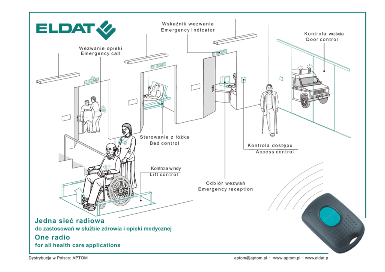 Wskaźnik wezwania Emergency indicator Wezwanie opieki Emergency call E1 2 3 E1 2 3 E1 2 3 K o n t r o l a wejścia Door control 45 45 45 Sterowanie z łóżka Bed control Kontrola dostępu Access control Kontrola windy Lift control Odbiór wezwań Emergency reception Jedna sieć radiowa do zastosowań w służbie zdrowia i opieki medycznej One radio for all health care applications Dystrybucja w Polsce: APTOM [email protected] · www.aptom.pl · www.eldat.pl