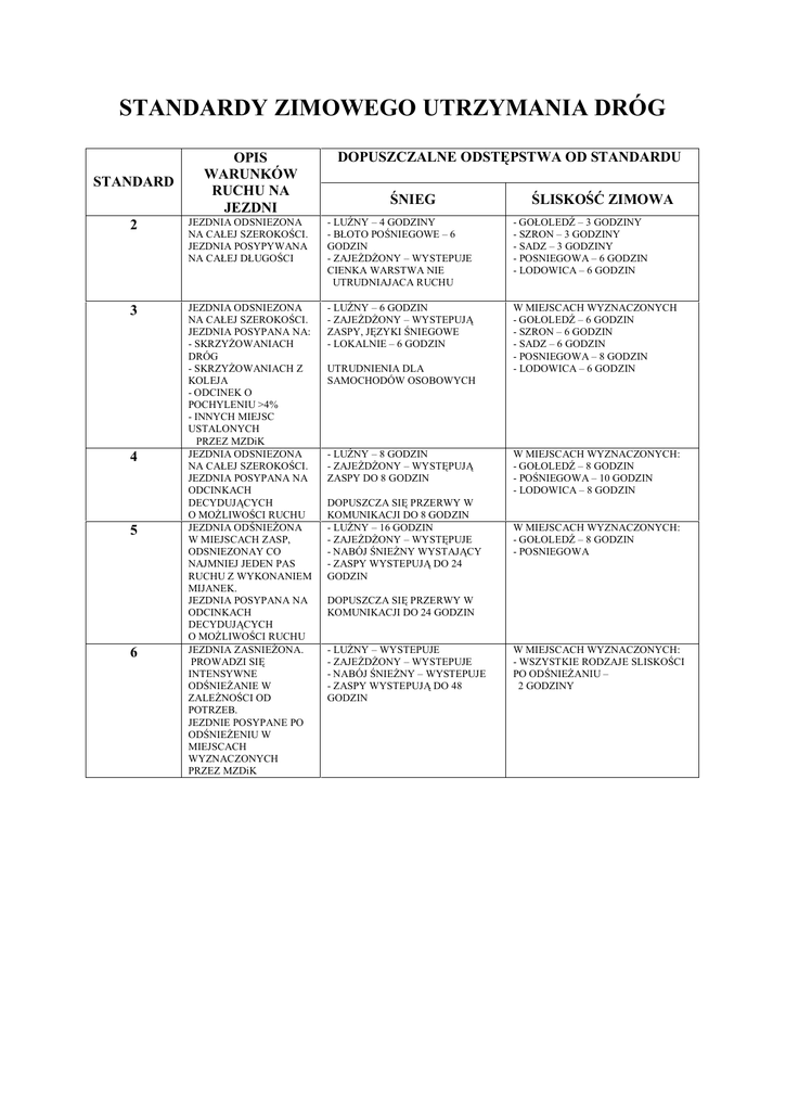 STANDARDY ZIMOWEGO UTRZYMANIA DRÓG STANDARD OPIS WARUNKÓW RUCHU NA JEZDNI DOPUSZCZALNE ODST PSTWA OD STANDARDU NIEG LISKO ZIMOWA 2 JEZDNIA ODSNIEZONA NA CA EJ SZEROKO CI. JEZDNIA POSYPYWANA NA CA EJ D UGO CI - LU NY – 4 GODZINY - B OTO PO NIEGOWE – 6 GODZIN - ZAJE ONY – WYSTEPUJE CIENKA WARSTWA NIE UTRUDNIAJACA RUCHU - GO OLED – 3 GODZINY - SZRON – 3 GODZINY - SADZ – 3 GODZINY - POSNIEGOWA – 6 GODZIN - LODOWICA – 6 GODZIN 3 JEZDNIA ODSNIEZONA NA CA EJ SZEROKO CI. JEZDNIA POSYPANA NA: - SKRZY OWANIACH DRÓG - SKRZY OWANIACH Z KOLEJA - ODCINEK O POCHYLENIU >4% - INNYCH MIEJSC USTALONYCH PRZEZ MZDiK JEZDNIA ODSNIEZONA NA CA EJ SZEROKO CI. JEZDNIA POSYPANA NA ODCINKACH DECYDUJ CYCH O MO LIWO CI RUCHU JEZDNIA OD NIE ONA W MIEJSCACH ZASP, ODSNIEZONAY CO NAJMNIEJ JEDEN PAS RUCHU Z WYKONANIEM MIJANEK. JEZDNIA POSYPANA NA ODCINKACH DECYDUJ CYCH O MO LIWO CI RUCHU JEZDNIA ZASNIE ONA. PROWADZI SI INTENSYWNE OD NIE ANIE W ZALE NO CI OD POTRZEB. JEZDNIE POSYPANE PO OD NIE ENIU W MIEJSCACH WYZNACZONYCH PRZEZ MZDiK - LU NY – 6 GODZIN - ZAJE ONY – WYSTEPUJ ZASPY, J ZYKI NIEGOWE - LOKALNIE – 6 GODZIN W MIEJSCACH WYZNACZONYCH - GO OLED – 6 GODZIN - SZRON – 6 GODZIN - SADZ – 6 GODZIN - POSNIEGOWA – 8 GODZIN - LODOWICA – 6 GODZIN 4 5 6 UTRUDNIENIA DLA SAMOCHODÓW OSOBOWYCH - LU NY – 8 GODZIN - ZAJE ONY – WYST PUJ ZASPY DO 8 GODZIN DOPUSZCZA SI PRZERWY W KOMUNIKACJI DO 8 GODZIN - LU NY – 16 GODZIN - ZAJE ONY – WYST PUJE - NABÓJ NIE NY WYSTAJ CY - ZASPY WYSTEPUJ DO 24 GODZIN W MIEJSCACH WYZNACZONYCH: - GO OLED – 8 GODZIN - PO NIEGOWA – 10 GODZIN - LODOWICA – 8 GODZIN W MIEJSCACH WYZNACZONYCH: - GO OLED – 8 GODZIN - POSNIEGOWA DOPUSZCZA SI PRZERWY W KOMUNIKACJI DO 24 GODZIN - LU NY – WYSTEPUJE - ZAJE ONY – WYSTEPUJE - NABÓJ NIE NY – WYSTEPUJE - ZASPY WYSTEPUJ DO 48 GODZIN W MIEJSCACH WYZNACZONYCH: - WSZYSTKIE RODZAJE SLISKO CI PO OD NIE ANIU – 2 GODZINY