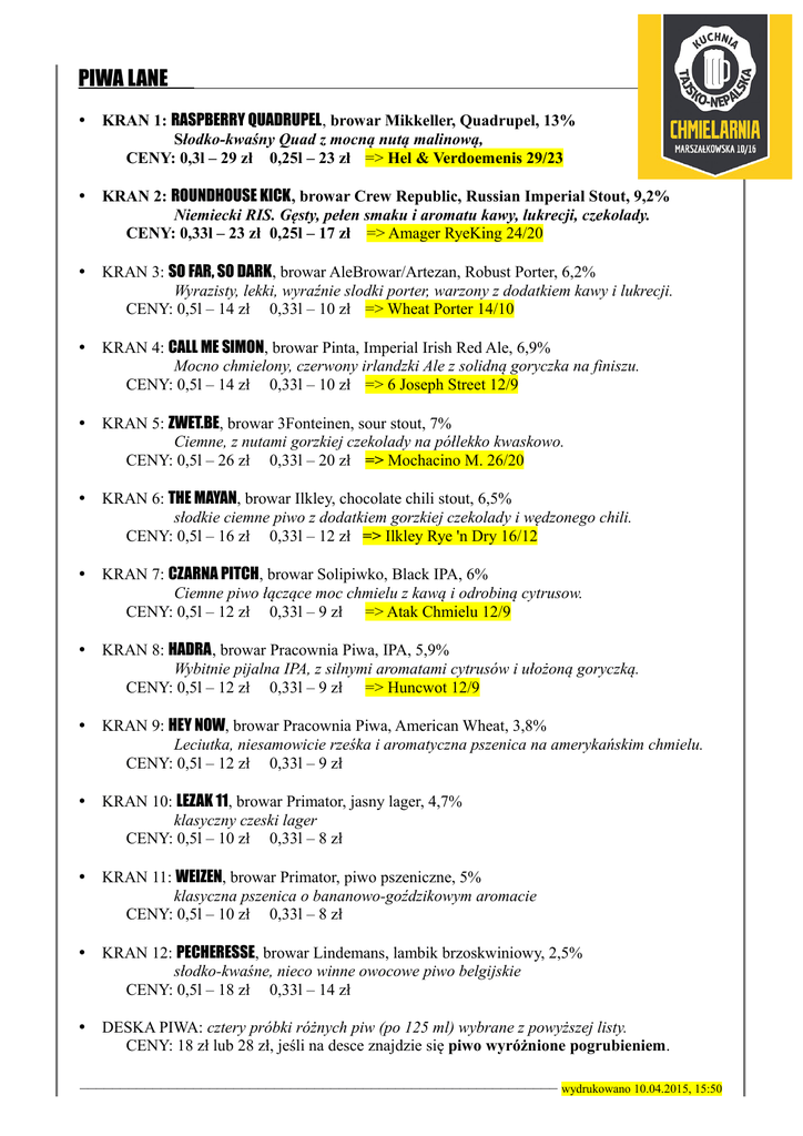 PIWA LANE KRAN 1: RASPBERRY QUADRUPEL, browar Mikkeller, Quadrupel, 13% Słodko-kwaśny Quad z mocną nutą malinową, CENY: 0,3l – 29 zł 0,25l – 23 zł => Hel & Verdoemenis 29/23 KRAN 2: ROUNDHOUSE KICK, browar Crew Republic, Russian Imperial Stout, 9,2% Niemiecki RIS. Gęsty, pełen smaku i aromatu kawy, lukrecji, czekolady. CENY: 0,33l – 23 zł 0,25l – 17 zł => Amager RyeKing 24/20 KRAN 3: SO FAR, SO DARK, browar AleBrowar/Artezan, Robust Porter, 6,2% Wyrazisty, lekki, wyraźnie slodki porter, warzony z dodatkiem kawy i lukrecji. CENY: 0,5l – 14 zł 0,33l – 10 zł => Wheat Porter 14/10 KRAN 4: CALL ME SIMON, browar Pinta, Imperial Irish Red Ale, 6,9% Mocno chmielony, czerwony irlandzki Ale z solidną goryczka na finiszu. CENY: 0,5l – 14 zł 0,33l – 10 zł => 6 Joseph Street 12/9 KRAN 5: ZWET.BE, browar 3Fonteinen, sour stout, 7% Ciemne, z nutami gorzkiej czekolady na półlekko kwaskowo. CENY: 0,5l – 26 zł 0,33l – 20 zł => Mochacino M. 26/20 KRAN 6: THE MAYAN, browar Ilkley, chocolate chili stout, 6,5% słodkie ciemne piwo z dodatkiem gorzkiej czekolady i wędzonego chili. CENY: 0,5l – 16 zł 0,33l – 12 zł => Ilkley Rye 'n Dry 16/12 KRAN 7: CZARNA PITCH, browar Solipiwko, Black IPA, 6% Ciemne piwo łączące moc chmielu z kawą i odrobiną cytrusow. CENY: 0,5l – 12 zł 0,33l – 9 zł => Atak Chmielu 12/9 KRAN 8: HADRA, browar Pracownia Piwa, IPA, 5,9% Wybitnie pijalna IPA, z silnymi aromatami cytrusów i ułożoną goryczką. CENY: 0,5l – 12 zł 0,33l – 9 zł => Huncwot 12/9 KRAN 9: HEY NOW, browar Pracownia Piwa, American Wheat, 3,8% Leciutka, niesamowicie rześka i aromatyczna pszenica na amerykańskim chmielu. CENY: 0,5l – 12 zł 0,33l – 9 zł KRAN 10: LEZAK 11, browar Primator, jasny lager, 4,7% klasyczny czeski lager CENY: 0,5l – 10 zł 0,33l – 8 zł KRAN 11: WEIZEN, browar Primator, piwo pszeniczne, 5% klasyczna pszenica o bananowo-goździkowym aromacie CENY: 0,5l – 10 zł 0,33l – 8 zł KRAN 12: PECHERESSE, browar Lindemans, lambik brzoskwiniowy, 2,5% słodko-kwaśne, nieco winne owocowe piwo belgijskie CENY: 0,5l – 18 zł 0,33l – 14 zł DESKA PIWA: cztery próbki różnych piw (po 125 ml) wybrane z powyższej listy. CENY: 18 zł lub 28 zł, jeśli na desce znajdzie się piwo wyróżnione pogrubieniem. ––––––––––––––––––––––––––––––––––––––––––––––––––––––––––– wydrukowano 10.04.2015, 15:50