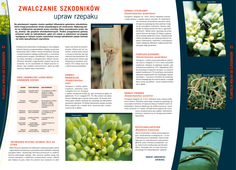 ZWALCZANIE SZKODNIKÓW upraw rzepaku Na plantacjach rzepaku można spotkać kilkanaście gatunków szkodników, które mogą powodować straty uzasadniające ich zwalczanie. Wpływają także na zwiększenie porażenia przez choroby. Rany powodowane przez nie są „bramą” dla grzybów chorobotwórczych. Trudno przygotować gotowy schemat walki ze szkodnikami, gdyż ich naloty w zależności od pogody występują w różnym czasie; masowość inwazji szkodników zależy również od wielu specyficznych czynników. Podstawowym elementem umożliwiającym nam podjęcie trafnych decyzji o przeprowadzeniu zabiegu na polu jest obserwacja roślin i żółtych naczyń na plantacji. Decyzje o przeprowadzeniu zabiegu podejmujemy w momencie przekroczenia progów szkodliwości. Wczesną wiosną należy pamiętać o przygotowaniu żółtych naczyń. Pierwsze szkodniki mogą bowiem pojawić się już tak wcześnie, że ich zauważenie na małych jeszcze roślinach, bez środków pomocniczych, jakimi są żółte naczynia, będzie wręcz niemożliwe. PROGI EKONOMICZNE J SZKODLI WOŚCI SZKODNIKÓW RZEPA K U szkodnik termin obserwacji próg szkodliwości Chowacz brukwiaczek początek marca koniec marca 10 chrząszczy w żółtym naczyniu w ciągu kolejnych 3 dni lub 6 chrząszczy na 25 roślinach Chowacz czterozębny przełom marca i kwietnia 20 chrząszczy w żółtym naczyniu w ciągu kolejnych 3 dni lub 6 chrząszczy na 25 roślinach Słodyszek rzepakowy zwarty kwiatostan luźny kwiatostan 1 chrząszcz na roślinie 3-5 chrząszczy na roślinie Chowacz podobnik przełom kwietnia i maja 4 chrząszcze na 25 roślinach Pryszczarek kapustnik od początku opadania płatków kwiatowych 1 dorosły owad na 4 rośliny Mszyca kapuściana od początku rozwoju łuszczyn 2 kolonie na 1m2 na brzegu pola ODPOWIEDNIO WCZE ŚNIE US TAWIAĆ ŻÓ ŁT E N ACZ Y NIA Żółte naczynia ustawione we właściwym czasie (początek marca) i odpowiednio kontrolowane, przeważnie dość dokładnie wskazują początek nalotu i dostarczają informacji pomocnych w ustaleniu terminu pierwszego zabiegu. Aby naczynia spełniły swoją rolę musimy pamiętać o właściwym umieszczeniu naczyń. Ważne jest miejsce na polu, które nie powinno być narażone na silne wiatry oraz łatwe do skontrolowania. Ważna jest też wysokość umieszczenia naczyń w rosnącym łanie tak, aby były widoczne dla szkodników. Po paru słonecznych dniach, gdy temperatura powietrza przekracza 10°C należy liczyć się z aktywnością szkodników. CHOWACZ BRUK WIACZEK (Ceutorrhynchus napi) Chrząszcz z rodziny ryjkowcowatych, jednolicie szary o długości 3,5 mm. Zimujące w glebie chrząszcze budzą się, gdy temperatura gleby na głębokości 10 cm osiągnie 6ºC. Po kilku dniach od nalotu samice składają jaja w górnej części pędu. W okresie kwitnienia pędy rzepaku skręcają się, pojawiają się niekształtne zgrubienia i pęknięcia. W okresie dojrzewania rzepaku dorosła larwa wygryza się u nasady liścia, opuszcza pęd i przepoczwarza się w glebie. CHOWACZ CZ T EROZĘBN Y (Ceutorrhynchus quadridens) Chrząszcz długości ok. 3mm, barwy niebiesko-czarnej z białą plamką u nasady pokryw skrzydeł. W odróżnieniu od chowacza brukwiaczka pierwsze naloty chrząszczy pojawiają się nieco później i trwają aż do początków kwitnienia. Samica składa jaja na dolnej stronie liści lub w ogonkach liściowych. Młode larwy wgryzają się przez ogonki liściowe do łodyg. W miejscu wgryzienia pozostaje zabliźniony otwór. Zaatakowane rośliny początkowo nie wykazują żadnych objawów uszkodzenia, natomiast w późniejszym czasie następuje żółknięcie i załamywanie liści, zaś pędy stają się łamliwe. S ŁODYSZEK RZEPA KOW Y (Ceutorrhynchus quadridens) Chrząszcz z rodziny łuszczynkowatych, jednolicie czarny o długości 2-3 mm, larwy szarożółte wydłużone. Nalatuje na plantacje rzepaku, gdy temperatura przekroczy 15ºC. Największe szkody powodują chrząszcze żerujące na zwartych pąkach kwiatowych. Po rozwinięciu się kwiatów słodyszek wyjada pylniki nie uszkadzając najczęściej zalążni – łuszczyny normalnie się zawiązują. Samice składają jaja do wnętrza pąków, a wylęgłe larwy żywią się pyłkiem. Larwa przepoczwarza się w glebie. CHOWACZ PODOBNIK (Ceutorrhynchus assimilis) Chrząszcz długości ok. 3 mm, jednolicie szary, pokryty białawymi łuskami. Pierwsze naloty tego chrząszcza pojawiają się w początku kwitnienia, chrząszcze żerują w kwiatach razem ze słodyszkiem. Samica składa jajo do środka łuszczyny. Larwa może zniszczyć 3-7 nasion, dorosła larwa wygryza się z łuszczyny i przepoczwarza się w glebie. Uszkodzone łuszczyny narażone są na inwazję pryszczarka kapustnika. PRYSZCZ A REK K A PUS T NIK (Dasyneura brassicae) Jest to muchówka z rodziny pryszczarkowatych. Owad dorosły ma długość ok. 1,5 mm z żółtoczerwonym odwłokiem. Samice składają jaja na uszkodzonych łuszczynach, głównie przez chowacza podobnika. Larwy, których jest od kilkunastu do kilkudziesięciu, wysysają soki ze ścian łuszczyn, powodując ich zniekształcanie i pękanie. ROBERT SMOR AWSK I CHEMIROL