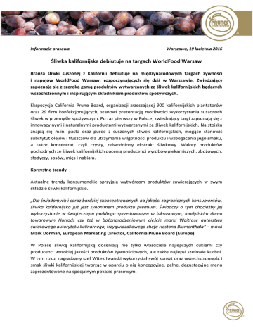 Informacja prasowa Warszawa, 19 kwietnia 2016 Śliwka kalifornijska debiutuje na targach WorldFood Warsaw Branża śliwki suszonej z Kalifornii debiutuje na międzynarodowych targach żywności i napojów WorldFood Warsaw, rozpoczynających się dziś w Warszawie. Zwiedzający zapoznają się z szeroką gamą produktów wytwarzanych ze śliwek kalifornijskich będących wszechstronnym i inspirującym składnikiem produktów spożywczych. Ekspozycja California Prune Board, organizacji zrzeszającej 900 kalifornijskich plantatorów oraz 29 firm konfekcjonujących, stanowi prezentację możliwości wykorzystania suszonych śliwek w przemyśle spożywczym. Po raz pierwszy w Polsce, zwiedzający targi zapoznają się z innowacyjnymi i naturalnymi produktami wytwarzanymi ze śliwek kalifornijskich. Na stoisku znajdą się m.in. pasta oraz puree z suszonych śliwek kalifornijskich, mogące stanowić substytut olejów i tłuszczów dla utrzymania wilgotności produktu i wzbogacenia jego smaku, a także koncentrat, czyli czysty, odwodniony ekstrakt śliwkowy. Walory produktów pochodnych ze śliwek kalifornijskich docenią producenci wyrobów piekarniczych, zbożowych, słodyczy, sosów, mięs i nabiału. Korzystne trendy Aktualne trendy konsumenckie sprzyjają wytwórcom produktów zawierających w swym składzie śliwki kalifornijskie. „Dla świadomych i coraz bardziej skoncentrowanych na jakości zagranicznych konsumentów, śliwka kalifornijska już jest synonimem produktu premium. Świadczy o tym chociażby jej wykorzystanie w świątecznym puddingu sprzedawanym w luksusowym, londyńskim domu towarowym Harrods czy też w bożonarodzeniowym cieście marki Waitrose autorstwa światowego autorytetu kulinarnego, trzygwiazdkowego chefa Hestona Blumenthala” – mówi Mark Dorman, European Marketing Director, California Prune Board (Europe). W Polsce śliwkę kalifornijską doceniają nie tylko właściciele najlepszych cukierni czy producenci wysokiej jakości produktów żywnościowych, ale także najlepsi szefowie kuchni. W tym roku, nagradzany szef Witek Iwański wykorzystał swój kunszt oraz wszechstronność i smak śliwki kalifornijskiej tworząc w oparciu o nią koncepcyjne, pełne, degustacyjne menu zaprezentowane na specjalnym pokazie prasowym. Naturalnie odżywcze Śliwka kalifornijska idealnie wpisuje się także w trend zdrowego odżywiania. Branża suszonych śliwek z Kalifornii nieustannie inwestuje w rozwój badań naukowych, których celem jest poznanie kolejnych walorów odżywczych owoców. Obecnie suszona śliwka jest jedynym suszonym owocem certyfikowanym oficjalnym oświadczeniem Europejskiego Urzędu ds. Bezpieczeństwa Żywności (European Food Safety Authority), mówiącego o tym, że spożywanie 100g tych owoców, jako elementu zdrowej, zbilansowanej diety oraz zdrowego trybu życia, pomaga zachować prawidłowe funkcjonowanie jelit. „Kolejne obiecujące wyniki badań nad korzystnym wpływem suszonych śliwek na zdrowie kości płyną z amerykańskich uniwersytetów. To dobre wiadomości dla producentów żywności, bo jak wynika z naszych obserwacji, współcześni konsumenci podchodzą do wyboru produktów w sposób funkcjonalny. Szukają produktów, które nie tylko świetnie smakują i są wysokiej jakości, ale także posiadają składniki odżywcze o korzystnym wpływie na ich organizm. Śliwka kalifornijska, będąca poręczną i dostępną przez cały rok przekąską, idealnie więc odpowiada na potrzeby dzisiejszych konsumentów” – mówi Esther Ritson-Elliott, European Marketing Manager, California Prune Board (Europe). Polskie perspektywy California Prune Board zauważa potencjał polskiego rynku i od blisko 2 lat prowadzi aktywne działania marketingowe skierowane do profesjonalistów z branży spożywczej oraz konsumentów, zwiększając świadomość na temat najwyższej jakości, kulinarnej wszechstronności oraz walorów zdrowotnych śliwek suszonych z Kalifornii. „Kalifornijczycy odbierają polski rynek jako obiecujący, co potwierdzają wyniki prowadzonych przez nas badań. Co najważniejsze, polskim konsumentom smakują nasze śliwki, a ich kalifornijskie pochodzenie jest dodatkowym atutem. Pozytywne perspektywy wyłaniają się również z badania przeprowadzonego przez firmę Rose Reserach, którego wyniki wskazują, że 30 proc. respondentów zamierza kupować więcej suszonych śliwek w przyszłości” – dodaje Mark Dorman. California Prune Board zaprasza osoby zainteresowane gamą produktów ze śliwek kalifornijskich oraz rozmową z branżowymi ekspertami do odwiedzania stoiska nr F16 podczas targów WorldFood Warsaw, odbywających się w dniach 19-21 kwietnia w Warszawie, na terenie Expo XXI. *** Kontakt dla prasy: Michał Kopera | [email protected] Kamila Wardyn | [email protected] Social media: Facebook: facebook.com/sliwkikalifornijskie Instagram: instagram.com/sliwki_kalifornijskie Pinterest: pinterest.com/sliwkikali/ Biuro Prasowe: http://sliwkikalifornijskie.prowly.com/ O California Prune Board California Prune Board działa pod nadzorem Kalifornijskiego Departamentu Żywności i Rolnictwa i reprezentuje branżę suszonych śliwek z Kalifornii, składającą się z 900 plantatorów śliwek oraz 29 firm konfekcjonujących. Kalifornia jest największym producentem suszonych śliwek na świecie, słynących z najwyższej jakości osiąganej dzięki regionalnym, rygorystycznym technikom zbierania owoców oraz oceny i kontroli. Produkt premium dostarczany jest do 72 krajów na całym świecie, region zapewnia 43 procent światowych dostaw suszonych śliwek oraz 99 procent dostaw w Stanach Zjednoczonych. Więcej informacji, przepisów i video: www.californiaprunes.pl. Śledź California Prune Board na http://www.facebook.com/sliwkikalifornijskie oraz https://instagram.com/sliwki_kalifornijskie/ a także https://www.pinterest.com/sliwkikali/ „Przyjaciółka z Kalifornii” – informacje dotyczące kampanii „Przyjaciółka z Kali