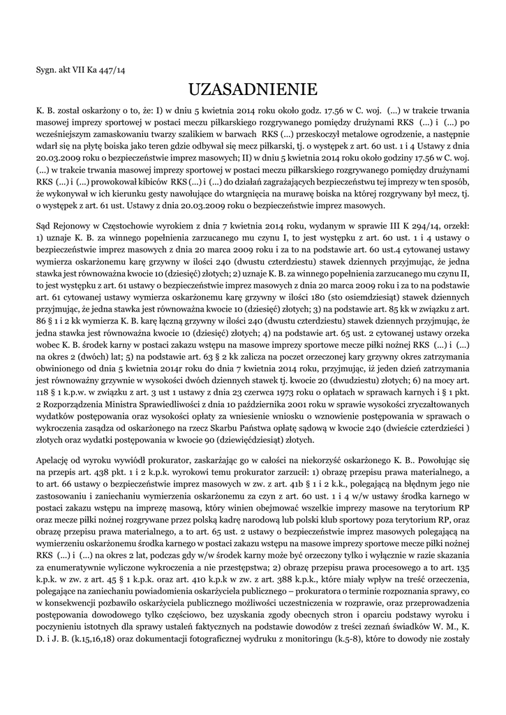 Sygn. akt VII Ka 447/14 UZASADNIENIE K. B. został oskarżony o to, że: I) w dniu 5 kwietnia 2014 roku około godz. 17.56 w C. woj. (...) w trakcie trwania masowej imprezy sportowej w postaci meczu piłkarskiego rozgrywanego pomiędzy drużynami RKS (...) i (...) po wcześniejszym zamaskowaniu twarzy szalikiem w barwach RKS (...) przeskoczył metalowe ogrodzenie, a następnie wdarł się na płytę boiska jako teren gdzie odbywał się mecz piłkarski, tj. o występek z art. 60 ust. 1 i 4 Ustawy z dnia 20.03.2009 roku o bezpieczeństwie imprez masowych; II) w dniu 5 kwietnia 2014 roku około godziny 17.56 w C. woj. (...) w trakcie trwania masowej imprezy sportowej w postaci meczu piłkarskiego rozgrywanego pomiędzy drużynami RKS (...) i (...) prowokował kibiców RKS (...) i (...) do działań zagrażających bezpieczeństwu tej imprezy w ten sposób, że wykonywał w ich kierunku gesty nawołujące do wtargnięcia na murawę boiska na której rozgrywany był mecz, tj. o występek z art. 61 ust. Ustawy z dnia 20.03.2009 roku o bezpieczeństwie imprez masowych. Sąd Rejonowy w Częstochowie wyrokiem z dnia 7 kwietnia 2014 roku, wydanym w sprawie III K 294/14, orzekł: 1) uznaje K. B. za winnego popełnienia zarzucanego mu czynu I, to jest występku z art. 60 ust. 1 i 4 ustawy o bezpieczeństwie imprez masowych z dnia 20 marca 2009 roku i za to na podstawie art. 60 ust.4 cytowanej ustawy wymierza oskarżonemu karę grzywny w ilości 240 (dwustu czterdziestu) stawek dziennych przyjmując, że jedna stawka jest równoważna kwocie 10 (dziesięć) złotych; 2) uznaje K. B. za winnego popełnienia zarzucanego mu czynu II, to jest występku z art. 61 ustawy o bezpieczeństwie imprez masowych z dnia 20 marca 2009 roku i za to na podstawie art. 61 cytowanej ustawy wymierza oskarżonemu karę grzywny w ilości 180 (sto osiemdziesiąt) stawek dziennych przyjmując, że jedna stawka jest równoważna kwocie 10 (dziesięć) złotych; 3) na podstawie art. 85 kk w związku z art. 86 § 1 i 2 kk wymierza K. B. karę łączną grzywny w ilości 240 (dwustu czterdziestu) stawek dziennych przyjmując, że jedna stawka jest równoważna kwocie 10 (dziesięć) złotych; 4) na podstawie art. 65 ust. 2 cytowanej ustawy orzeka wobec K. B. środek karny w postaci zakazu wstępu na masowe imprezy sportowe mecze piłki nożnej RKS (...) i (...) na okres 2 (dwóch) lat; 5) na podstawie art. 63 § 2 kk zalicza na poczet orzeczonej kary grzywny okres zatrzymania obwinionego od dnia 5 kwietnia 2014r roku do dnia 7 kwietnia 2014 roku, przyjmując, iż jeden dzień zatrzymania jest równoważny grzywnie w wysokości dwóch dziennych stawek tj. kwocie 20 (dwudziestu) złotych; 6) na mocy art. 118 § 1 k.p.w. w związku z art. 3 ust 1 ustawy z dnia 23 czerwca 1973 roku o opłatach w sprawach karnych i § 1 pkt. 2 Rozporządzenia Ministra Sprawiedliwości z dnia 10 października 2001 roku w sprawie wysokości zryczałtowanych wydatków postępowania oraz wysokości opłaty za wniesienie wniosku o wznowienie postępowania w sprawach o wykroczenia zasądza od oskarżonego na rzecz Skarbu Państwa opłatę sądową w kwocie 240 (dwieście czterdzieści ) złotych oraz wydatki postępowania w kwocie 90 (dziewięćdziesiąt) złotych. Apelację od wyroku wywiódł prokurator, zaskarżając go w całości na niekorzyść oskarżonego K. B.. Powołując się na przepis art. 438 pkt. 1 i 2 k.p.k. wyrokowi temu prokurator zarzucił: 1) obrazę przepisu prawa materialnego, a to art. 66 ustawy o bezpieczeństwie imprez masowych w zw. z art. 41b § 1 i 2 k.k., polegającą na błędnym jego nie zastosowaniu i zaniechaniu wymierzenia oskarżonemu za czyn z art. 60 ust. 1 i 4 w/w ustawy środka karnego w postaci zakazu wstępu na imprezę masową, który winien obejmować wszelkie imprezy masowe na terytorium RP oraz mecze piłki nożnej rozgrywane przez polską kadrę narodową lub polski klub sportowy poza terytorium RP, oraz obrazę przepisu prawa materialnego, a to art. 65 ust. 2 ustawy o bezpieczeństwie imprez masowych polegającą na wymierzeniu oskarżonemu środka karnego w postaci zakazu wstępu na masowe imprezy sportowe mecze piłki nożnej RKS (...) i (...) na okres 2 lat, podczas gdy w/w środek karny może być orzeczony tylko i wyłącznie w razie skazania za enumeratywnie wyliczone wykroczenia a nie przestępstwa; 2) obrazę przepisu prawa procesowego a to art. 135 k.p.k. w zw. z art. 45 § 1 k.p.k. oraz art. 410 k.p.k w zw. z art. 388 k.p.k., które miały wpływ na treść orzeczenia, polegające na zaniechaniu powiadomienia oskarżyciela publicznego – prokuratora o terminie rozpoznania sprawy, co w konsekwencji pozbawiło oskarżyciela publicznego możliwości uczestniczenia w rozprawie, oraz przeprowadzenia postępowania dowodowego tylko częściowo, bez uzyskania zgody obecnych stron i oparciu podstawy wyroku i poczynieniu istotnych dla sprawy ustaleń faktycznych na podstawie dowodów z treści zeznań świadków W. M., K. D. i J. B. (k.15,16,18) oraz dokumentacji fotograficznej wydruku z monitoringu (k.5-8), które to dowody nie zostały przeprowadzone, ani ujawnione w toku rozprawy głównej; 3) obrazę przepisu prawa procesowego, która miała wpływ na treść orzeczenia, a to art. 118 § 1 k.p.w. w zw. z art. 3 ust. 1 ustawy o opłatach w sprawach karnych i § 1 pkt 2 Rozporządzenia Ministra Sprawiedliwości z dnia 10 października 2001 roku w sprawie wysokości zryczałtowanych wydatków postępowania oraz wysokości opłaty za wniesienie wniosku o wznowienie postępowania w sprawach o wykroczenia, polegającą na błędnym zastosowaniu w/w przepisów przy obliczeniu wysokości i zasądzeniu opłat sądowych oraz wydatków postępowania, podczas gdy podstawą w/w rozstrzygnięcia winny być przepisy Działu XIV k.p.k. W konkluzji prokurator wniósł o uchylenie zaskarżonego wyroku i przekazanie sprawy do ponownego rozpoznania Sądowi I instancji. Sąd Okręgowy zważył, co następuje. Wniesiona w spr