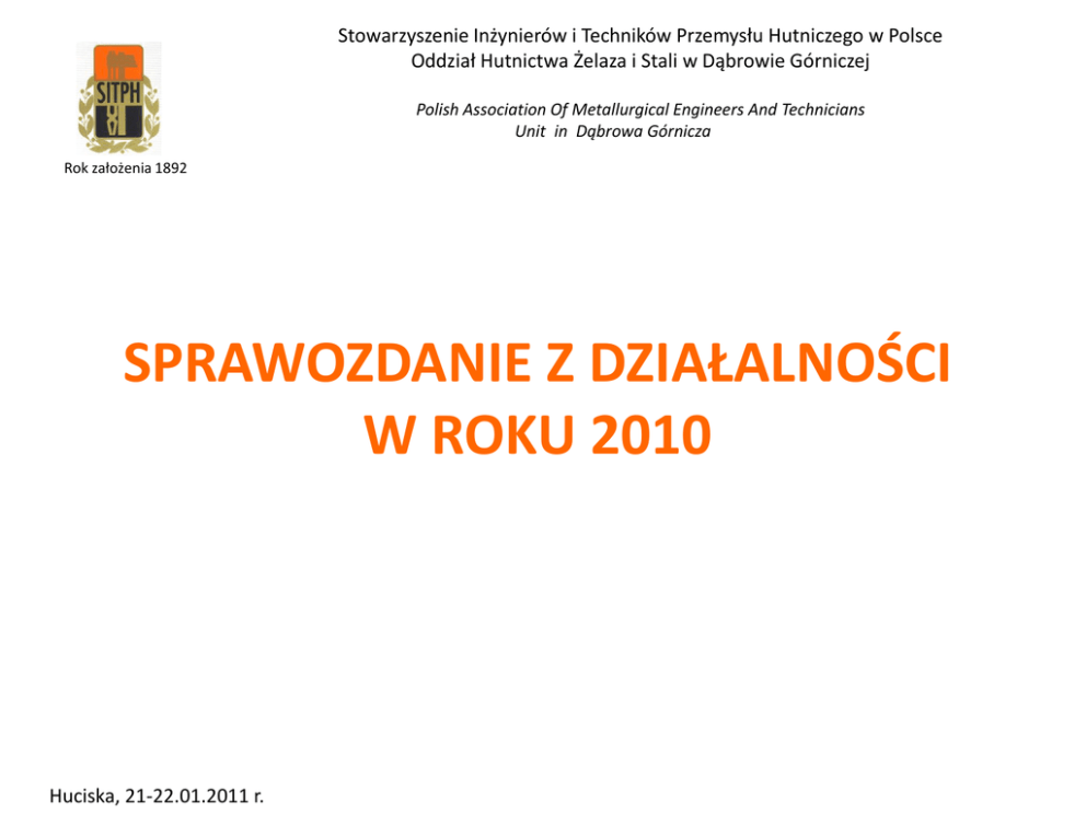 Stowarzyszenie Inżynierów i Techników Przemysłu Hutniczego w Polsce Oddział Hutnictwa Żelaza i Stali w Dąbrowie Górniczej Polish Association Of Metallurgical Engineers And Technicians Unit in Dąbrowa Górnicza Rok założenia 1892 SPRAWOZDANIE Z DZIAŁALNOŚCI W ROKU 2010 Huciska, 21-22.01.2011 r. Stowarzyszenie Inżynierów i Techników Przemysłu Hutniczego w Polsce Oddział Hutnictwa Żelaza i Stali w Dąbrowie Górniczej Polish Association Of Metallurgical Engineers And Technicians Unit in Dąbrowa Górnicza Rok założenia 1892 Wstęp Rok 2010 był kolejnym rokiem IX kadencji władz Oddziału. Biorąc pod uwagę całokształt to w 2010 roku kontynuowano przyjęte w 2009 roku kierunki działalności. Pierwszy z nich to kontynuowanie współpracy z innymi organizacjami trzeciego sektora szczególnie w zakresie zdobywania wiedzy na temat funduszy unijnych i trybu ich pozyskiwania oraz działalności pożytku publicznego, drugi to kontynuowanie dotychczasowych form działalności, a trzeci to szeroka dyskusja o zmianach przyszłej formy, charakteru i struktury stowarzyszenia. Huciska 21.01.2011 r. Stowarzyszenie Inżynierów i Techników Przemysłu Hutniczego w Polsce Oddział Hutnictwa Żelaza i Stali w Dąbrowie Górniczej Polish Association Of Metallurgical Engineers And Technicians Unit in Dąbrowa Górnicza Rok założenia 1892 Stan organizacyjny Skład Zarządu Oddziału: Prezes Zarządu Oddziału V-ce Prezes ds. naukowych V-ce Prezes ds. organizacyjnych V-ce Prezes ds. kontaktów zewnętrznych Sekretarz Zarządu Oddziału Skarbnik Zarządu Oddziału - kol. Bogdan Mikołajczyk - kol. Joanna Więcek - kol. Zygmunt Imielski, - kol. Jarosław Kuna, - kol. Andrzej Bigajczyk, - kol. Zofia Nowak, Członkowie Zarządu - kol. Zbigniew Kalamat, - kol. Antoni Bator, - kol. Ryszarda Mączyoska, - kol. Andrzej Wolak, - kol. Zdzisław Śladowski Huciska 21-22.01.2011 r. Stowarzyszenie Inżynierów i Techników Przemysłu Hutniczego w Polsce Oddział Hutnictwa Żelaza i Stali w Dąbrowie Górniczej Polish Association Of Metallurgical Engineers And Technicians Unit in Dąbrowa Górnicza Rok założenia 1892 Stan organizacyjny Skład Komisji Rewizyjnej: Przewodniczący - kol. Józef Jagielski, Członkowie - kol. Jacek Bartyzel, - kol. Artur Kijowski. Huciska, 21-22.01.2011 r. Stowarzyszenie Inżynierów i Techników Przemysłu Hutniczego w Polsce Oddział Hutnictwa Żelaza i Stali w Dąbrowie Górniczej Polish Association Of Metallurgical Engineers And Technicians Unit in Dąbrowa Górnicza Rok założenia 1892 Stan organizacyjny Koła Oddziału: 1.Koło Spiekalników i Wielkopiecowników, 2.Koło Stalowników, 3.Koło Walcowników, 4.Koło Energetyków, 5.Koło przy ArcelorMittal Service Group Sp. z o.o. (koło Mechaników) 6.Koło Organizacji i Zarządzania, 7.Koło przy Przedsiębiorstwie Usług Kolejowych „Kolprem” Sp. z o.o., 8.Koło przy Hucie Bankowa Sp. z o.o., 9.Koło przy Przedsiębiorstwie Przerobu i Obrotu Złomem Metali „HK Cutiron” Sp. z o.o., 10.Koło przy HK „ EKO-GRYS” Sp. z o.o., 11.Koło przy ArcelorMittal Poland S.A. Oddział w Sosnowcu, 12. Koło Seniorów Huciska, 21-22.01.2011 r. Stowarzyszenie Inżynierów i Techników Przemysłu Hutniczego w Polsce Oddział Hutnictwa Żelaza i Stali w Dąbrowie Górniczej Polish Association Of Metallurgical Engineers And Technicians Unit in Dąbrowa Górnicza Rok założenia 1892 Stan organizacyjny Komisje, zespoły i agendy: - Komisja ds. Konkursów, Nagród i Wyróżnieo /kontynuacja działalności/, której przewodniczy Kol. Mirosław Podolszyoski, - Zespół Organizacyjny /kontynuacja działalności/, któremu przewodniczy Kol. Andrzej Bigajczyk; - Rada Programowa dla merytorycznego i organizacyjnego przygotowania seminariów, /kontynuacja działalności/ któremu przewodniczy kol. Joanna Więcek - Zespół ds. Kontroli Funkcjonowania Komisji Kwalifikacyjnych /kontynuacja działalności/, któremu przewodniczy aktualny przewodniczący Komisji Rewizyjnej Oddziału – aktualnie Kol. Józef Jagielski; - Cztery Komisje Kwalifikacyjne uprawnione do przeprowadzania egzaminów sprawdzających kwalifikacje osób eksploatujących urządzenia elektroenergetyczne /kontynuacja działalności/ Przewodniczącymi Komisji byli: Komisji nr 469 Kol. Stanisław Bernat Komisji nr 470 Kol. Jan Śreniawski Komisji nr 471 Kol. Leszek Lewandowski Komisji nr 626 Kol. Jacek Czarnocki Liczba członków na koniec 2010 roku wynosi 161 osób co oznacza zmniejszenie o 10 członków w stosunku do 2009 roku. Huciska, 21-22.01.2011 r. Stowarzyszenie Inżynierów i Techników Przemysłu Hutniczego w Polsce Oddział Hutnictwa Żelaza i Stali w Dąbrowie Górniczej Polish Association Of Metallurgical Engineers And Technicians Unit in Dąbrowa Górnicza Rok założenia 1892 Podstawowe kierunki działalności. W 2010 roku do najważniejszych należy zaliczyd działania mające na celu: - kontynuowanie przedsięwzięd dotychczas organizowanych w Oddziale; - kontynuowanie promowania wiedzy na temat struktur organizacyjnych i rozwiązao prawnych w obszarze polityki społecznej i regionalnej oraz w zakresie techniki w Unii Europejskiej. Inicjowanie działao mających na celu opracowanie projektów finansowanych z funduszy krajowych i unijnych; - współdziałanie z organizacjami pozarządowymi z terenu Dąbrowy Górniczej ; - współpraca z ČHS, innymi ogniwami SITPH oraz innymi stowarzyszeniami ; Huciska,21-22.01.2011 r. Stowarzyszenie Inżynierów i Techników Przemysłu Hutniczego w Polsce Oddział Hutnictwa Żelaza i Stali w Dąbrowie Górniczej Polish Association Of Metallurgical Engineers And Technicians Unit in Dąbrowa Górnicza Rok założenia 1892 Podstawowe kierunki działalności c.d. - bieżące dostosowanie struktury organizacyjnej do zmian organizacyjnych w zakładach objętych działalnością Oddziału; - opracowanie oferty na prowadzenie szkoleo i organizowanie seminariów - dyskusja na temat zmian charakteru i struktury stowarzyszenia.