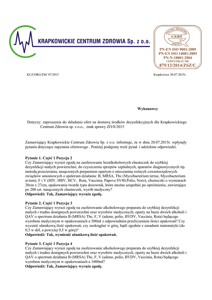 KCZ/ORG/ZM/ 07/2015 Krapkowice 30.07.2015r. Wykonawcy Dotyczy: zaproszenia do składania ofert na dostawę środków dezynfekcyjnych dla Krapkowickiego Centrum Zdrowia sp. z o.o., znak sprawy ZO/8/2015 Zamawiający Krapkowickie Centrum Zdrowia Sp. z o.o. informuje, że w dniu 28.07.2015r. wpłynęły pytania dotyczące zapytania ofertowego . Poniżej podajemy treść pytań i udzielone odpowiedzi. Pytanie 1. Część 1 Pozycja 2 Czy Zamawiający wyrazi zgodę na zaoferowanie bezalkoholowych chusteczek do szybkiej dezynfekcji małych powierzchni, do czyszczenia sprzętów szpitalnych, aparatów diagnostycznych itp. metodą przecierania, nasączonych preparatem opartym o mieszaninę rożnych czwartorzędowych związków amoniowych o spektrum działania: B, MRSA, Tbc (Mycobacterium terrae, Mycobacterium avium), F i V (HIV, HBV, HCV, Rota, Vaccinia, Papova SV40,Polio, Noro), chusteczki o wymiarach 20cm x 27cm, opakowania twarde typu dozownik, które można uzupełnić po opróżnieniu, zawierające po 200 szt. nasączonych chusteczek, wyrób medyczny? Odpowiedź: Tak, Zamawiający wyraża zgodę. Pytanie 2. Część 1 Pozycja 3 Czy Zamawiający wyrazi zgodę na zaoferowanie alkoholowego preparatu do szybkiej dezynfekcji małych i trudno dostępnych powierzchni oraz wyrobów medycznych, oparty na bazie dwóch alkoholi i QAV o spectrum działania B (MRSA) Tbc, F, V (adeno, polio, BVDV, Vaccinia, Rota) będącego wyrobem medycznym w opakowaniach a 500ml z odpowiednim przeliczeniem ilości opakowań? Czy wycenić ułamkową ilość opakowań, czy zaokrąglać w górę, bądź zgodnie z zasadami matematyki (do 0,5 w dół, a powyżej 0,5 w górę)? Odpowiedź: Tak, wymienić ułamkową ilość opakowań. Pytanie 3. Część 1 Pozycja 4 Czy Zamawiający wyrazi zgodę na zaoferowanie alkoholowego preparatu do szybkiej dezynfekcji małych i trudno dostępnych powierzchni oraz wyrobów medycznych, oparty na bazie dwóch alkoholi i QAV o spectrum działania B (MRSA) Tbc, F, V (adeno, polio, BVDV, Vaccinia, Rota) będącego wyrobem medycznym w opakowaniach a 1000ml? Odpowiedź: Tak, Zamawiający wyraża zgodę. Pytanie 4. Część 1 Pozycja 5 Czy Zamawiający wyrazi zgodę na zaoferowanie alkoholowego preparatu do szybkiej dezynfekcji małych i trudno dostępnych powierzchni oraz wyrobów medycznych, oparty na bazie dwóch alkoholi i QAV o spectrum działania B (MRSA) Tbc, F, V (adeno, polio, BVDV, Vaccinia, Rota) będącego wyrobem medycznym w opakowaniach a 5000ml? Odpowiedź: Tak, Zamawiający wyraża zgodę. Pytanie 5. Część 1 Pozycja 6 Czy Zamawiający wyrazi zgodę na zaoferowanie alkoholowego preparatu do szybkiej dezynfekcji małych powierzchni, przedmiotów w postaci chusteczek na bazie etanolu, izopropanolu i QAV o spectrum działania B (C. Albicans, A. Niger), MRSA, Tbc (Mycobacterium terrae, Mycobacterium avium), F i V (BVDV, Vaccinia, rota) w czasie 30 sekund oraz (polio, adeno) w czasie 1 minuta, chusteczki o wymiarach 13cm x 22cm, opakowania twarde typu dozownik, które można uzupełnić po opróżnieniu, zawierające po 100 szt. nasączonych chusteczek, wyrób medyczny? Odpowiedź: Tak, Zamawiający wyraża zgodę. Pytanie 6. Część 1 Pozycja 8 Czy Zamawiający wyrazi zgodę na zaoferowanie preparatu do dezynfekcji i mycia wyrobów medycznych, posiadającego możliwość stosowania w obecności pacjentów dorosłych, dzieci i noworodków, na bazie czwartorzędowych związków amoniowych, biguanidu oraz amin, nie zawierającego aldehydów o spektrum działania: B, Tbc (Mycobacterium Terrae, Mycobacterium Avium), F, V (Rota, BVDV, Vaccinia, HIV, HBV), w czasie do 15 min., w opakowaniach 5 kg, zarejestrowanego jako wyrób medyczny? Czy do obliczeń należy przyjąć 5l = 5kg, czy też przeliczyć ilość z gęstości oferowanego preparatu? Odpowiedź: Tak, Zamawiający wyraża zgodę. Pytanie 7. Część 1 Pozycja 10 Czy Zamawiający wyrazi zgodę na zaoferowanie preparatu w postaci tabletek na bazie aktywnego chloru do mycia i dezynfekcji powierzchni będącego produktem biobójczym w opakowaniach a 1kg – 300 tabletek z odpowiednim przeliczeniem ilości opakowań, spełniających pozostałe wymagania SIWZ? Odpowiedź: Tak, pod warunkiem zachowania pozostałych warunków SIWS. Pytanie 8. Część 2 Pozycja 2 Czy Zamawiający wyrazi zgodę na zaoferowanie bezbarwnego preparatu do dezynfekcji i odtłuszczania skóry, do dezynfekcji skóry przed zabiegami operacyjnymi, cewnikowaniem żył, pobieraniem krwi oraz płynów ustrojowych, zastrzykami, punkcjami, biopsjami, opatrywaniem ran, zdejmowaniem szwów, do higienicznej dezynfekcji rąk, zapobiega grzybicom skóry, gotowego do użycia, zawierającego 2-propanol, 1-propanol i 2-difenylolu, z dodatkiem nadtlenku wodoru, bez zawartości etanolu, chlorheksydyny, jodu i jego związków, o spektrum działania: B (w tym MRSA), F, Tbc (w tym Mycobacterium tuberculosis), V (HIV, HBV, Rota, Adeno, Herpes Simplex), zarejestrowanego jako produkt leczniczy, w opakowaniu a 1l? Odpowiedź: Tak, Zamawiający wyraża zgodę. Pytanie 9. Część 2 Pozycja 3 Czy Zamawiający wyrazi zgodę na zaoferowanie bezbarwnego preparatu do dezynfekcji i odtłuszczania skóry, do dezynfekcji skóry przed zabiegami operacyjnymi, cewnikowaniem żył, pobieraniem krwi oraz płynów ustrojowych, zastrzykami, punkcjami, biopsjami, opatrywaniem ran, zdejmowaniem szwów, do higienicznej dezynfekcji rąk, zapobiega grzybicom skóry, gotowego do użycia, zawierającego 2-propanol, 1-propanol i 2-difenylolu, z dodatkiem nadtlenku wodoru, bez zawartości etanolu, chlorheksydyny, jodu i jego związków, o spektrum działania: B (w tym MRSA), F, Tbc (w tym Mycobacterium tuberculosis), V (HIV, HBV, Rota, Adeno, Herpes Simplex), zarejestrowanego jako produkt leczniczy, w opakowaniu a 250ml z atomizerem? Odpowiedź: Tak, Zamawiający wyraża zgodę. Pytanie 10. Część 2 Pozycja 4 Czy Zamawiający wyrazi zgodę na zaoferowanie bezbarwnego preparatu do dezynfekcji i odtłuszczani