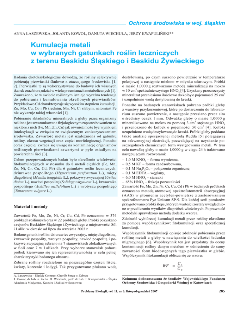 Ochrona środowiska w woj. śląskim ANNA ŁASZEWSKA, JOLANTA KOWOL, DANUTA WIECHUŁA, JERZY KWAPULIŃSKI** Kumulacja metali w wybranych gatunkach roślin leczniczych z terenu Beskidu Śląskiego i Beskidu Żywieckiego Badania ekotoksykologiczne dowodzą, że rośliny selektywnie pobierają pierwiastki śladowe z otaczającego środowiska [1, 2]. Pierwiastki te są wykorzystywane do budowy ich własnych tkanek oraz biorą udział w wielu przemianach metabolicznych [1]. Zauważono, że w świecie roślinnym istnieje wyraźna tendencja do pobierania i kumulowania określonych pierwiastków. Przykładowo Cd charakteryzuje się wysokim stopniem kumulacji, Zn, Mo, Cu, Co i Pb średnim, Mn, Ni, Cr słabym, natomiast Fe nie wykazuje takiej własności [1]. Pobieranie składników mineralnych z gleby przez organizmy roślinne jest uwarunkowane fizjologicznym zapotrzebowaniem na niektóre z nich (Fe, Mn, Zn, Cu) jak również może być wynikiem intoksykacji w związku ze zwiększonym zanieczyszczeniem środowiska. Zawartość metali jest uzależniona od gatunku rośliny, okresu wegetacji oraz części morfologicznej. Ponadto coraz częściej zwraca się uwagę na kontaminację organizmów roślinnych pierwiastkami zawartymi w pyle osiadłym na powierzchni liści [3]. Celem przeprowadzonych badań było określenie właściwości fitokumulacyjnych w stosunku do 8 metali ciężkich (Fe, Mn, Zn, Ni, Cr, Cu, Cd, Pb) dla 6 gatunków roślin leczniczych: dziurawca pospolitego (Hypericum perforatum L.), mięty długolistnej (Mentha longifolia L.), pokrzywy zwyczajnej (Urtica dioica L.), nawłoci pospolitej (Solidago virgaurea L.), krwawnika pospolitego (Achillea millefolium L.) i wrotyczu pospolitego (Tanacetum vulgare L.). Materiał i metody Zawartość Fe, Mn, Zn, Ni, Cr, Cu, Cd, Pb oznaczono w 374 próbkach roślinnych oraz w 22 próbkach gleby. Próbki pozyskano z rejonów Beskidów Śląskiego i Żywieckiego z miejscowości Sól i Laliki w okresie od lipca do września 2003 r. Badane gatunki roślin: dziurawiec zwyczajny, miętę długolistną, krwawnik pospolity, wrotycz pospolity, nawłoć pospolitą i pokrzywę zwyczajną zebrano na 7 stanowiskach zlokalizowanych w Soli oraz 7 w Lalikach. Przy wyborze stanowisk poboru próbek kierowano się ich reprezentatywnością w celu pełnej charakterystyki badanego obszaru. Zebrane rośliny rozdzielono na poszczególne części: liście, kwiaty, korzenie i łodygi. Tak przygotowane płukano wodą A. Łaszewska – Śląskie Centrum Chorób Serca w Zabrzu J. Kowol, dr hab. n. techn. D. Wiechuła, prof. dr hab. J. Kwapuliński – Śląska Akademia Medyczna, Katedra i Zakład w Sosnowcu destylowaną, po czym suszono powietrznie w temperaturze pokojowej a następnie mielono w młynku udarowym. Próbki o masie 1,0000 g roztwarzano metodą mineralizacji na mokro w 10 cm3 spektralnie czystego HNO3 [4]. Uzyskany przezroczysty mineralizat przeniesiono ilościowo do kolby o pojemności 25 cm3 i uzupełniono wodą destylowaną do kreski. Ponadto na badanych stanowiskach pobrano próbki gleby z warstwy przykorzeniowej, które po dostarczeniu do laboratorium suszono powietrznie, a następnie przesiano przez sito o średnicy oczek 1 mm. Odważkę gleby o masie 1,0000 g 3 mineralizowano na mokro za pomocą 3 cm stężonego HNO3 i przenoszono do kolbek o pojemności 50 cm3 [4]. Kolbki uzupełniono wodą destylowaną do kreski. Próbki gleby poddano także analizie specjacyjnej metodą Rudda [5] polegającej na sekwencyjnej ekstrakcji, pozwalającej na uzyskanie poszczególnych chemicznych form występowania metali. W tym celu naważkę gleby o masie 1,0000 g w ciągu 24 h traktowano następującymi roztworami: – 1,0 M KNO3 – forma wymienna, – 0,5 M KF – forma zaadsorbowana, – 0,1 M Na4P2O7 – połączenia organiczne, – 0,1 M EDTA – węglany, – 6,0 M HNO3 – siarczki – 65% HNO3 – frakcja pozostałości Zawartość Fe, Mn, Zn, Ni, Cr, Cu, Cd i Pb w badanych próbkach oznaczano metodą atomowej spektrofotometrii absorpcyjnej (AAS) w płomieniu acetylen-powietrze z zastosowaniem spekrofotometru Pye Unicam SP-9. Dla każdej serii pomiarów przygotowano próbki ślepe, których wartości zostały uwzględnione w przeliczaniu wyników dla próbek właściwych. Poprawność metodyki sprawdzono metodą dodatku wzorca. Zdolność wybiórczej kumulacji metali przez rośliny określono za pomocą współczynników: fitokumulacji oraz specyficznej kumulacji. Współczynnik fitokumulacji opisuje zdolność pobierania przez roślinę metali z gleby w nawiązaniu do wielkości ładunku migracyjnego [6]. Współczynnik ten jest przydatny do oceny kontaminacji rośliny danym metalem w odniesieniu do sumy zawartości form biodostępnych tego pierwiastka w glebie. Współczynnik fitokumulacji oblicza się ze wzoru: Kolumna dofinansowana że środków Wojewódzkiego Funduszu Ochrony Środowiska i Gospodarki Wodnej w Katowicach Problemy Ekologii, vol. 11, nr 6, listopad-grudzień 2007 285 Tab. 1 Średnia geometryczna zawartość metali w poszczególnych częściach morfologicznych wybranych gatunków roślin leczniczych µg/g Metal liść kwiat Sól Fe Mn Zn Ni Cr Cu Cd Pb 112,27 363,41 112,52 2,63 0,23 7,46 1,92 3,41 99,32 155,49 51,34 3,31 0,23 11,56 1,56 2,58 Fe Mn Zn Ni Cr Cu Cd Pb 615,1 101,05 66,16 4,11 1,22 14,31 0,43 5,76 203,68 50,24 47,54 3,86 0,34 12,78 0,36 2,60 Fe Mn Zn Ni Cr Cu Cd Pb 164,82 267,33 48,94 7,17 0,21 9,35 0,90 4,25 81,84 155,95 40,06 4,99 0,23 9,70 1,18 2,52 Fe Mn Zn Ni Cr Cu Cd Pb 202,51 131,92 40,95 0,63 0,31 10,21 0,52 6,18 170,74 96,16 51,42 1,85 0,33 14,45 0,29 3,59 Fe Mn Zn Ni Cr Cu Cd Pb 176,51 184,98 65,96 2,02 0,30 11,98 1,71 4,60 93,88 93,59 50,87 3,82 0,23 11,97 0,97 2,68 Fe Mn Zn Ni Cr Cu Cd Pb 167,80 148,10 96,11 1,32 0,30 12,74 1,62 4,75 68,25 52,64 40,12 3,81 0,23 11,70 0,64 1,24 łodyga korzeń liść dziurawiec zwyczajny 65,45 312,71 94,08 67,07 83,36 354,61 37,46 27,62 78,81 1,38 4,38 1,71 0,23 0,23 0,23 5,10 8,93 7,37 1,53 