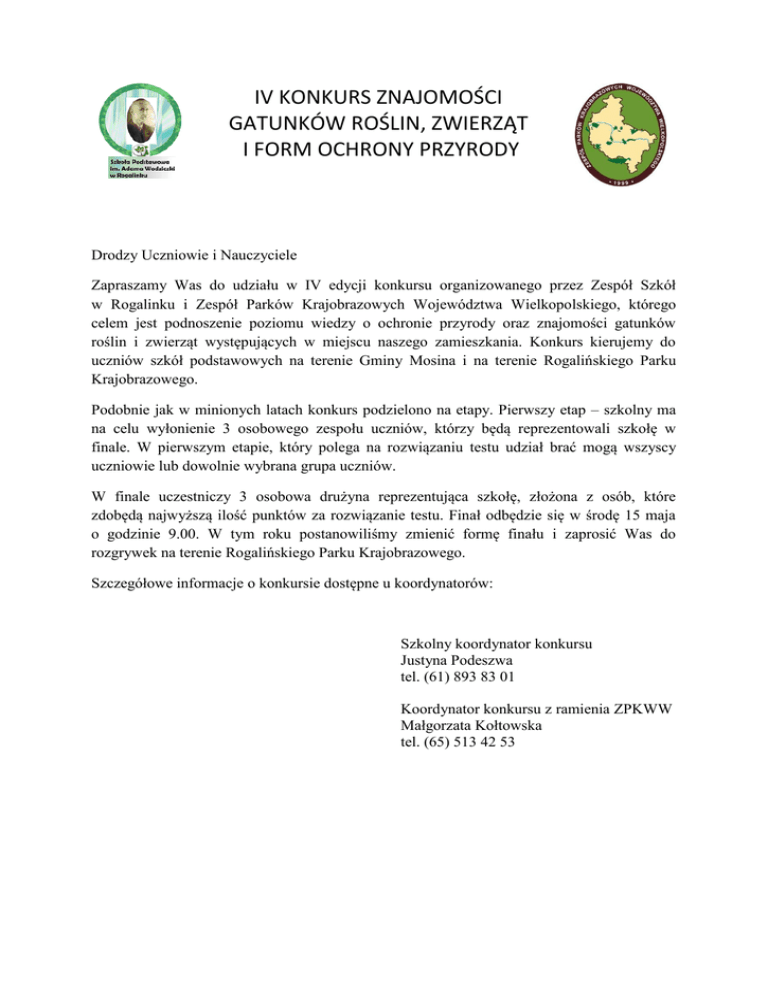 IV KONKURS ZNAJOMOŚCI GATUNKÓW ROŚLIN, ZWIERZĄT I FORM OCHRONY PRZYRODY Drodzy Uczniowie i Nauczyciele Zapraszamy Was do udziału w IV edycji konkursu organizowanego przez Zespół Szkół w Rogalinku i Zespół Parków Krajobrazowych Województwa Wielkopolskiego, którego celem jest podnoszenie poziomu wiedzy o ochronie przyrody oraz znajomości gatunków roślin i zwierząt występujących w miejscu naszego zamieszkania. Konkurs kierujemy do uczniów szkół podstawowych na terenie Gminy Mosina i na terenie Rogalińskiego Parku Krajobrazowego. Podobnie jak w minionych latach konkurs podzielono na etapy. Pierwszy etap – szkolny ma na celu wyłonienie 3 osobowego zespołu uczniów, którzy będą reprezentowali szkołę w finale. W pierwszym etapie, który polega na rozwiązaniu testu udział brać mogą wszyscy uczniowie lub dowolnie wybrana grupa uczniów. W finale uczestniczy 3 osobowa drużyna reprezentująca szkołę, złożona z osób, które zdobędą najwyższą ilość punktów za rozwiązanie testu. Finał odbędzie się w środę 15 maja o godzinie 9.00. W tym roku postanowiliśmy zmienić formę finału i zaprosić Was do rozgrywek na terenie Rogalińskiego Parku Krajobrazowego. Szczegółowe informacje o konkursie dostępne u koordynatorów: Szkolny koordynator konkursu Justyna Podeszwa tel. (61) 893 83 01 Koordynator konkursu z ramienia ZPKWW Małgorzata Kołtowska tel. (65) 513 42 53