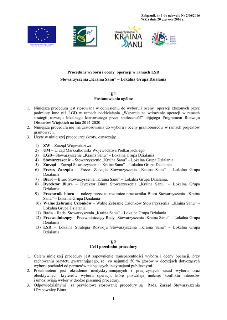 Załącznik nr 1 do uchwały Nr 2/06/2016 WZ z dnia 20 czerwca 2016 r. Europejski Fundusz Rolny na rzecz Rozwoju Obszarów Wiejskich Procedura wyboru i oceny operacji w ramach LSR Stowarzyszenia ,,Kraina Sanu” – Lokalna Grupa Działania §1 Postanowienia ogólne 1. Niniejsza procedura jest stosowana w odniesieniu do wyboru i oceny operacji złożonych przez podmioty inne niż LGD w ramach poddziałania „Wsparcie na wdrażanie operacji w ramach strategii rozwoju lokalnego kierowanego przez społeczność” objętego Programem Rozwoju Obszarów Wiejskich na lata 2014-2020 2. Niniejsza procedura nie ma zastosowania do wyboru i oceny grantobiorców w ramach projektów grantowych. 3. Użyte w niniejszej procedurze skróty, oznaczają: 1) 2) 3) 4) 5) 6) 7) 8) 9) 10) 11) 12) 13) ZW – Zarząd Województwa UM – Urząd Marszałkowski Województwa Podkarpackiego LGD– Stowarzyszenie ,,Kraina Sanu” – Lokalna Grupa Działania Stowarzyszenie – Stowarzyszenie „Kraina Sanu” – Lokalna Grupa Działania Zarząd – Zarząd Stowarzyszenia „Kraina Sanu” – Lokalna Grupa Działania Prezes Zarządu – Prezes Zarządu Stowarzyszenia „Kraina Sanu” – Lokalna Grupa Działania Biuro – Biuro Stowarzyszenia „Kraina Sanu” – Lokalna Grupa Działania, Dyrektor Biura – Dyrektor Biura Stowarzyszenia „Kraina Sanu” – Lokalna Grupa Działania Pracownik biura – należy przez to rozumieć pracownika Biura Stowarzyszenia „Kraina Sanu” – Lokalna Grupa Działania Walne Zebranie Członków – Walne Zebranie Członków Stowarzyszenia „Kraina Sanu” – Lokalna Grupa Działania Rada – Rada Stowarzyszenia „Kraina Sanu” – Lokalna Grupa Działania Przewodniczący – Przewodniczący Rady Stowarzyszenia :Kraina Sanu” – Lokalna Grupa Działania LSR – Lokalna Strategia Rozwoju Stowarzyszenia ,,Kraina Sanu” – Lokalna Grupa Działania §2 Cel i przedmiot procedury 1. Celem niniejszej procedury jest zapewnienie transparentności wyboru i oceny operacji, przy zachowaniu parytetu gwarantującego, że co najmniej 50 % głosów w decyzjach dotyczących wyboru pochodzi od partnerów niebędących instytucjami publicznymi. 2. Przedmiotem jest określenie niedyskryminujących i przejrzystych zasad wyboru oraz obiektywnych kryteriów wyboru operacji, które pozwalają uniknąć konfliktu interesów i umożliwiają wybór w drodze pisemnej procedury. 3. Odpowiedzialnymi za prawidłowe stosowanie procedury są Rada, Zarząd Stowarzyszenia i Pracownicy Biura. 1 Załącznik nr 1 do uchwały Nr 2/06/2016 WZ z dnia 20 czerwca 2016 r. Europejski Fundusz Rolny na rzecz Rozwoju Obszarów Wiejskich §3 Rozpoczęcie procedury naboru wniosków Ogłoszenie o naborze wniosków o udzielenie wsparcia na operacje realizowane przez podmioty inne niż LGD, Zarząd LGD podaje do publicznej wiadomości po uzgodnieniu terminu naboru tych wniosków z ZW. 2. W terminie co najmniej 30 dni przed planowanym terminem rozpoczęcia naboru wniosków o udzielenie wsparcia w ramach poddziałania „Wsparcie na wdrażanie operacji w ramach strategii rozwoju lokalnego kierowanego przez społeczność” Zarząd LGD występuje do ZW z wnioskiem o uzgodnienie terminu naboru wniosków (wzór nr 1) o udzielenie wsparcia na operacje realizowane przez podmioty inne niż LGD (zwanej dalej Informacją o naborze) w zakresie: 1) wzmocnienia kapitału społecznego, w tym przez podnoszenie wiedzy społeczności lokalnej w zakresie ochrony środowiska i zmian klimatycznych, także z wykorzystaniem rozwiązań innowacyjnych; 2) rozwoju przedsiębiorczości na obszarze wiejskim objętym strategią rozwoju lokalnego kierowanego przez społeczność w rozumieniu art. 2 pkt 19 rozporządzenia Parlamentu Europejskiego i Rady (UE) nr 1303/2013 z dnia 17 grudnia 2013 r. ustanawiającego wspólne przepisy dotyczące Europejskiego Funduszu Rozwoju Regionalnego, Europejskiego Funduszu Społecznego, Funduszu Spójności, Europejskiego Funduszu Rolnego na rzecz Rozwoju Obszarów Wiejskich oraz Europejskiego Funduszu Morskiego i Rybackiego oraz ustanawiającego przepisy ogólne dotyczące Europejskiego Funduszu Rozwoju Regionalnego, Europejskiego Funduszu Społecznego, Funduszu Spójności i Europejskiego Funduszu Morskiego i Rybackiego oraz uchylającego rozporządzenie Rady (WE) nr 1083/2006 (Dz. Urz. UE L 347 z 20.12.2013, str. 320), zwaną dalej „LSR”, przez: a) podejmowanie działalności gospodarczej, b) tworzenie lub rozwój inkubatorów przetwórstwa lokalnego produktów rolnych będących przedsiębiorstwami spożywczymi w rozumieniu art. 3 pkt 2 rozporządzenia (WE) nr 178/2002 Parlamentu Europejskiego i Rady z dnia 28 stycznia 2002 r. ustanawiającego ogólne zasady i wymagania prawa żywnościowego, powołującego 1) Minister Rolnictwa i Rozwoju Wsi kieruje działem administracji rządowej – rozwój wsi, na podstawie § 1 ust. 2 pkt 2 rozporządzenia Prezesa Rady Ministrów z dnia 22 września 2014 r. w sprawie szczegółowego zakresu działania Ministra Rolnictwa i Rozwoju Wsi (Dz. U. poz. 1261). Dziennik Ustaw – 2 – Poz. 1570Europejski Urząd ds. Bezpieczeństwa Żywności oraz ustanawiającego procedury w zakresie bezpieczeństwa żywności (Dz. Urz. WE L 31 z 01.02.2002, str. 1, z późn. zm.; Dz. Urz. UE Polskie wydanie specjalne, rozdz. 15, t. 6, str. 463, z późn. zm.), w których jest wykonywana działalność w zakresie produkcji, przetwarzania lub dystrybucji żywności pochodzenia roślinnego lub zwierzęcego lub wprowadzania tej żywności na rynek, przy czym podstawą działalności wykonywanej w tym inkubatorze jest przetwarzanie żywności, c) rozwijanie działalności gospodarczej, d) podnoszenie kompetencji osób realizujących operacje w zakresie określonym w lit. a–c; 3) wspierania współpracy między podmiotami wykonującymi działalność gospodarczą na obszarze wiejskim objętym LSR: a) w ramach krótkich łańcuchów dostaw w rozumieniu art. 2 ust. 1 akapit drugi lit. m rozporzą