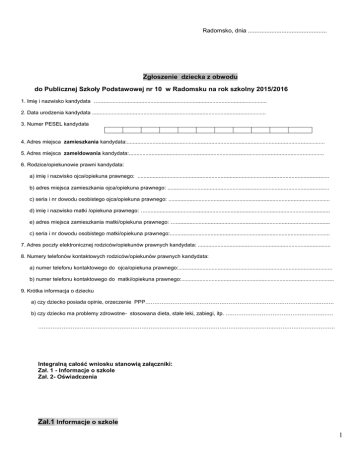 Radomsko, dnia ............................................... Zgłoszenie dziecka z obwodu do Publicznej Szkoły Podstawowej nr 10 w Radomsku na rok szkolny 2015/2016 1. Imię i nazwisko kandydata …............................................................................................................... 2. Data urodzenia kandydata ................................................................................................................... 3. Numer PESEL kandydata 4. Adres miejsca zamieszkania kandydata:................................................................................................................................... 5. Adres miejsca zameldowania kandydata:................................................................................................................................. 6. Rodzice/opiekunowie prawni kandydata: a) imię i nazwisko ojca/opiekuna prawnego: ............................................................................................................................... b) adres miejsca zamieszkania ojca/opiekuna prawnego: ........................................................................................................... c) seria i nr dowodu osobistego ojca/opiekuna prawnego: ........................................................................................................... d) imię i nazwisko matki /opiekuna prawnego: ….......................................................................................................................... e) adres miejsca zamieszkania matki/opiekuna prawnego: …...................................................................................................... c) seria i nr dowodu osobistego matki/opiekuna prawnego:.......................................................................................................... 7. Adres poczty elektronicznej rodziców/opiekunów prawnych kandydata: ........................................................................................ 8. Numery telefonów kontaktowych rodziców/opiekunów prawnych kandydata: a) numer telefonu kontaktowego do ojca/opiekuna prawnego:...................................................................................................... b) numer telefonu kontaktowego do matki/opiekuna prawnego:..................................................................................................... 9. Krótka informacja o dziecku a) czy dziecko posiada opinie, orzeczenie PPP…………………………………………………………………………..………..….…. b) czy dziecko ma problemy zdrowotne- stosowana dieta, stałe leki, zabiegi, itp. ……………………………………..……….…… ………………………………………………………………………………………………………………….……………………………. Integralną całość wniosku stanowią załączniki: Zał. 1 - Informacje o szkole Zał. 2- Oświadczenia Zał.1 Informacje o szkole 1 W szkole funkcjonuje świetlica od 8.00 – 15.45 Dziecko może korzystać ze stołówki szkolnej- obiady. Dziecko może korzystać z pomocy pedagoga, logopedy, uczestniczyć w zajęciach wyrównawcz ych i rozwijających zainteresowania. 4.Uczeń może uczęszczać na lekcje religii rzymskokatolickiej w ramach zajęć dydaktycznych realizowanych w szkole lub na lekcje etyki organizowanej w innej szkole dla wszystkich uczniów z miasta. 1. 2. 3. INNE INFORMACJE: 1. Wszystkie wymagane do rekrutacji dokumenty składa się w sekretariacie szkoły w terminie od 02 marca do 31marca 2015r. codziennie w godz. 7.30 do 15.00 2. Przedstawienie listy uczniów z nastąpi dnia 16 kwietna 2015r. 3. W razie pytań odnośnie organizacji klasy i procesu edukacji zapraszamy na indywidualne spotkanie z dyrektorem szkoły. 4. Komisja nie gwarantuje przyjęcia kandydata, jeśli zgłoszenie wpłynie po zakończeniu postępowania rekrutacyjnego Zapoznałem(łam) się z podanymi informacjami i je akceptuję, jednocześnie zobowiązuję się do przestrzegania praw i obowiązków zawartych w statucie szkoły. …...............…............................................................................................................. podpisy czytelne rodziców /opiekunów prawnych kandydata Zał.2 Oświadczenia 2 1. Oświadczam, że: a) wszystkie dane zawarte we wniosku są prawdziwe i jestem świadoma/y odpowiedzialności karnej za złożenie fałszywego oświadczenia, b) niezwłocznie powiadomię dyrektora szkoły o zmianie danych zawartych we wniosku, c) wyrażam zgodę na przetwarzanie danych osobowych zawartych w karcie zgłoszenia dziecka do Publicznej Szkoły Podstawowej nr 10 w Radomsku dla potrzeb niezbędnych do realizacji procesu rekrutacji i procesu dydaktyczno-wychowawczego (zgodnie z Ustawą z dnia 29.08.1997 r. o ochronie danych osobowych – Dz. U. z 1997 r. nr 133 poz. 883 ze zmianami); ……………………………………………………………..…….. podpisy czytelne rodziców / opiekunów dziecka 2. Oświadczam, że wyrażam zgodę na udział mojego dziecka w lekcjach religii rzymskokatolickiej w ramach realizowanych w szkole zajęć dydaktycznych. ………………………………………………………………….. podpisy czytelne rodziców/ opiekunów dziecka 3. Oświadczam, że nie wyrażam zgody na udział mojego dziecka w lekcjach religii rzymskokatolickiej wybieram naukę etyki. ………………………………………………………………….. podpisy czytelne rodziców/ opiekunów dziecka 4. Oświadczam, że wyrażam zgodę na bezterminowe umieszczanie na stronie internetowej szkoły oraz na innych portalach internetowych zdjęć mojego dziecka zarejestrowanych podczas zajęć i uroczystości szkolnych, także prac wykonanych przez nie podczas uczestnictwa w zajęciach edukacyjn o- wychowawczych w celu przekazywania informacji i promocji szkoły (zgodnie z Ustawą z 