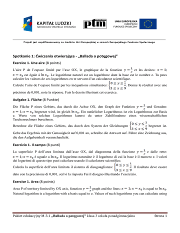 Spotkanie 1: Ćwiczenia otwierające - „Ballada o potęgowej” Exercice 1. Une aire (8 points) L’aire P de l’espace limité par l’axe OX, le graphique de la fonction et les droites: est égale à . Le logarithme naturel est un logarithme dont la base est le nombre e. Tu peux calculer les valeurs de ces logarithmes en te servant d’un calculateur scientifique. Calcule l’aire de l’espace limité par les inéquations simultanées: . Donne le résultat avec une précision de 0,001, note la réponse. Fais le dessin illustrant cet exercice. Aufgabe 1. Fläche (8 Punkte) Die Fläche P eines Gebiets, das durch die Achse OX, den Graph der Funktion und Geraden: begrenzt wird, ist gleich . Ein natürlicher Logarithmus ist ein Logarithmus zur Basis e. Werte von solchen Logarithmen kannst du unter Zuhilfenahme eines wissenschaftlichen Taschenrechners berechnen. Berechne die Fläche eines Gebiets, das durch den System der Gleichungen begrenzt ist. Gebe das Ergebnis mit der Genauigkeit auf 0,001 an, schreibe die Antwort auf. Führe eine Zeichnung aus, die den Aufgabeinhalt veranschaulicht. Esercizio 1. Il campo (8 punti) La superficie P dell’area limitata dall’asse OX, dal diagramma della funzione e dalle rette: è uguale a . Il logaritmo naturalne è il logaritmo di cui la base è il numero e. I valori dei logaritmi di questo tipo puoi calcolare usando il calcolatore scientifico. Calcola la superficie dell’area limitata il sistema di disuguaglianza: . Il risultato deve essere dato con la precisione di 0,001, scrivi la risposta Fai il disegno illustrando l’esercizio. Exercise 1. Area (8 points) Area P of territory limited by OX axis, function graph and the lines: is equal to . Natural logarithm is a logarithm with a basis equal to e. Values of such logarithms you can calculate using Pakiet edukacyjny M-3.1 „Ballada o potęgowej” klasa 3 szkoła ponadgimnazjalna Strona 1 mathematical calculator. Calculate the area of the territory limited by a system of inequalities: . Give the result with an accuracy 0,001, write the answer and draw the picture illustrating the exercise. Tarea 1. Área (8 puntos) El área P de un terreno limitado por el eje OX, por la curva representativa , así como por las líneas rectas: , equivale a . El logaritmo natural es un logaritmo cuya base constituye la cantidad e. Puedes calcular los valores de tales logaritmos disfrutando de la calculadora científica. Calcula el área P de un terreno limitado por el sistema de inecuaciones: . Presenta el resultado con la exactitud de 0,001 y nota tu respuesta. Haz un dibujo ilustrando la tarea. Zadanie 2. No to porysujmy – raz! … (6 punktów) Rozwiąż graficznie układ równań Zadanie 3. Co wyjdzie? – raz!… (5 punktów) W prostokątnym układzie współrzędnych zaznacz zbiór tych punktów płaszczyzny, których współrzędne spełniają warunek Zadanie 4. Nie taki pierwiastek straszny (3 punkty) Wykonaj działania, wynik zapisz w postaci jednego pierwiastka: Pakiet edukacyjny M-3.1 „Ballada o potęgowej” klasa 3 szkoła ponadgimnazjalna Strona 2 Rozwiązania oraz schemat „Ballada o potęgowej” oceniania zestawu dwiczeo otwierających Zadanie 1. Pole (8 punktów) Pole P obszaru ograniczonego osią OX, wykresem funkcji jest równe oraz prostymi: . Logarytm naturalny, to logarytm, którego podstawa jest liczba e. Wartości takich logarytmów możesz obliczyć korzystając z kalkulatora matematycznego. Oblicz pole obszaru ograniczonego układem nierówności: . Wynik podaj z dokładnością do 0,001, zapisz odpowiedź. Wykonaj rysunek ilustrujący zadanie. Rozwiązanie: Rozwiązanie: Rysunek do zadania: P= Pole obszaru to około 1,099 Punktacja: Czynność Etapy rozwiązania zadania A B Poprawne przetłumaczenie Wykonanie rysunku ilustrującego treść zadania Pakiet edukacyjny M-3.1 „Ballada o potęgowej” klasa 3 szkoła ponadgimnazjalna Liczba punktów 2 2 Strona 3 C Obliczenie pola z żądaną dokładnością 2 D Podanie odpowiedzi w języku obcym 2 Exercice 1. Une aire (8 points) Solution: Dessin pour l’exercice: A= L’aire de l’espace est égale à peu près à 1,099 Pointage: Activité Solution étape par étape A B C Traduction correcte Dessin illustrant le contenu de l’exercice Calcul de l’aire avec la précision demandée Nombre de points 2 2 2 D Réponse correcte en langue étrangère 2 Pakiet edukacyjny M-3.1 „Ballada o potęgowej” klasa 3 szkoła ponadgimnazjalna Strona 4 Aufgabe 1. Fläche (8 Punkte) Lösung: Zeichnung zur Aufgabe: P= Die Fläche des Gebiets beträgt ungefähr 1,099 Punktwertung: Tätigkeits nummer A B C D Etappen der Aufgabenlösung Punktezahl Richtige Übersetzung 2 Ausführung der Zeichnung, die den Aufgabeinhalt 2 veranschaulicht Berechnung der Fläche mit der verlangenden Genauigkeit 2 Antwortangabe in einer Fremdsprache 2 Pakiet edukacyjny M-3.1 „Ballada o potęgowej” klasa 3 szkoła ponadgimnazjalna Strona 5 Esercizio 1. Il campo (8 punti) Soluzione: Disegno per l’esercizio: P= La superficie dell’area fa circa 1,099 Punteggio: Numero di punti 2 Attività Tappe della soluzione dell’esercizio A C Traduzione corretta Realizzazione del disegno illustrando il contenuto 2 dell’esercizio Calcolo della superficie con la precisione dovuta 2 D Risposta nella lingua straniera B 2 Pakiet edukacyjny M-3.1 „Ballada o potęgowej” klasa 3 szkoła ponadgimnazjalna Strona 6 Tarea 1. Área (8 puntos) Solución: Dibujo para la tarea: P= El área del terreno es cerca 1,099 Puntuación: Número de la actividad A B C D Etapas de la solución de la tarea Traducción correcta Realización del dibujo ilustrando el contenido de la tarea Cálculo del área con la exactitud exigida Formulación de la respuesta en lengua extranjera Pakiet edukacyjny M-3.1 „Ballada o potęgowej” klasa 3 szkoła ponadgimnazjalna Cantidad de puntos 2 2 2 2 Strona 7 Exercise 1. Area (8 points) Solution: Picture to exercise: P= Area of this territory is about 1,099. Points: